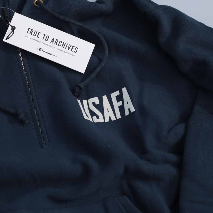 アメリカ合衆国の空軍士官学校(United States Air Force Academy)の頭文字が胸元に入ったハーフジップフーディ