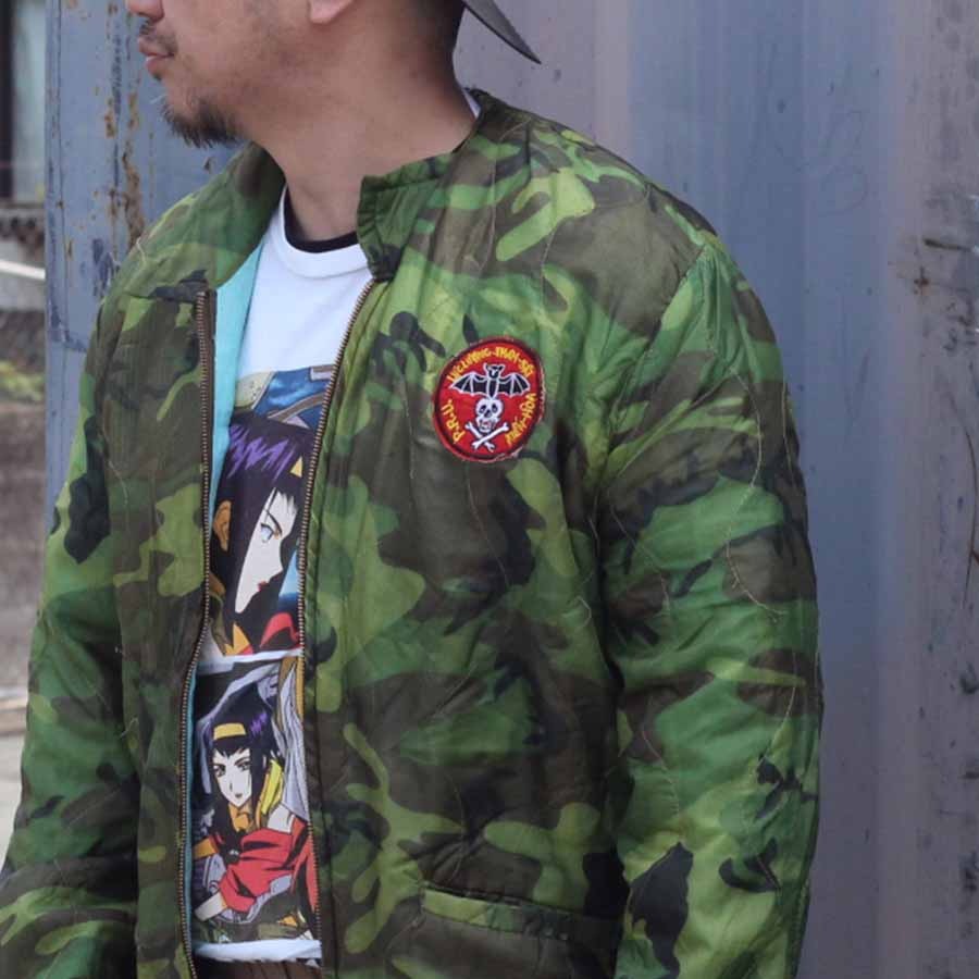 チープな生地感に滲んだようなカモ柄、コウモリ×スカルの刺繍ワッペン、そして裏地はビビッドなターコイズブルー。