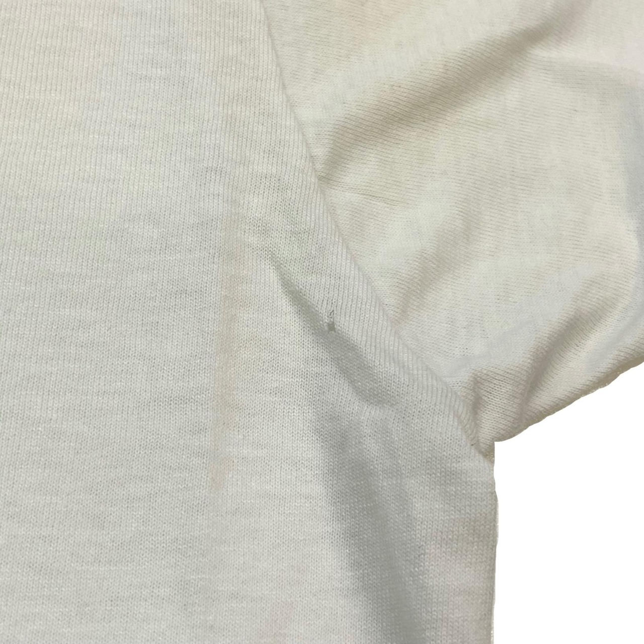 後身頃左肩部分、右脇部分穴有り。タグカット。黄ばみ有り。