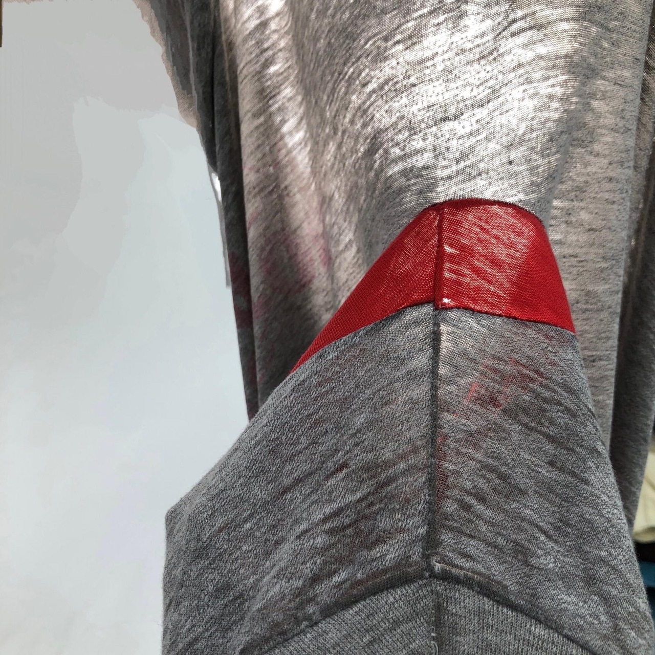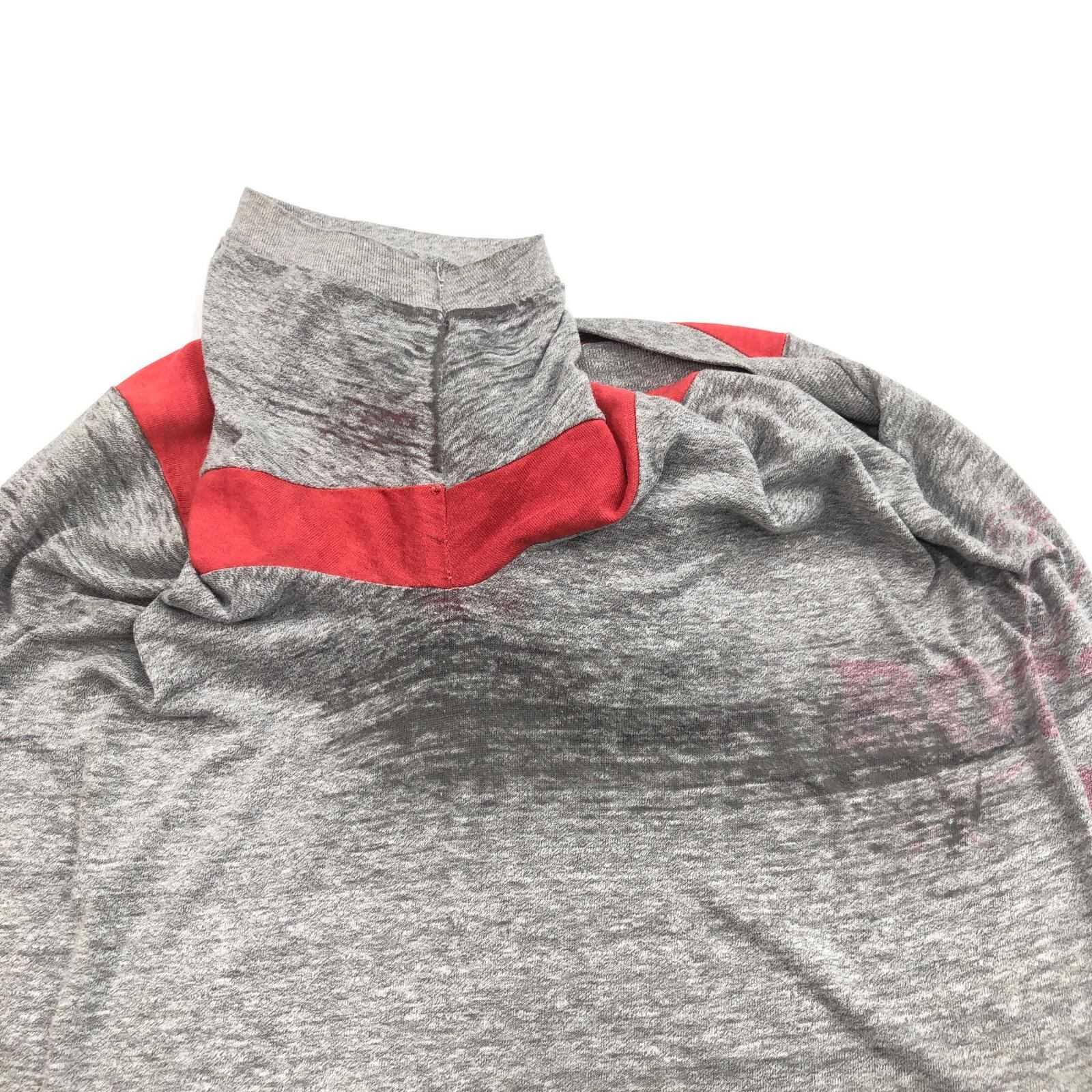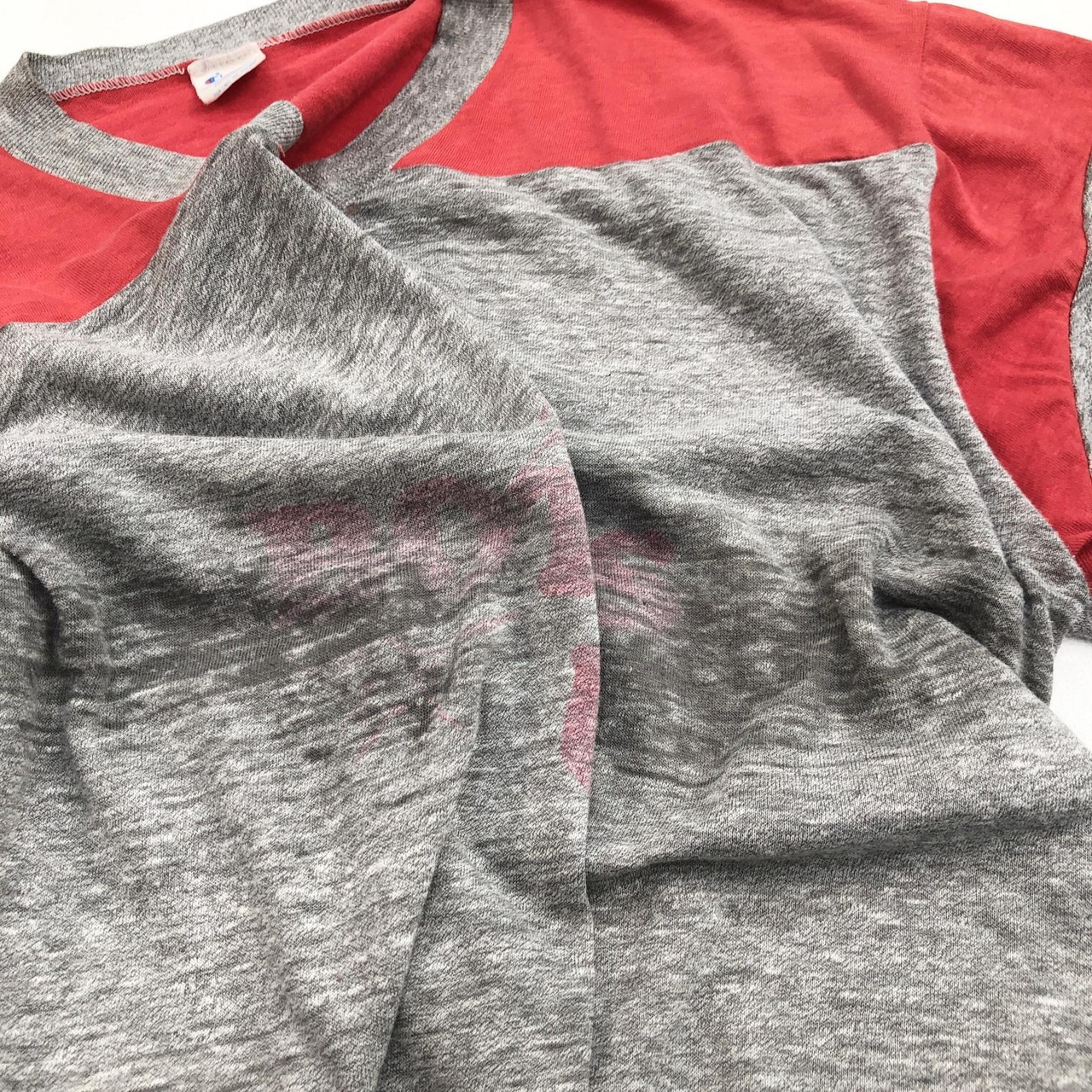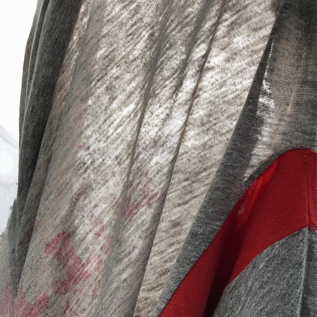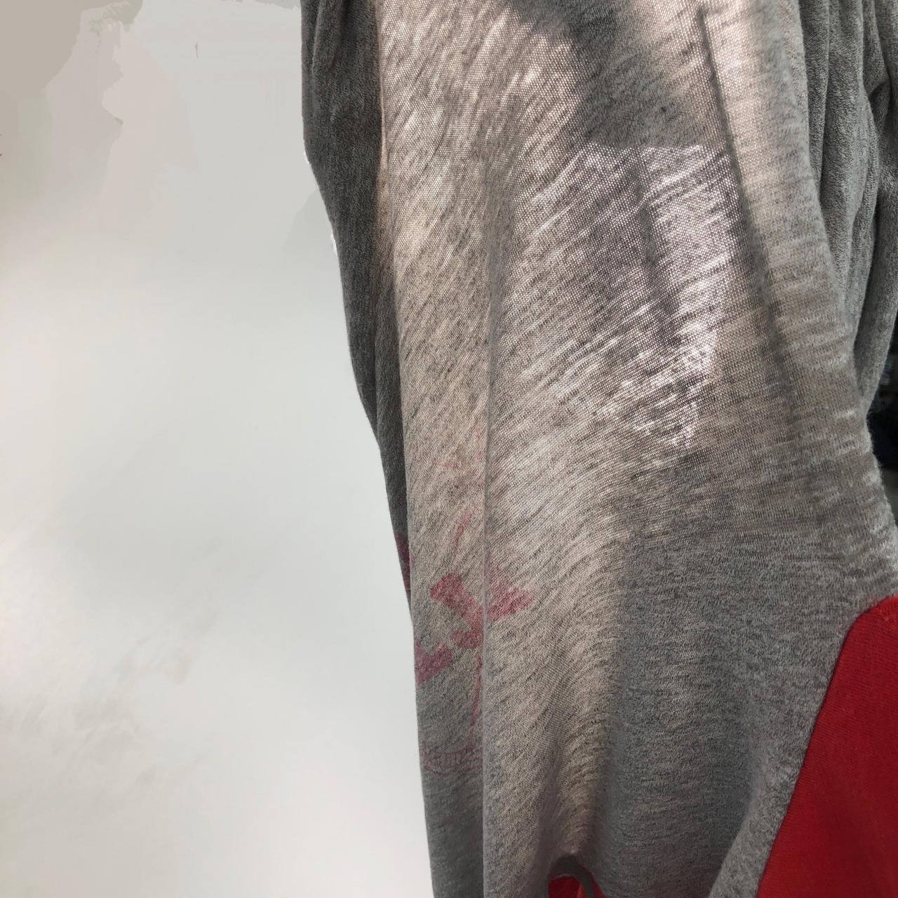 全体的に生地がうすくなっており、脇、胸の色が変わっている部分はさらに生地がうすくなっております 画像は撮影用照明器に被せて撮影したものです
