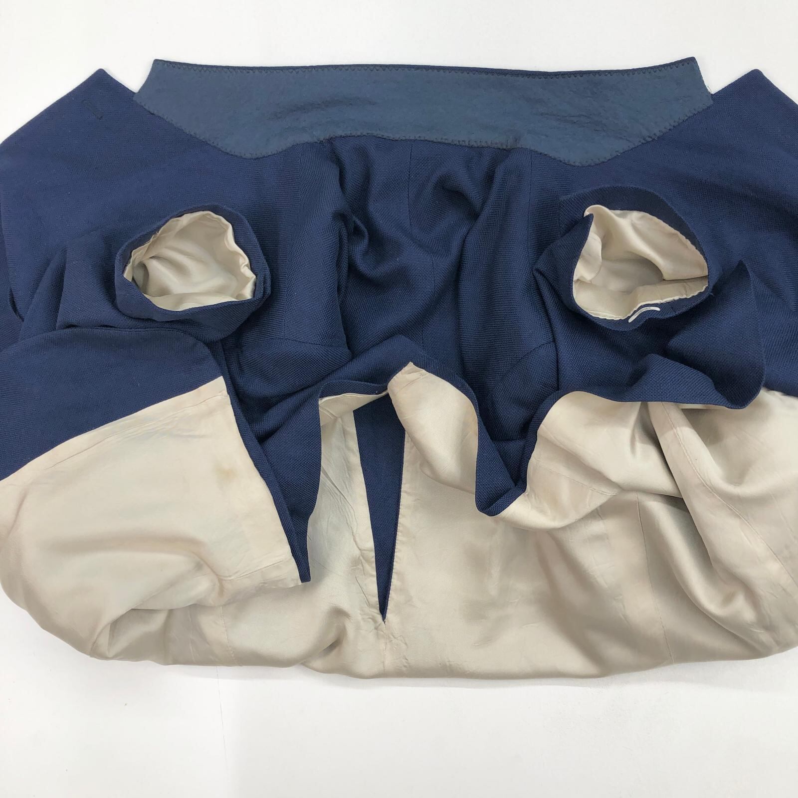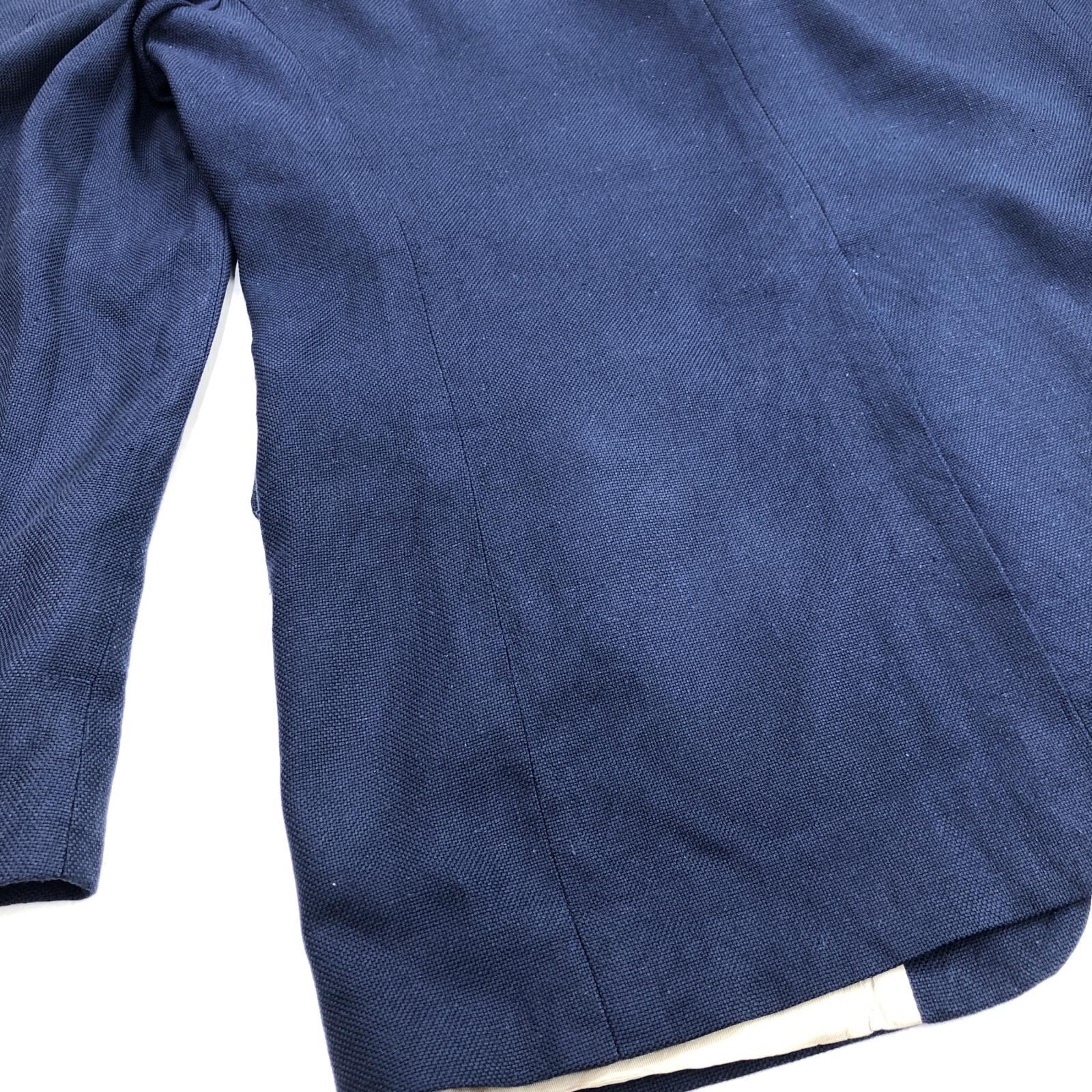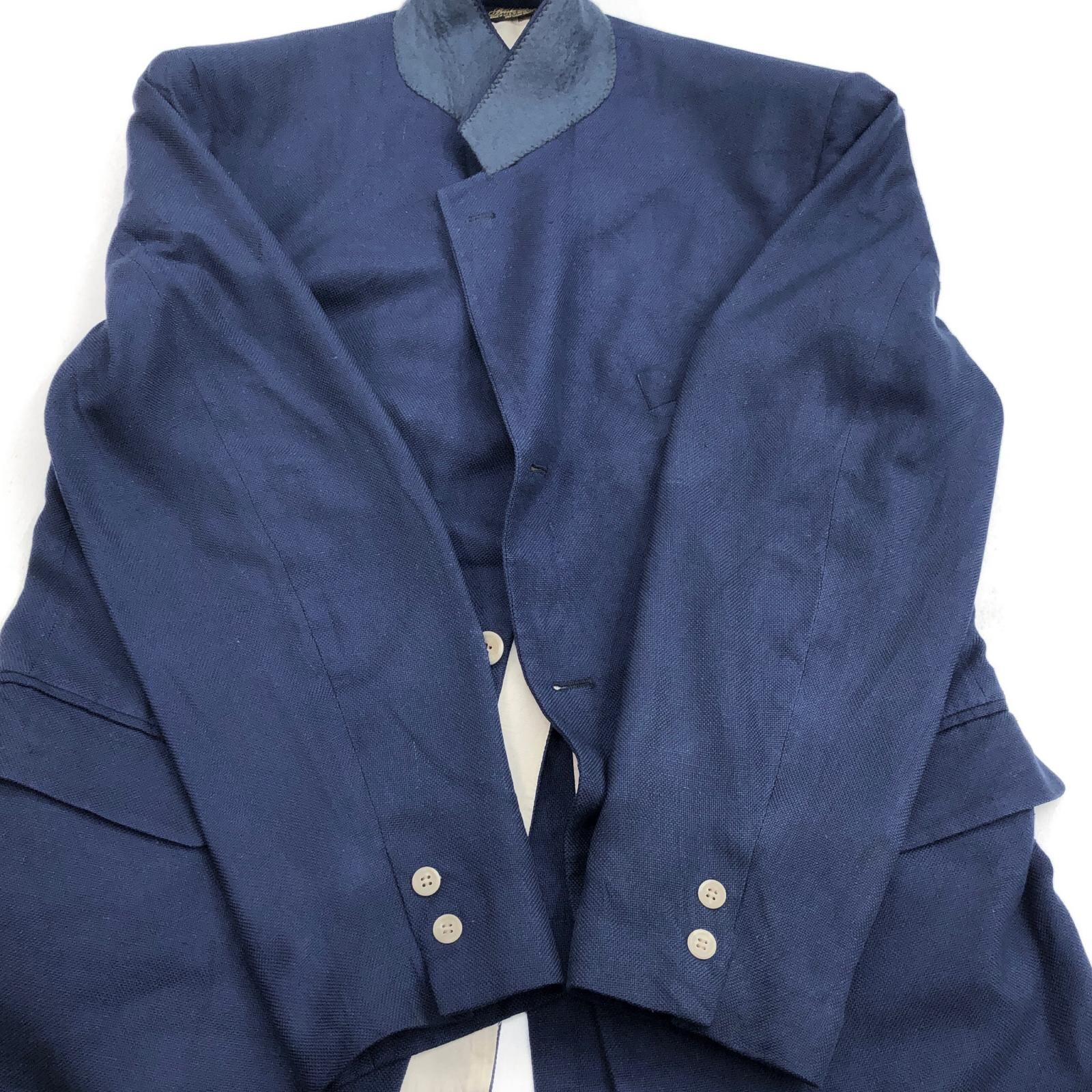 厚めの肩パッドが入っています 後ろ腰裾あたり他 多少の毛羽立ちはございます 裏地にシワ、シワ癖が残っているところがあります 織りキズがあるところがあります 裏地前立て真ん中、下に目立つシミがあります その他左袖など画像に目立たない写らないようなうすしシミがあるところがありますのでご了承くださいませ