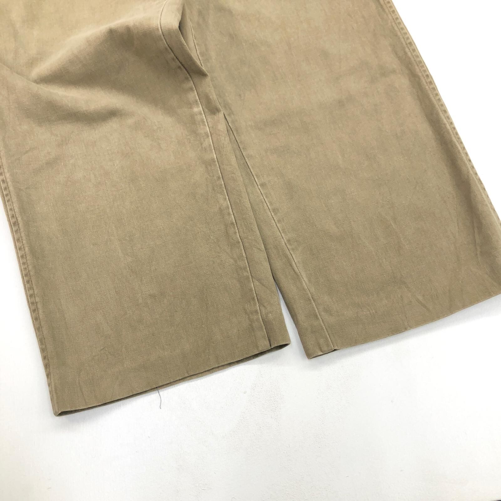 全体的に細かい色のムラ、色褪せがあり、少しシワ癖が残っています 裾にうす汚れ、右ヒップポケットボタン欠損 そのあたりに点々と色付きかサビ付きのようなものがあります