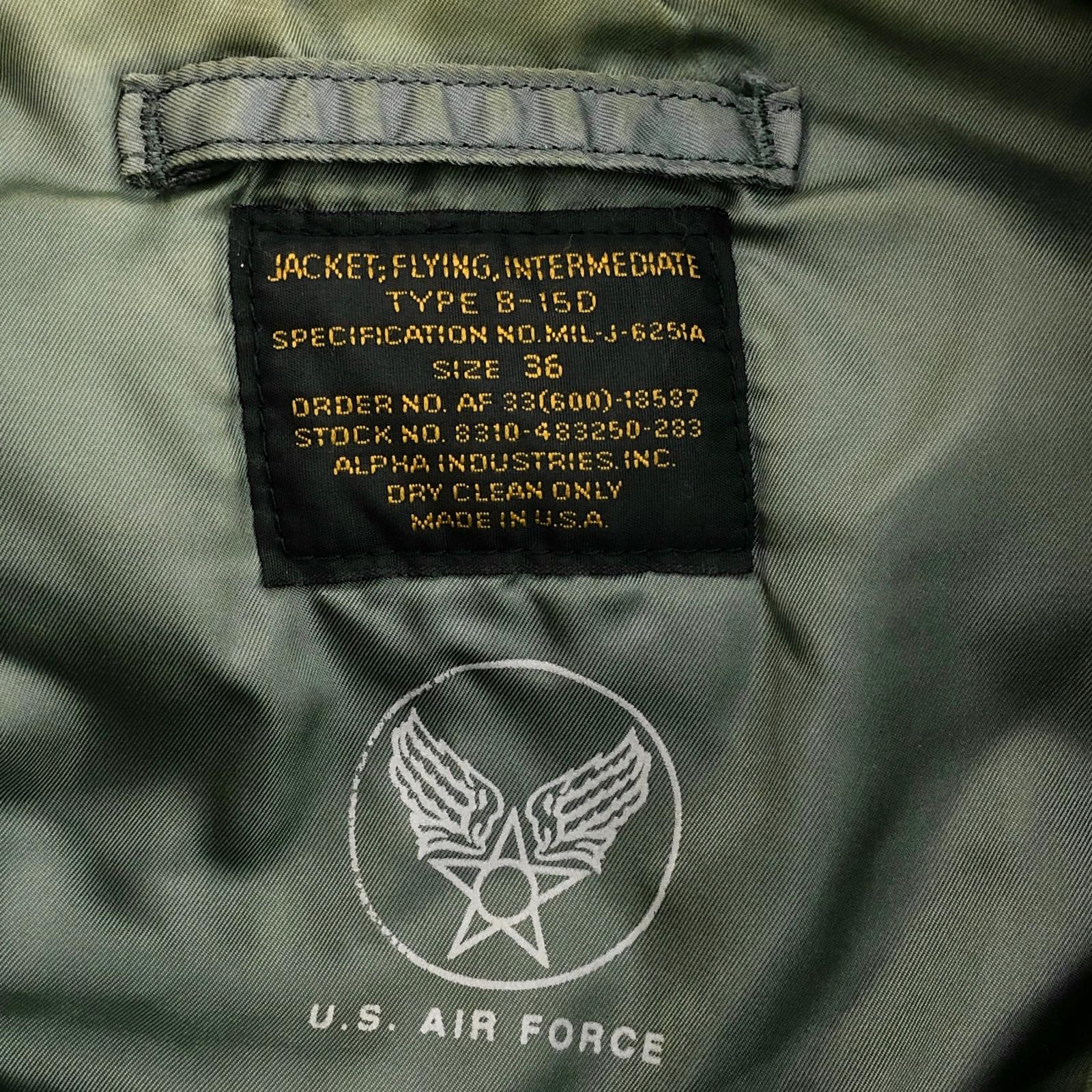 ALPHA アルファ 90年代 USA製 B-15D 民間品 フライト ジャケット JACKET FLYING,INTERMEDIATE TYPE B-15D MIL-J-62251A セージグリーン 36 表記 タグ | 古着屋 EAGLEBASE