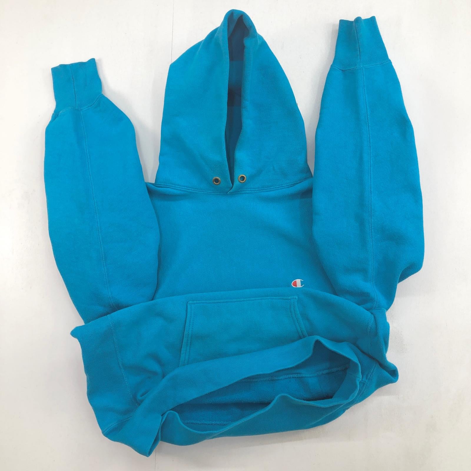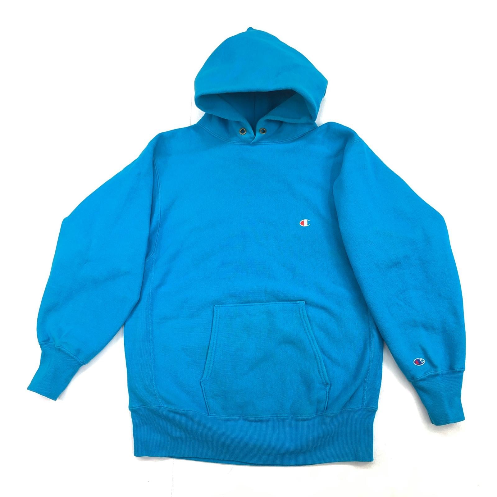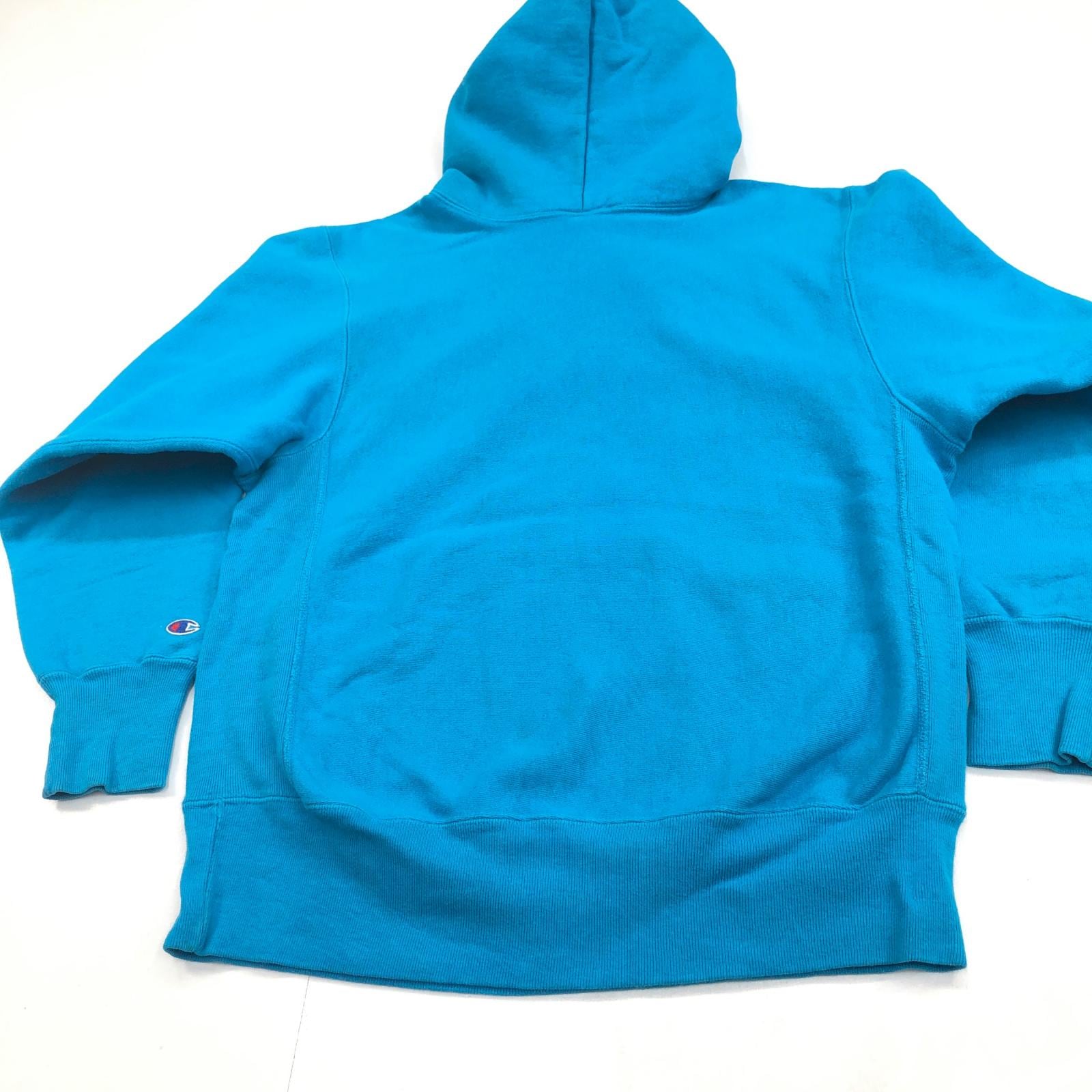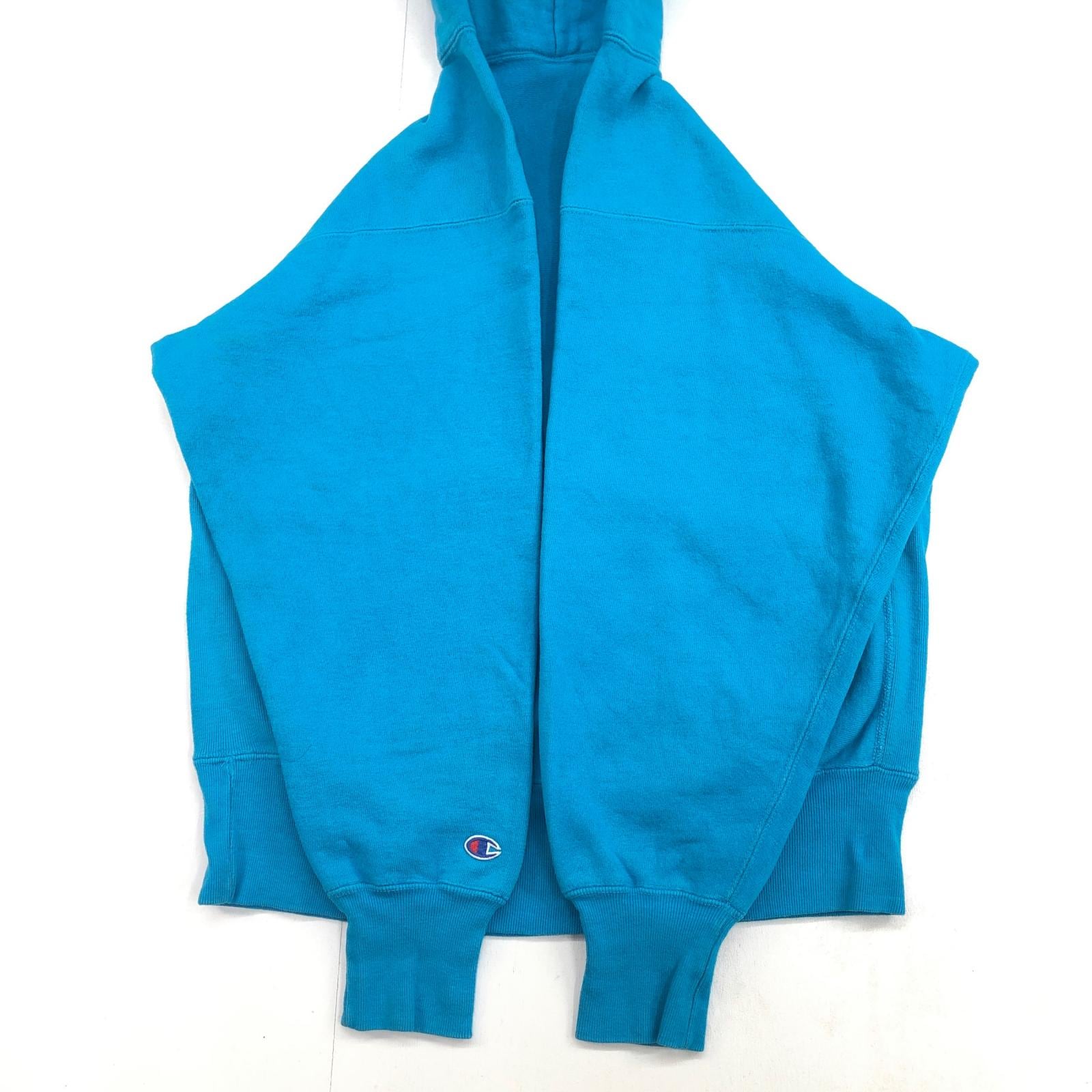 CHAMPION チャンピオン 90年代 USA製 刺繍タグ 胸袖目あり リバースウィーブ スウェットパーカー フーディー 無地 プレーン ターコイズブルー系 タグ 表記 LARGE
