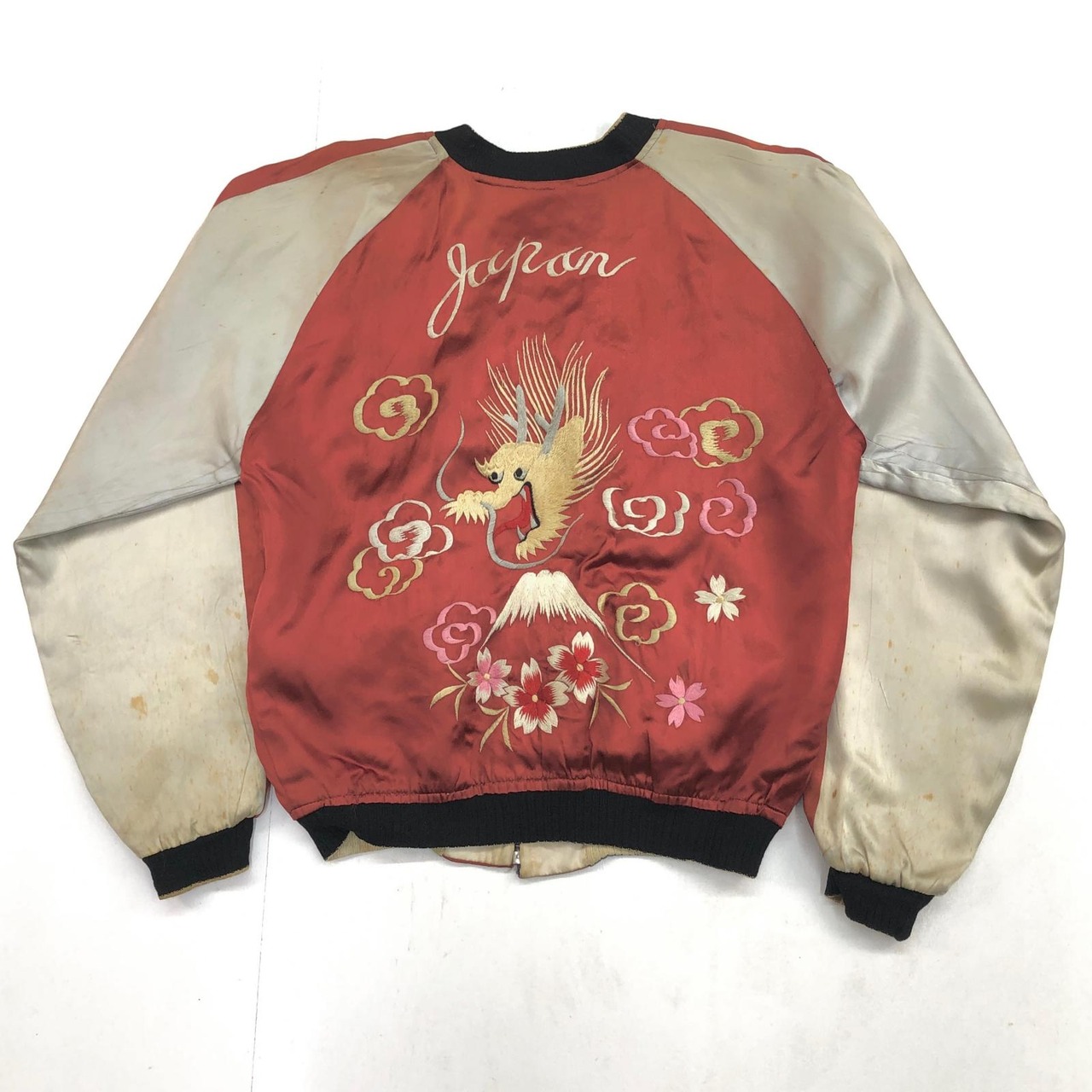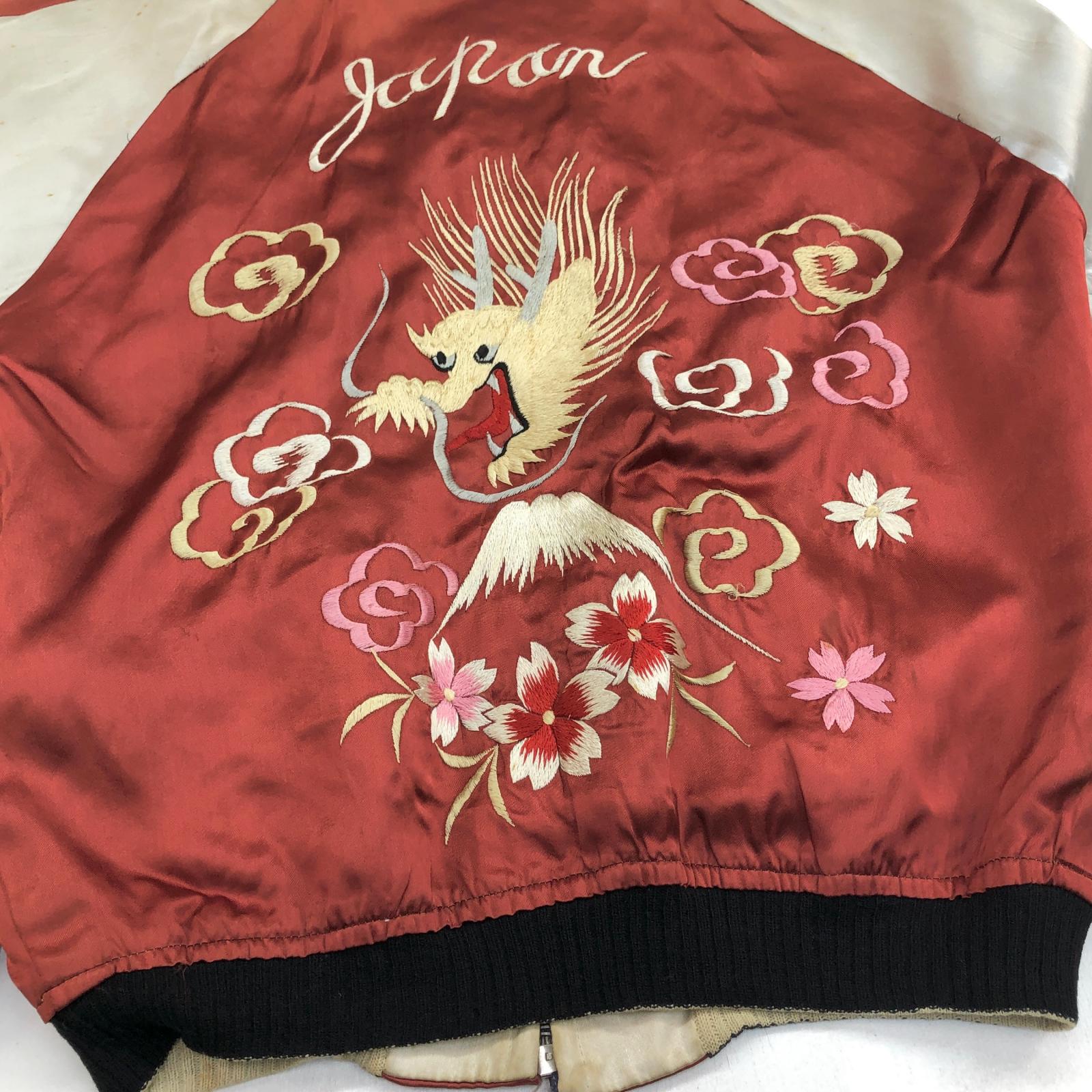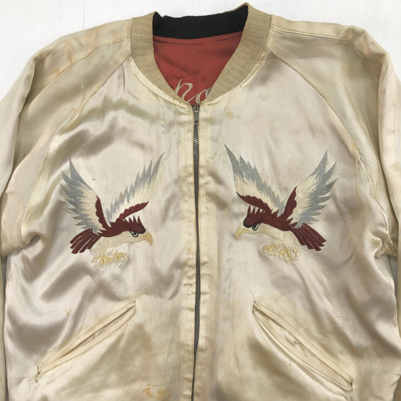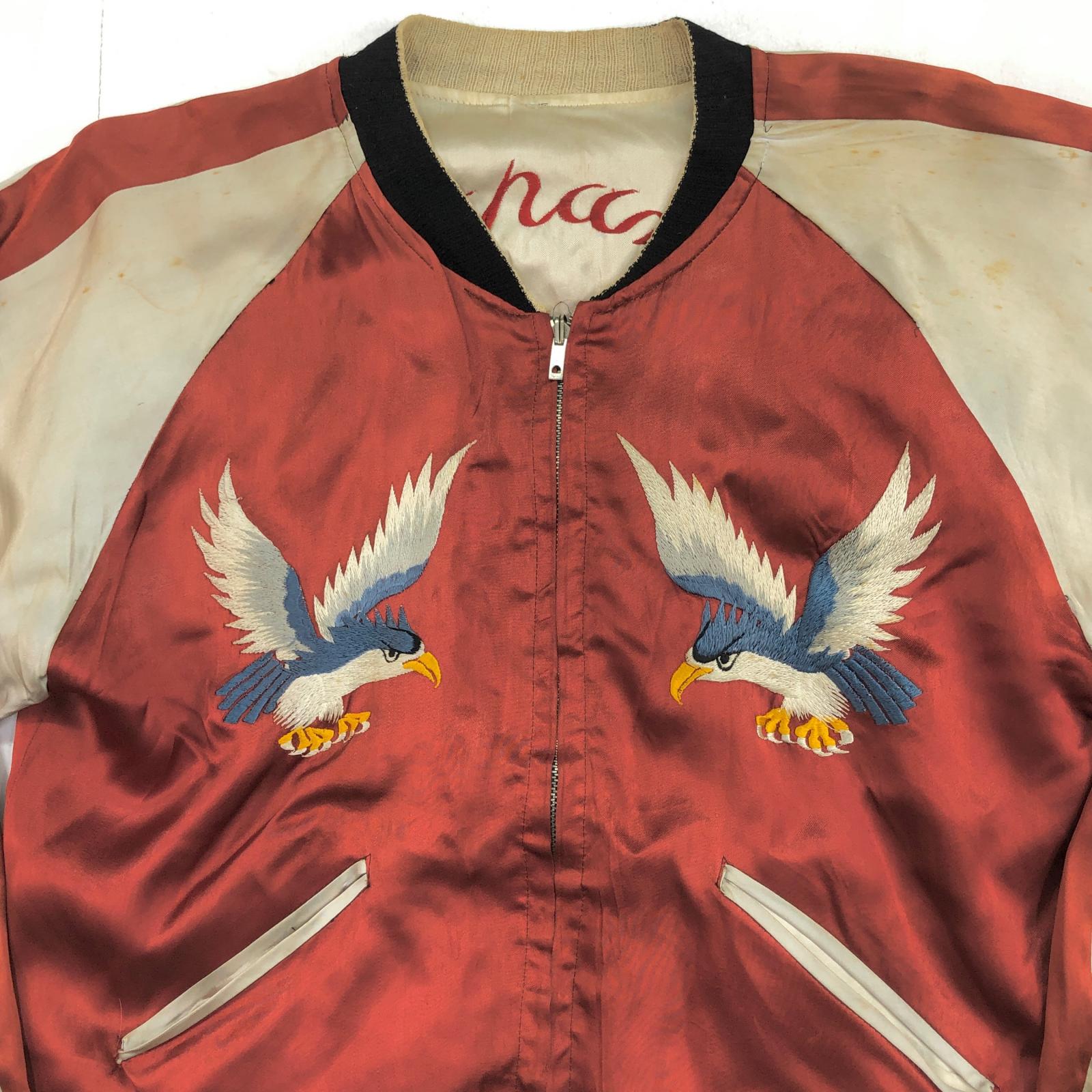 UNKNOWN 50年代 スカジャン スーベニアジャケット サテン リバーシブル 鷹 龍 刺繍 ブリックレッド オフホワイト メンズ L 位