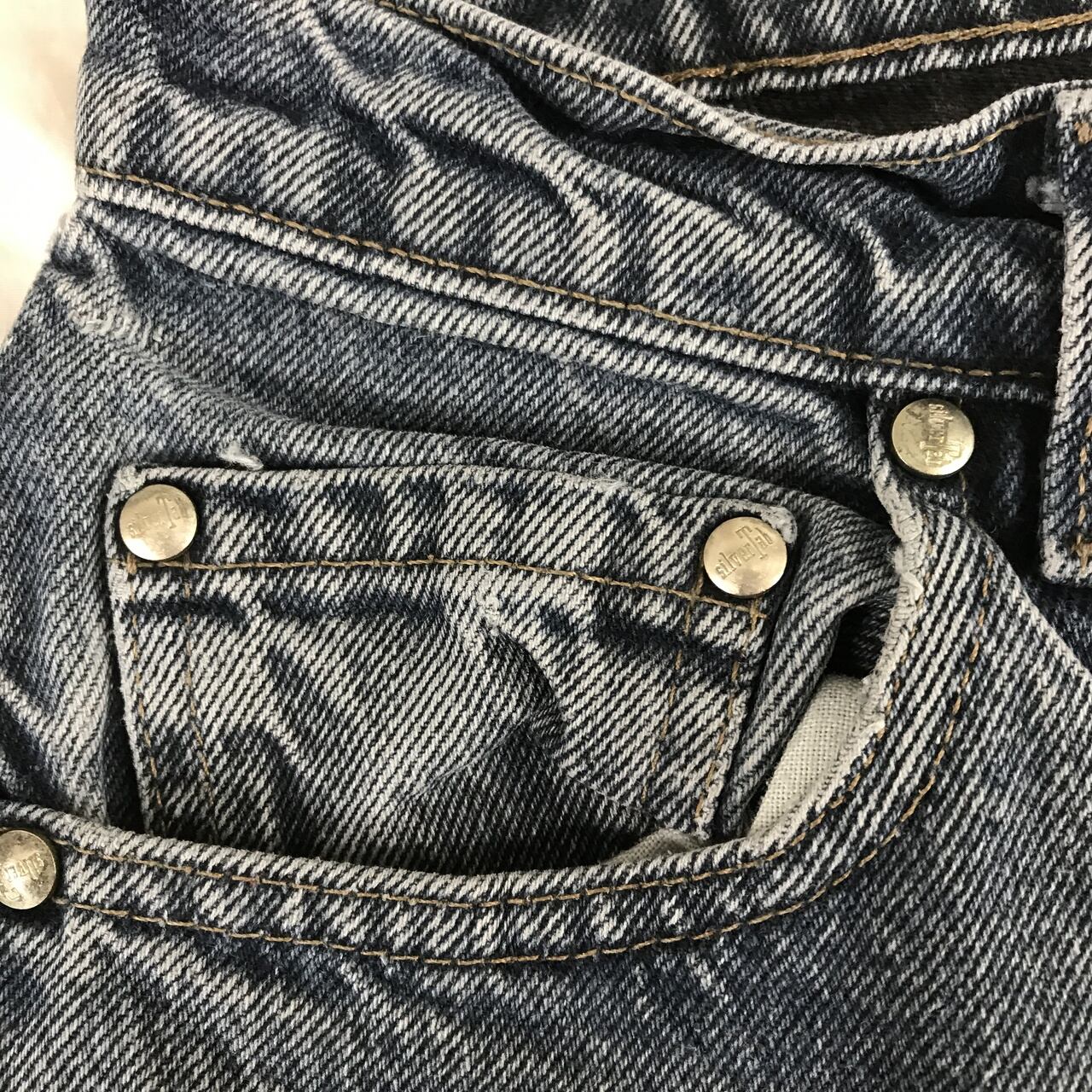 シルバータブの横にシールのノリが付いています。股下がホツレています。デニムの裏地がグレーなために独特な色目です。多少薄汚れが有ります。
