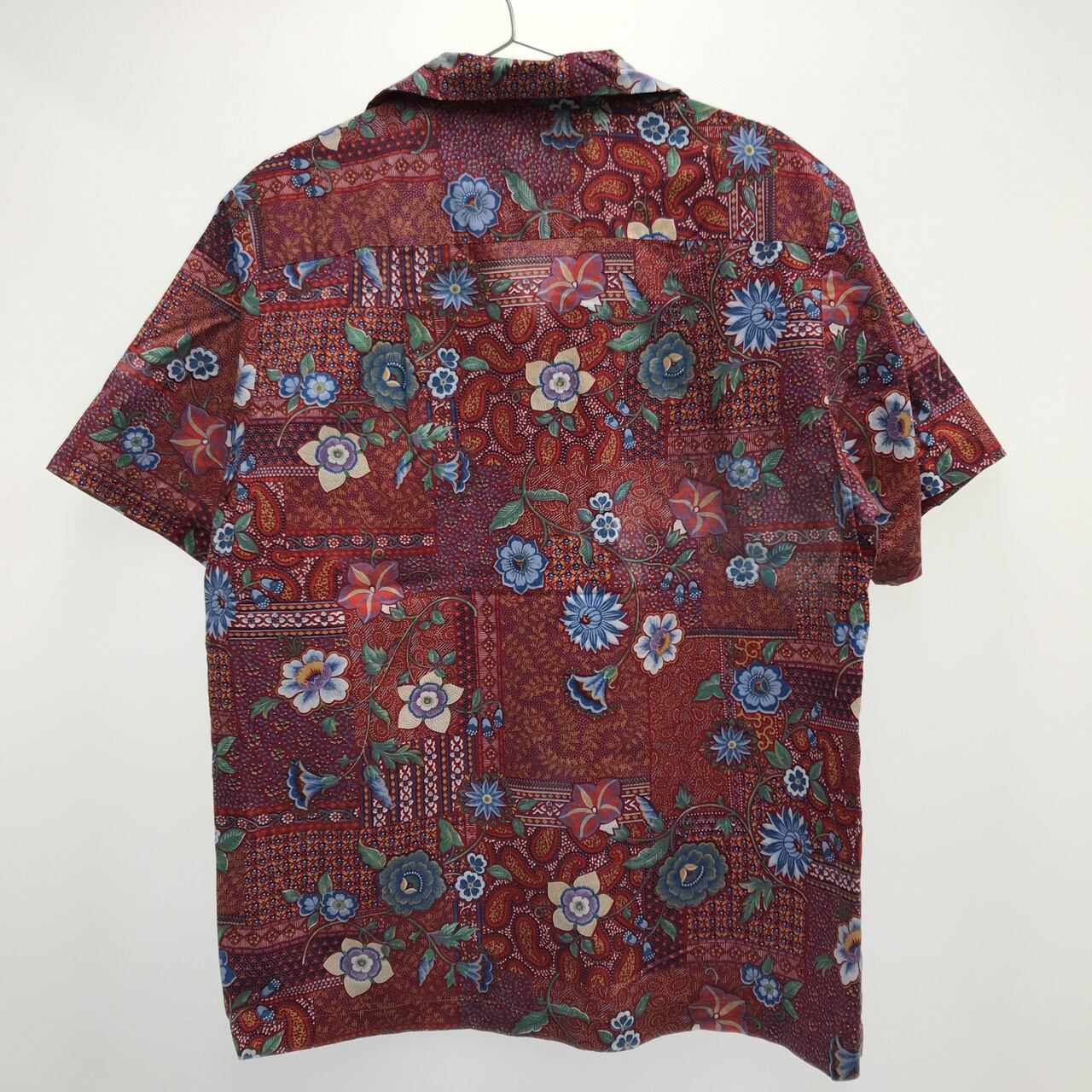 80〜90年代? ハンドメイド? 手作り風 赤いオリエンタルな柄生地の コットンハワイアンシャツ アロハシャツ
