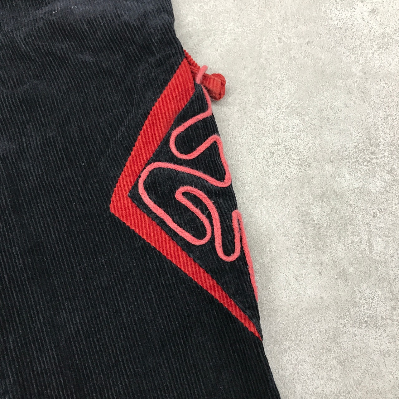 赤いコーデュロイ部分は生地が切り替えになっています