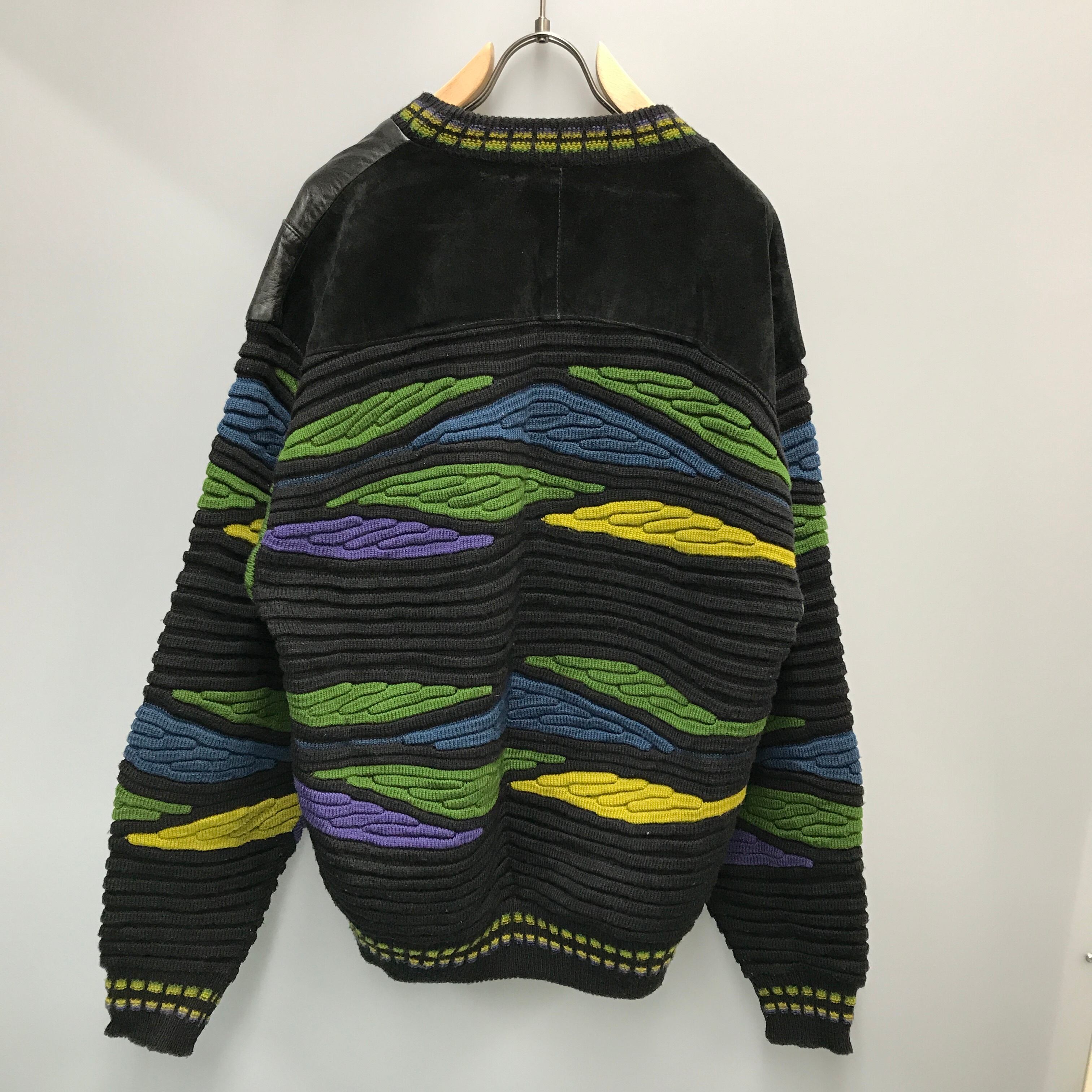 80〜90年代 レア!立体3Dクージー風 レザーとスウェードとのウルトラ・ゴールデンコンビセーター