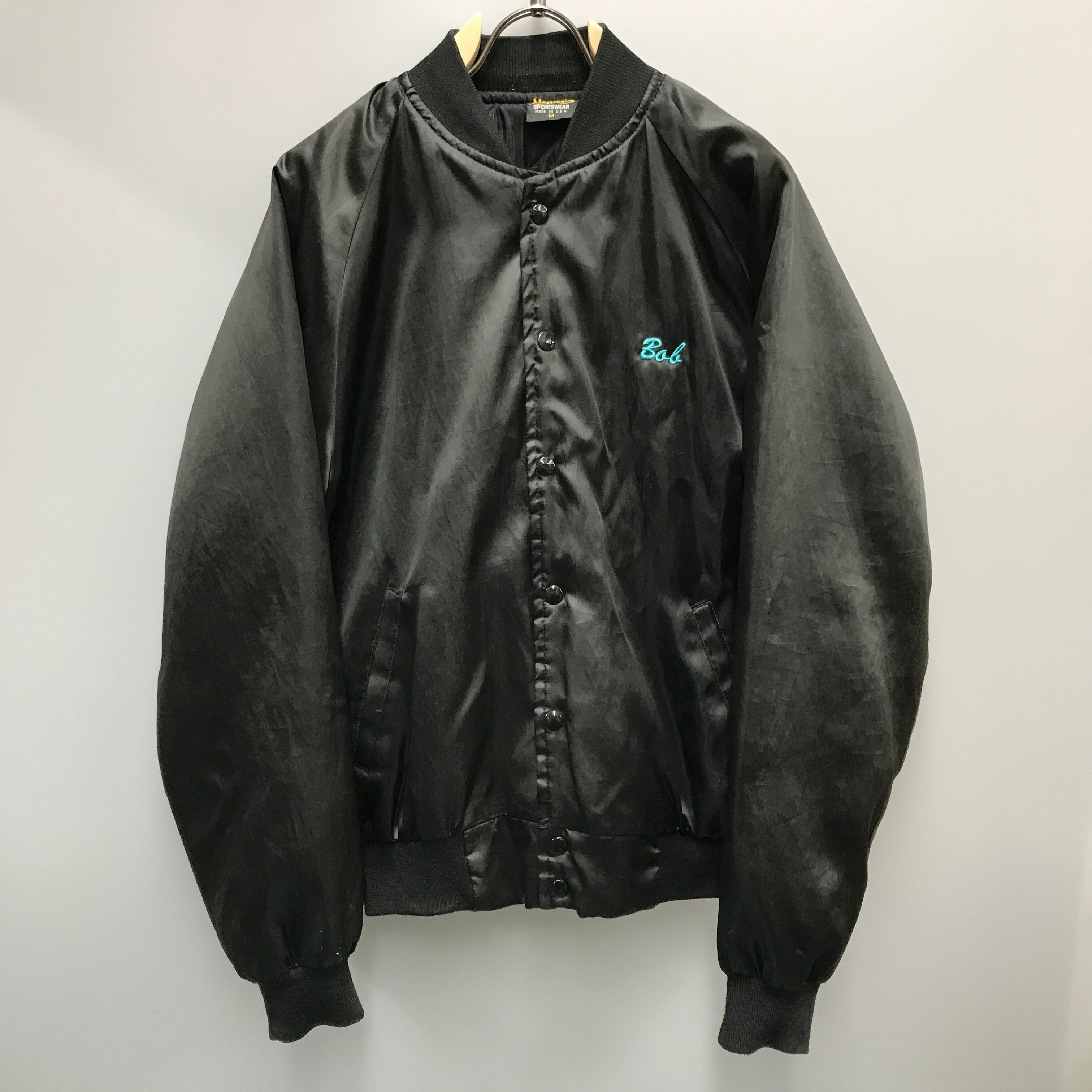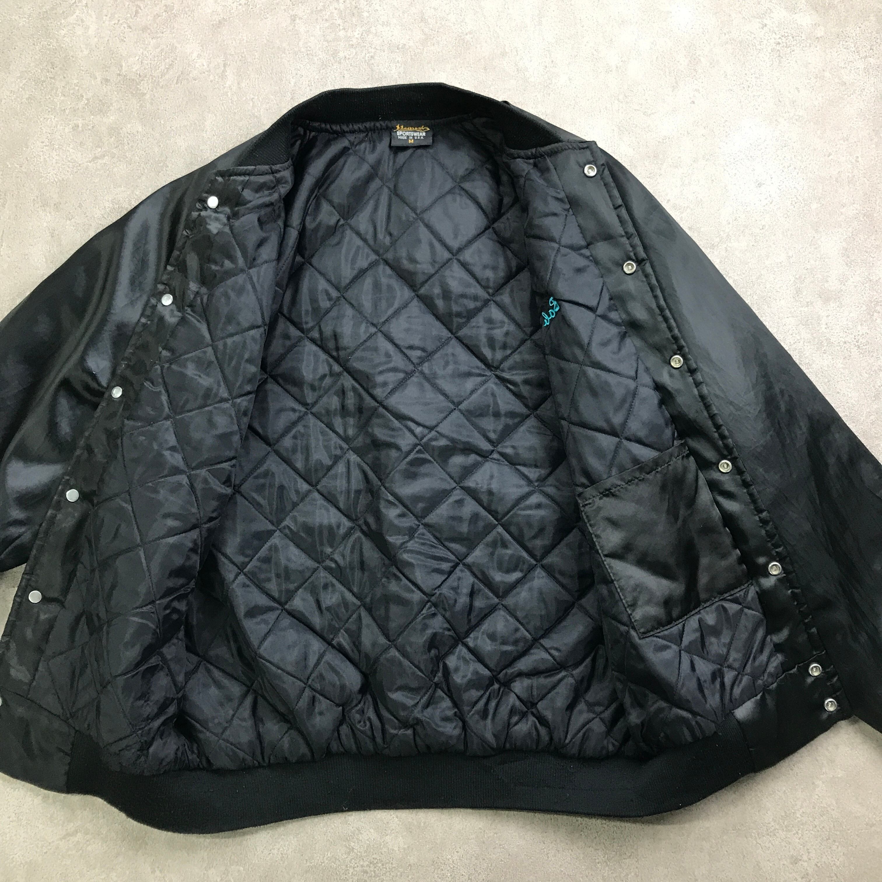 ブラック サテン ナイロンスタジャン ベースボールジャケット