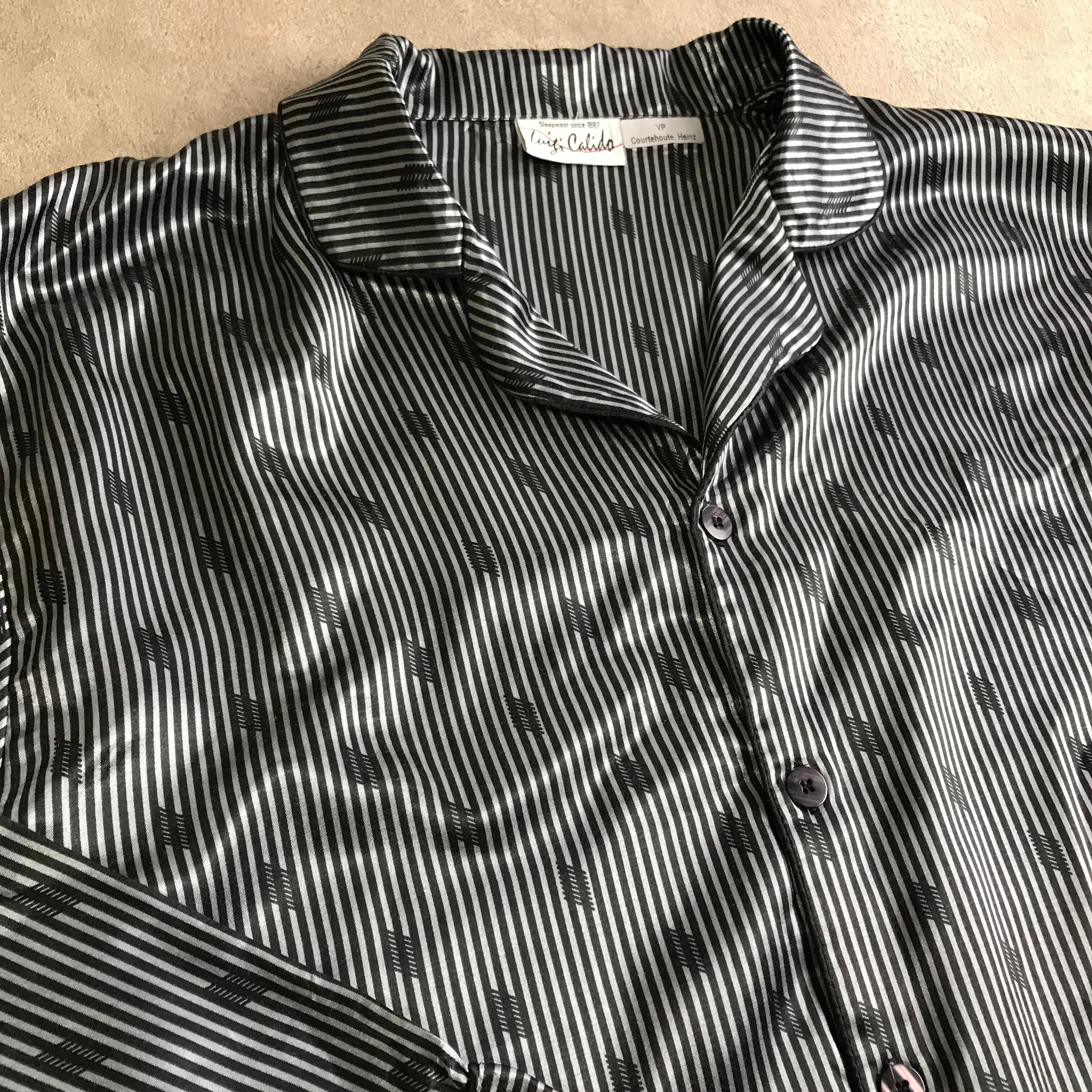 サービス品!80〜90年代 肌ざわり手触りが良い・ユーロ高級 サテンタイプ リラックス パジャマ ナイトウェアグレーストライプに柄入り 丸襟 黒パイピング