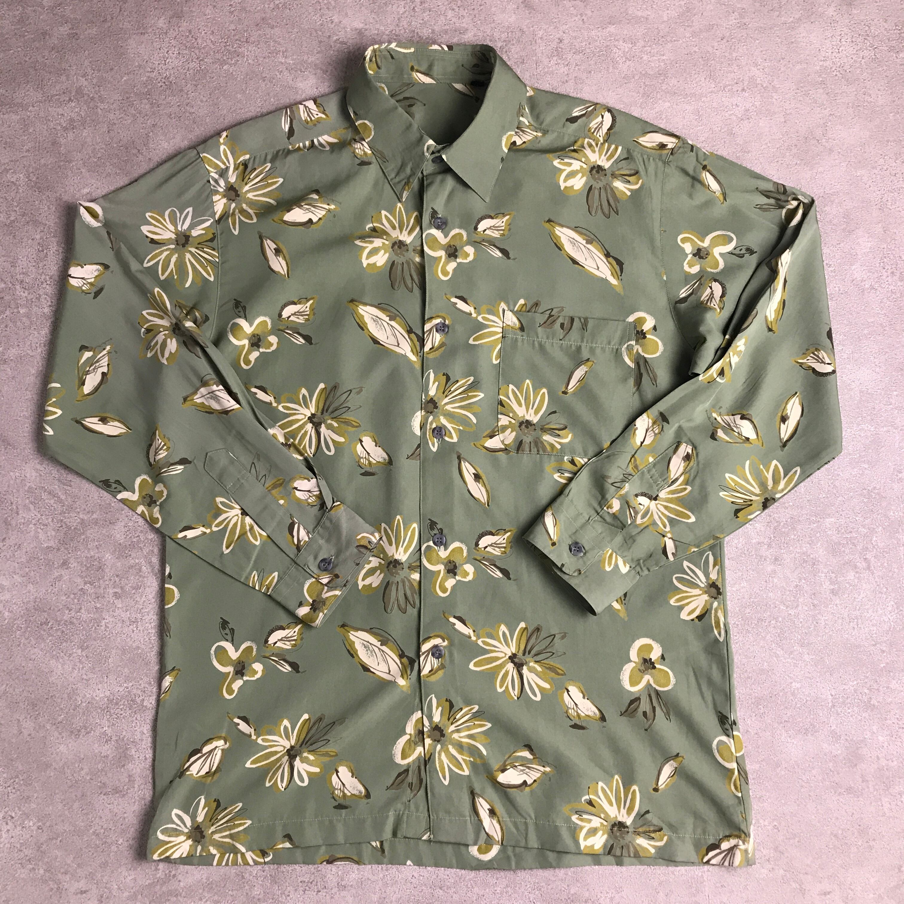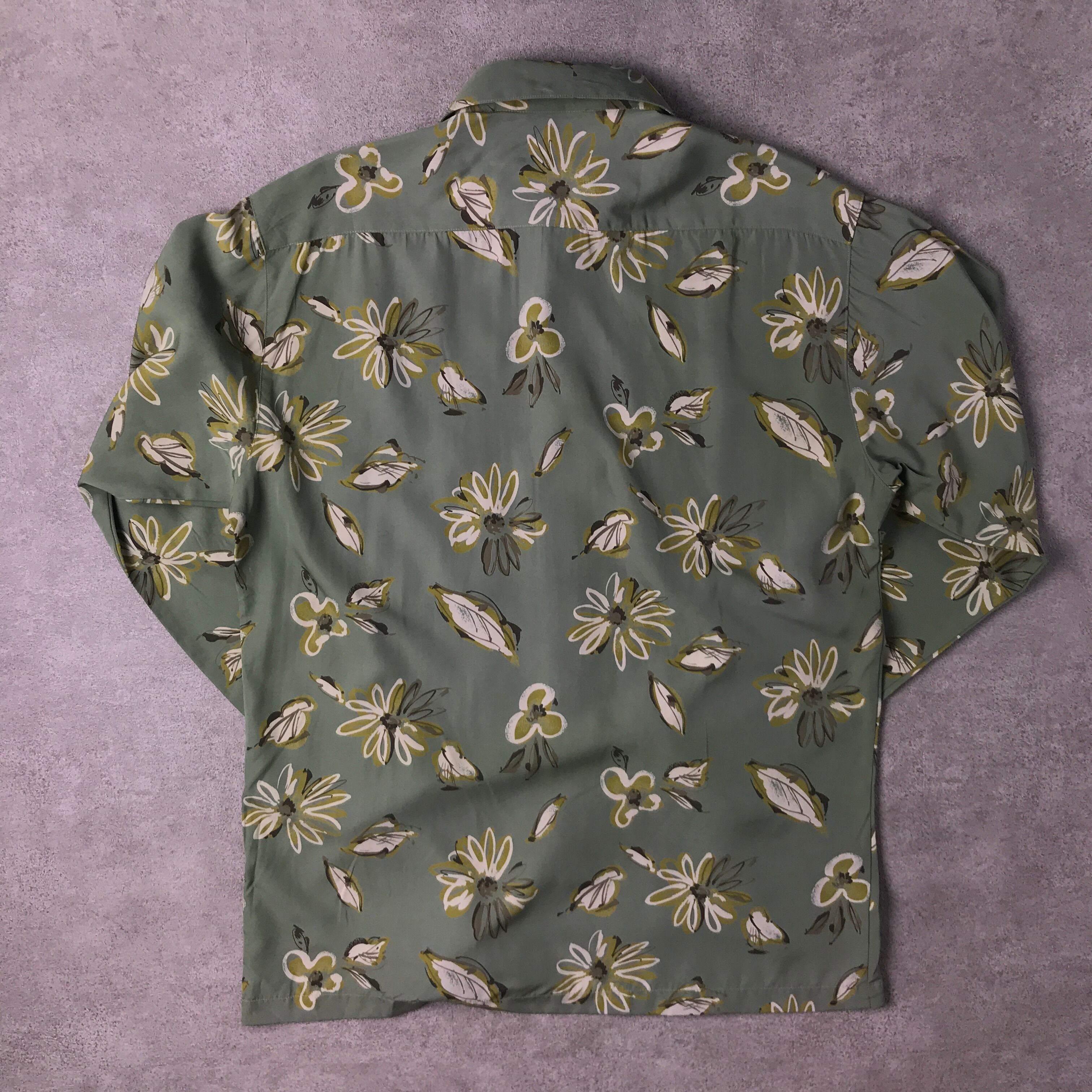 80〜90年代 テロポリエステル系 カーキグリーンやさしい FLOWER & LEAF フラワーリーフ柄シャツ 総柄 長袖