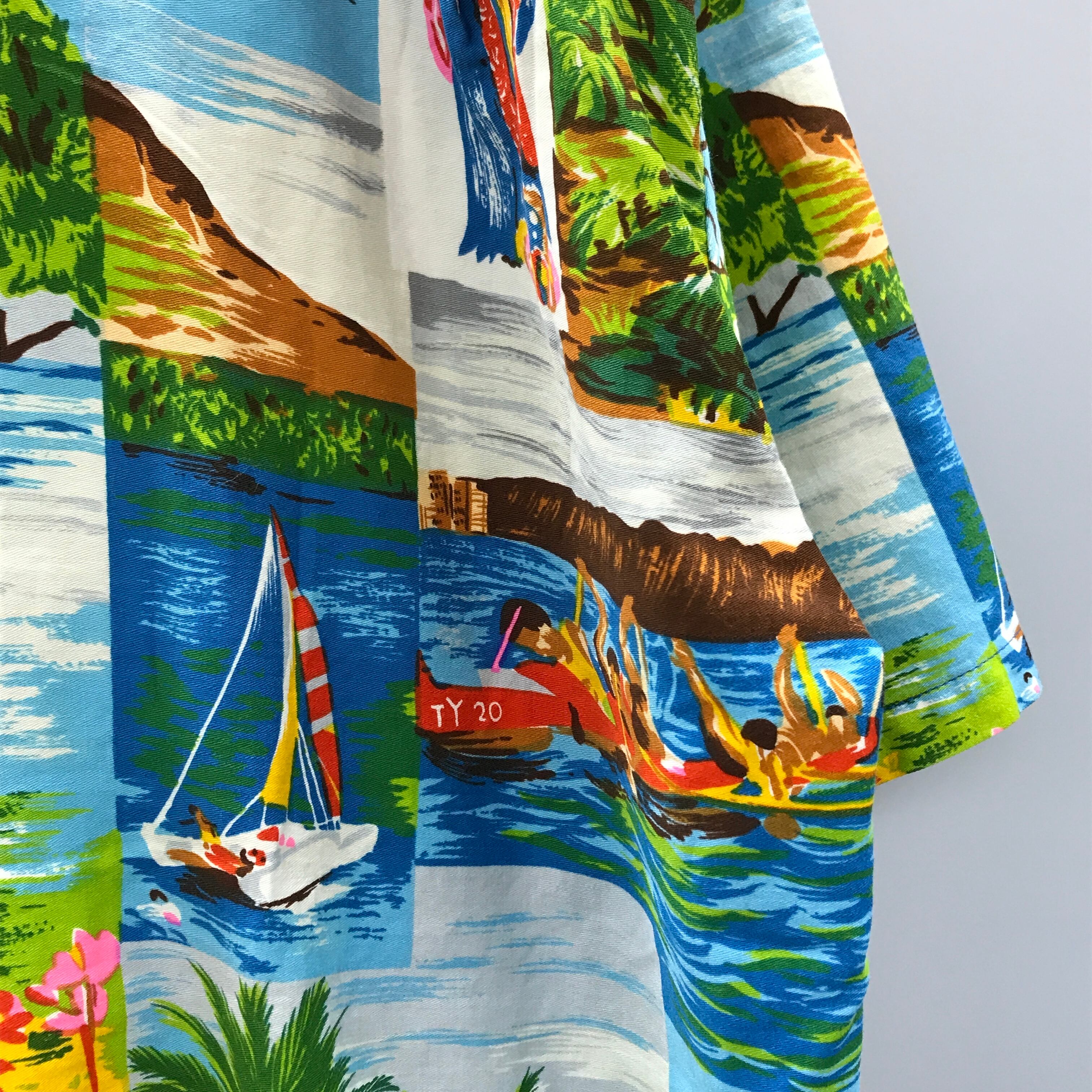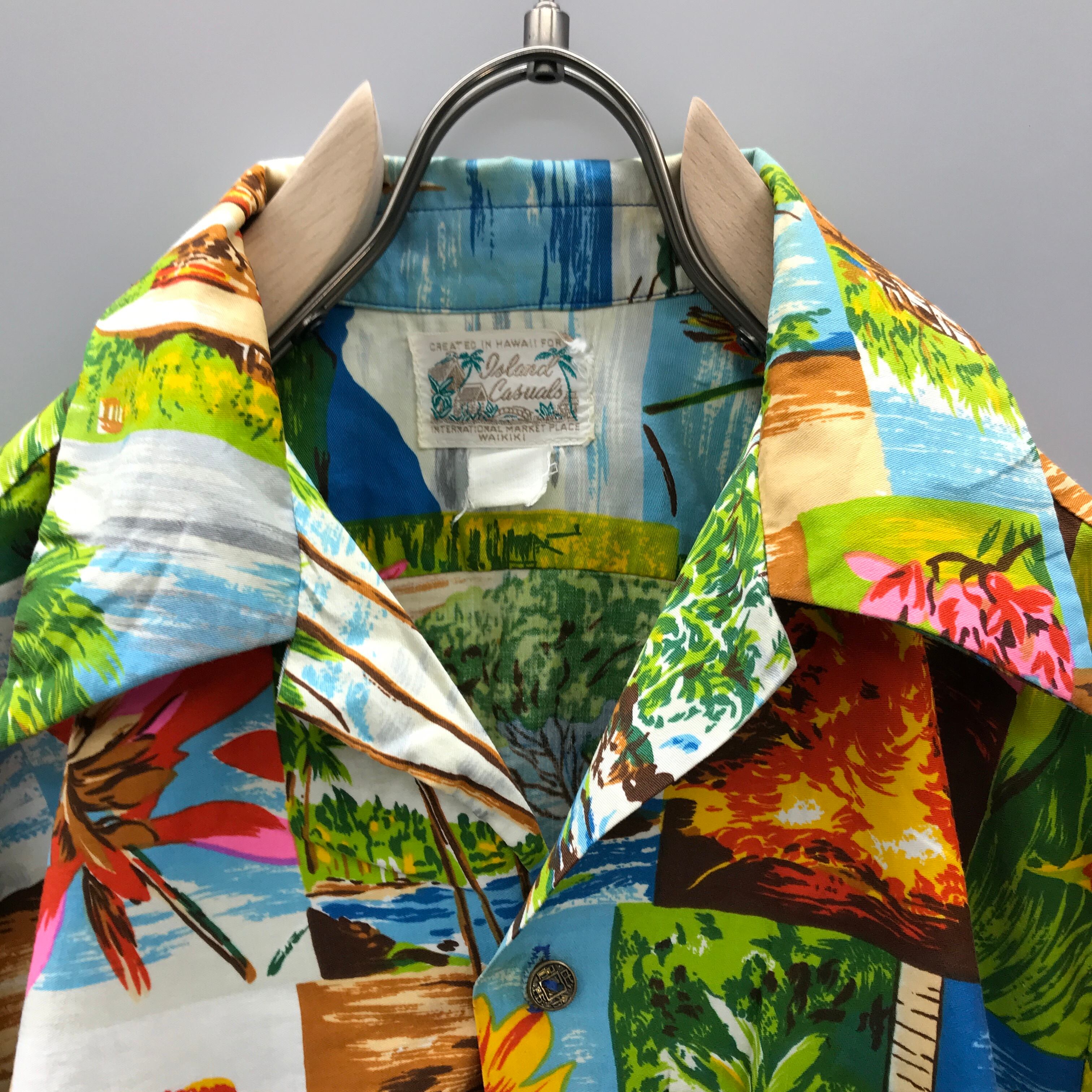 60〜70年代のオールオーバーパターンで銭形ボタンのハワイアンシャツです。