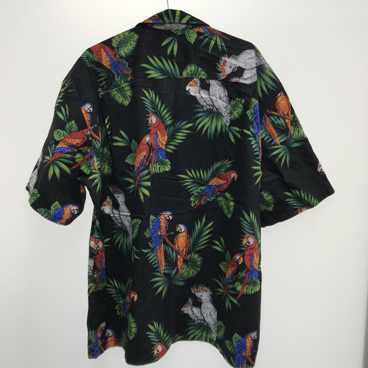 コットン系アロハシャツです 黒地に南国のオウムとインコ・・くっきりした柄が特徴です