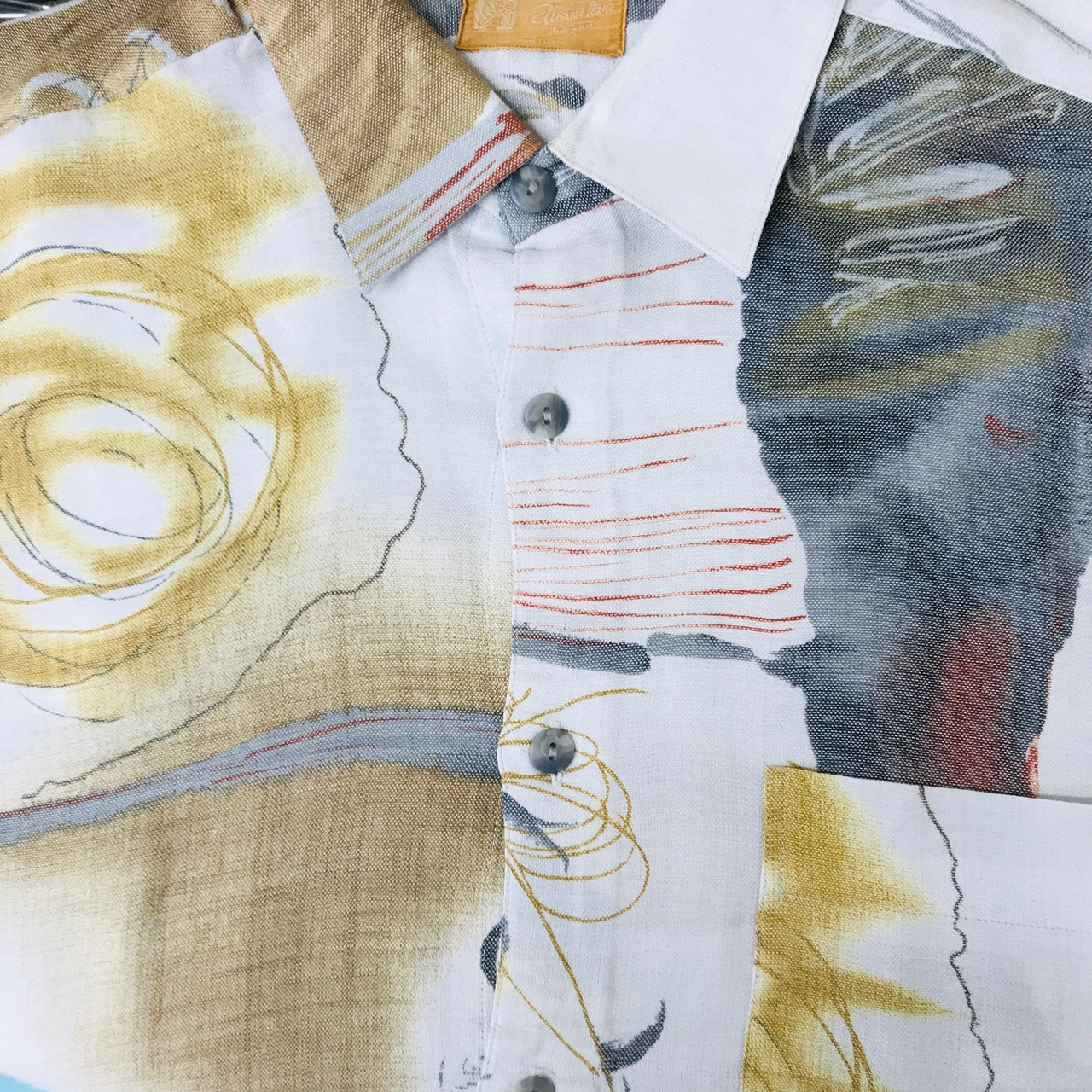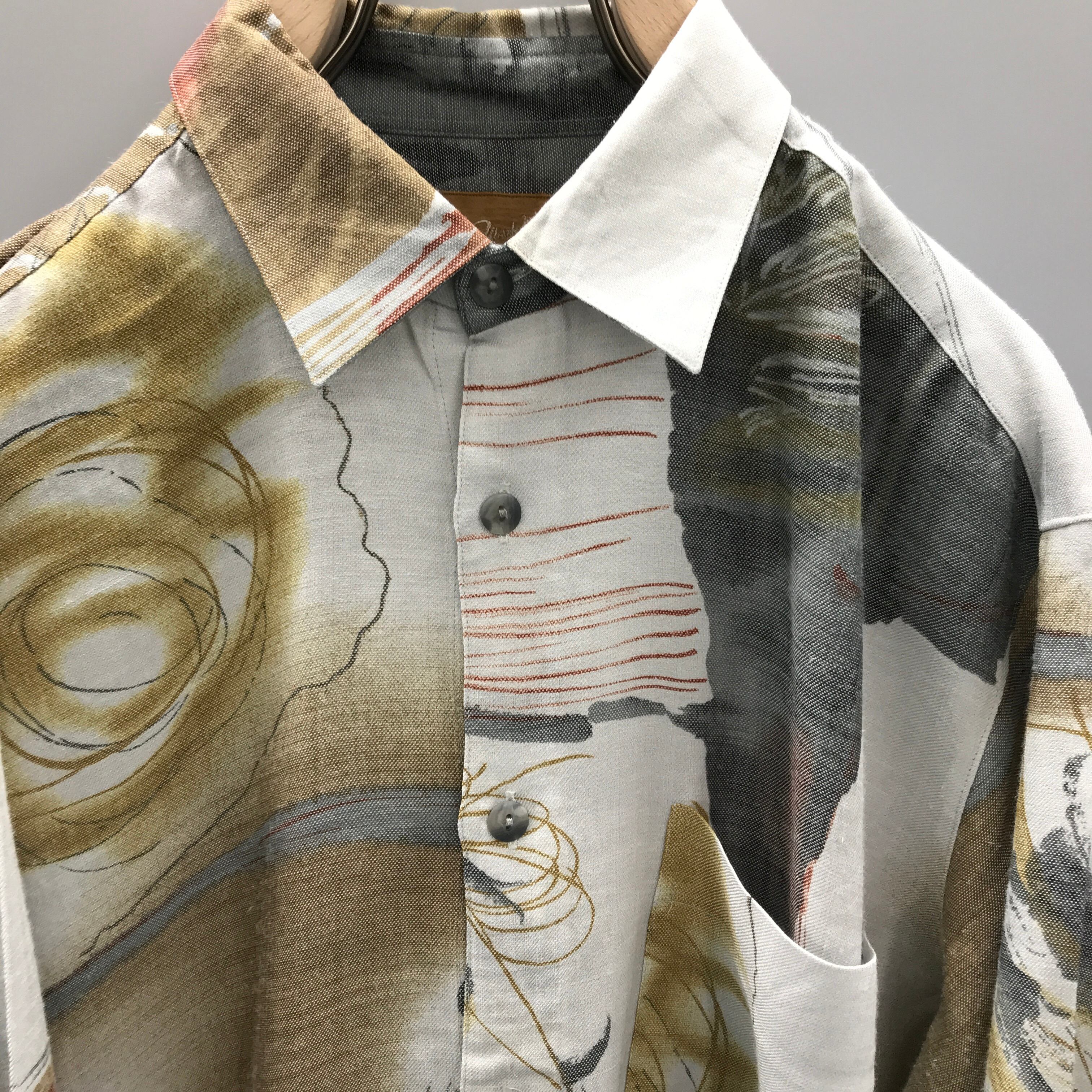 80年代 総柄 JPN alberde massa Watercolor水彩画のような 長袖 麻、レーヨン混柄シャツ