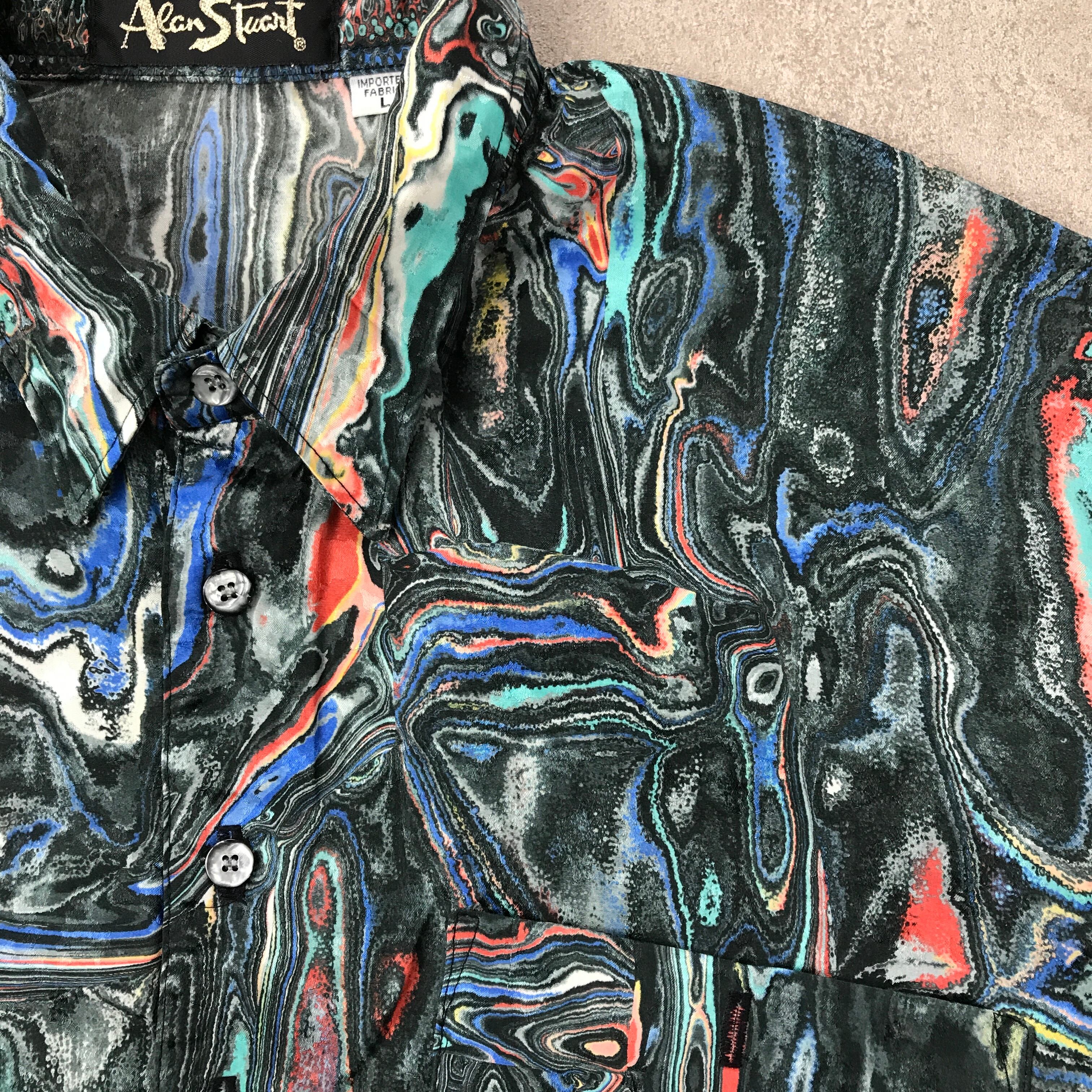 L 80年代 EURO 裾リヴ ALAN STUART IMPORTED FABRIC 総柄 マーブルウルトラQ 柄 半袖 ポリエステル 柄シャツ
