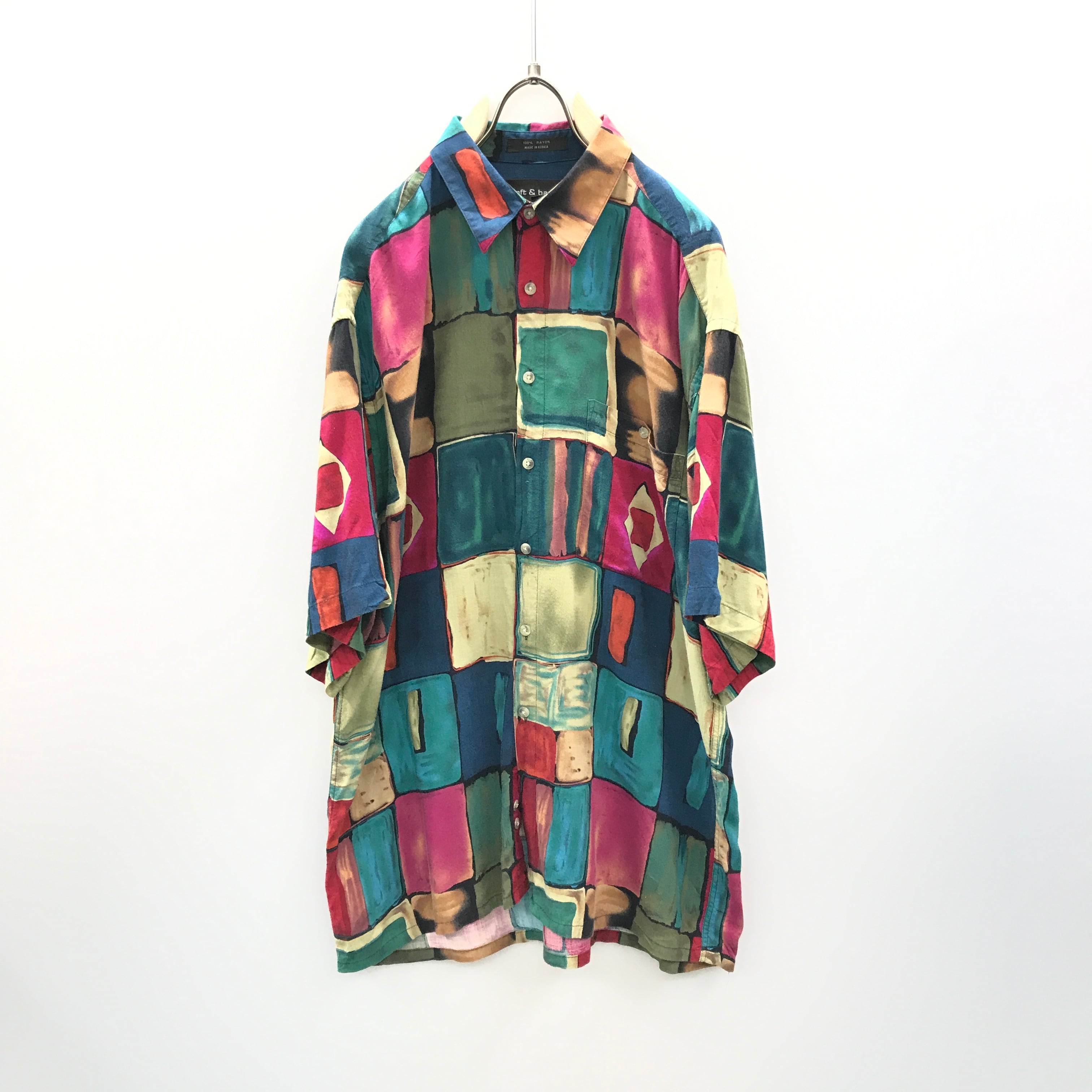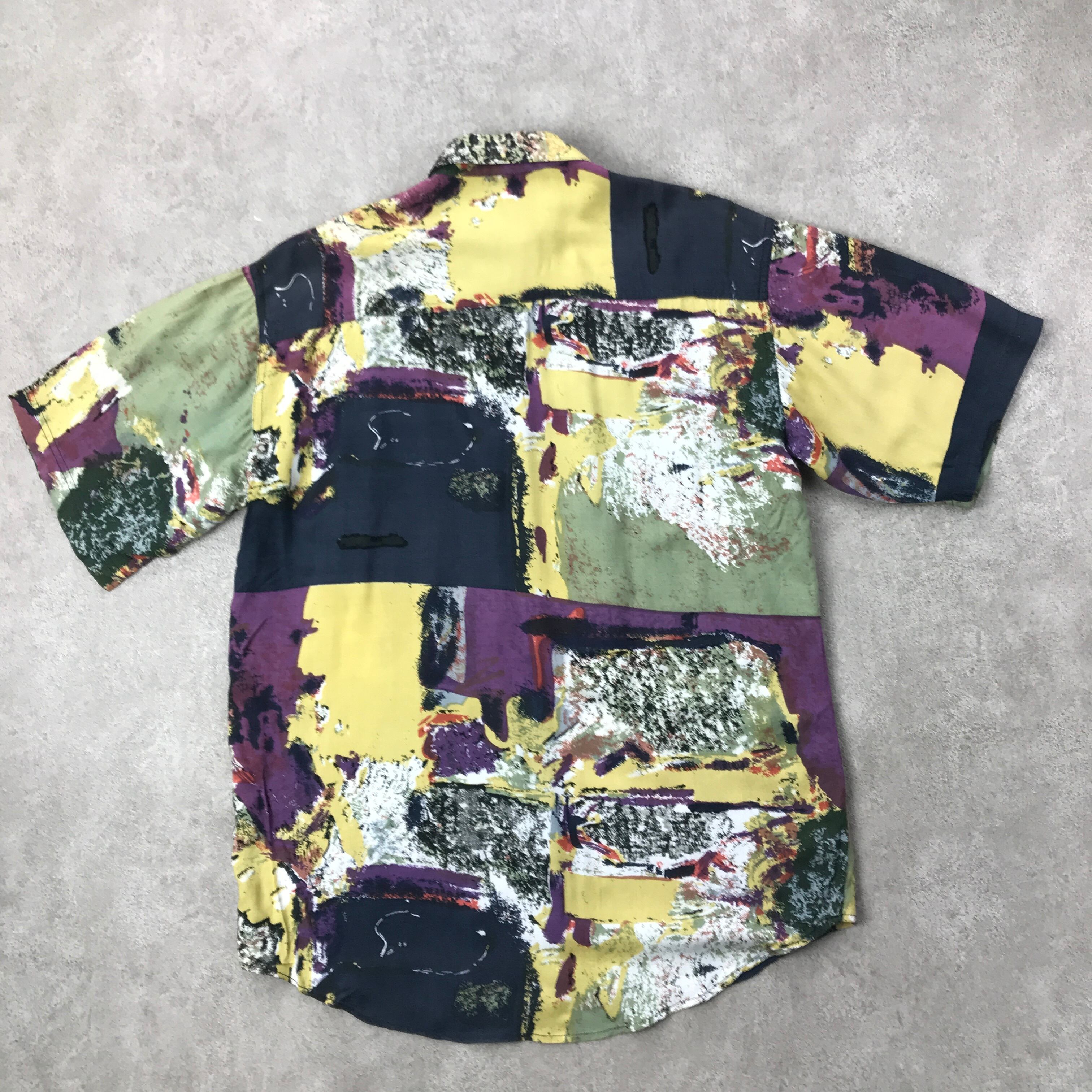 S 80年代 campus 総柄 壁画コラージュ風柄 半袖 レーヨン アート柄シャツ