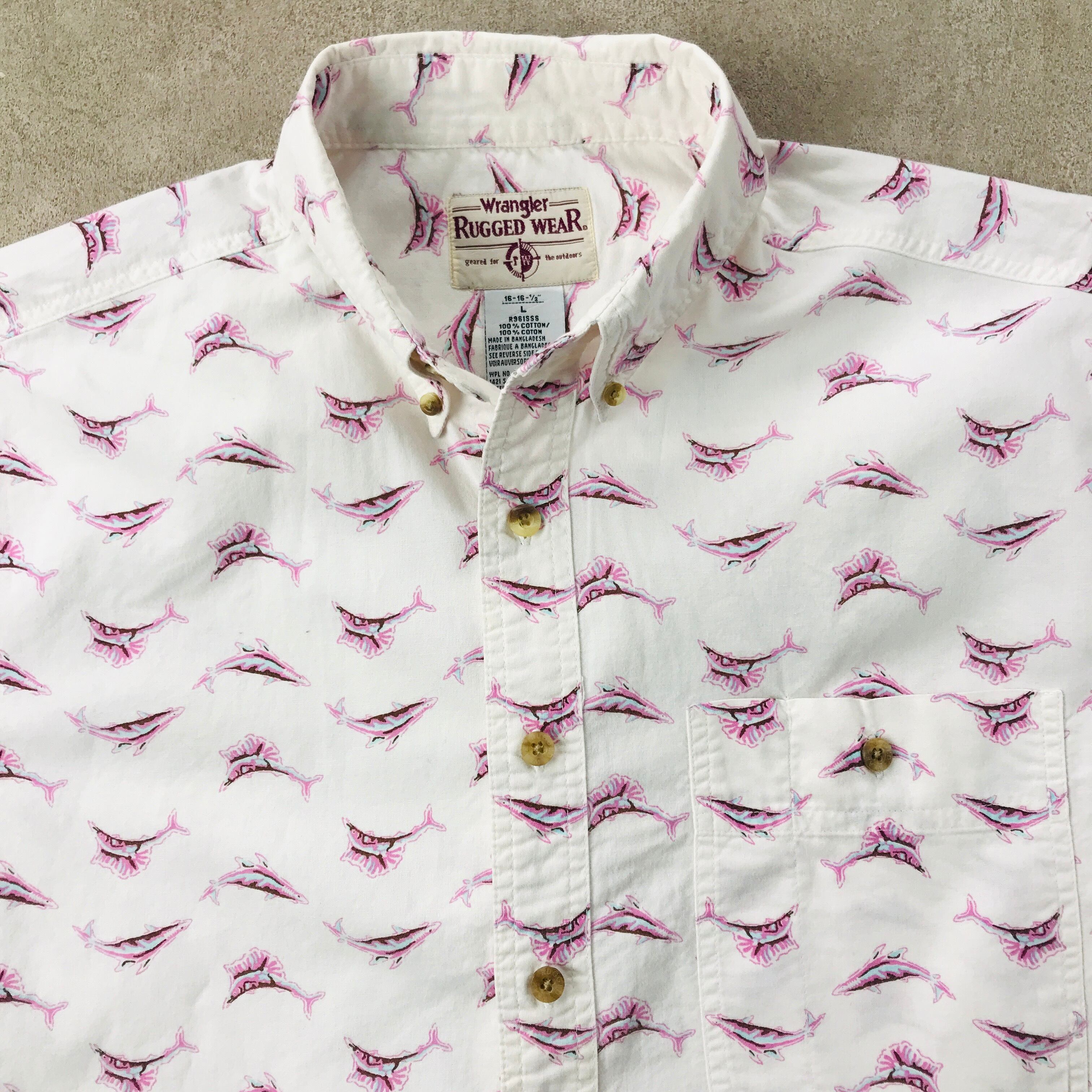 L 90年代 WRANGLER RUGGED WEAR 総柄 かじきと鮫?2種魚柄 フィッシュ柄 半袖 コットン 柄シャツ 白地