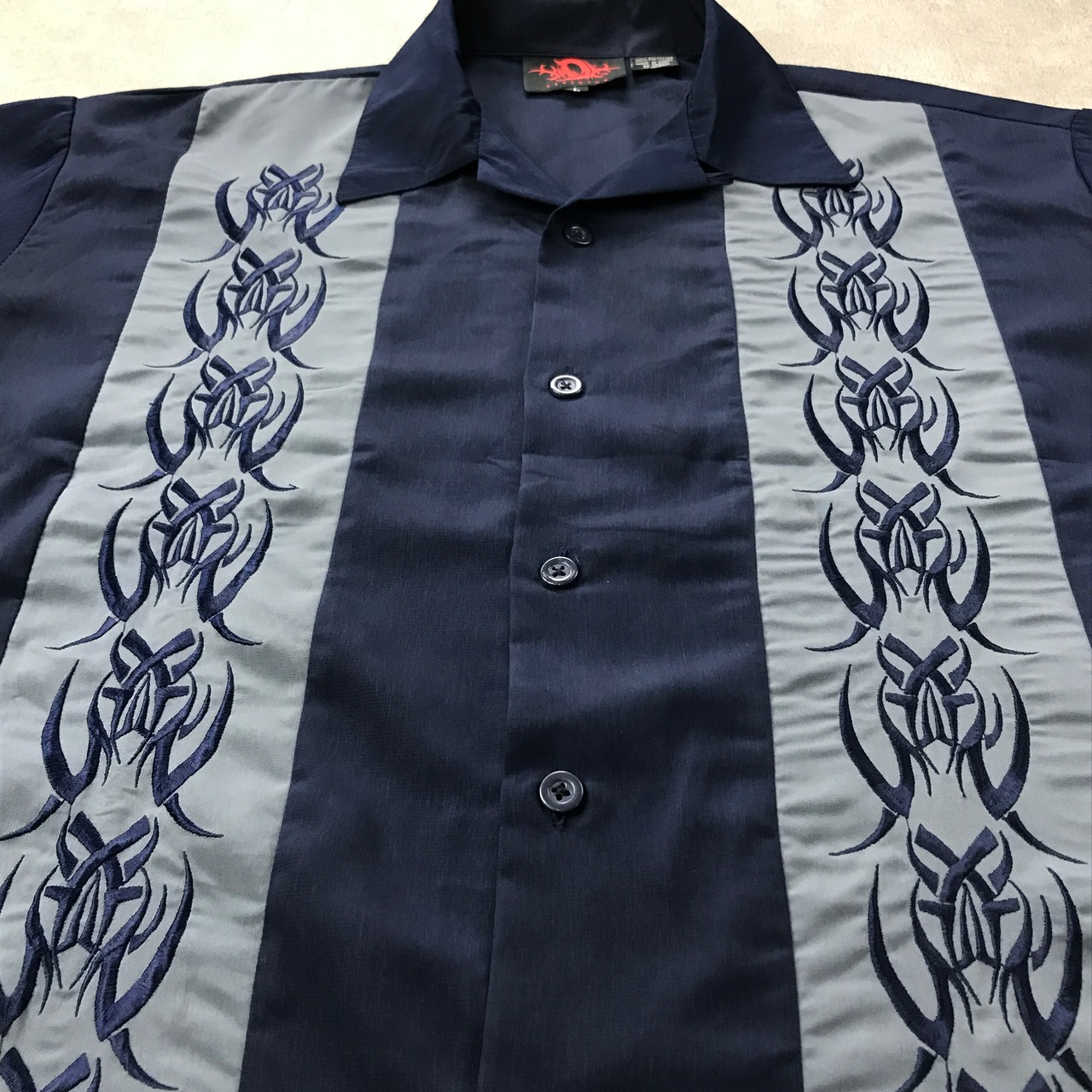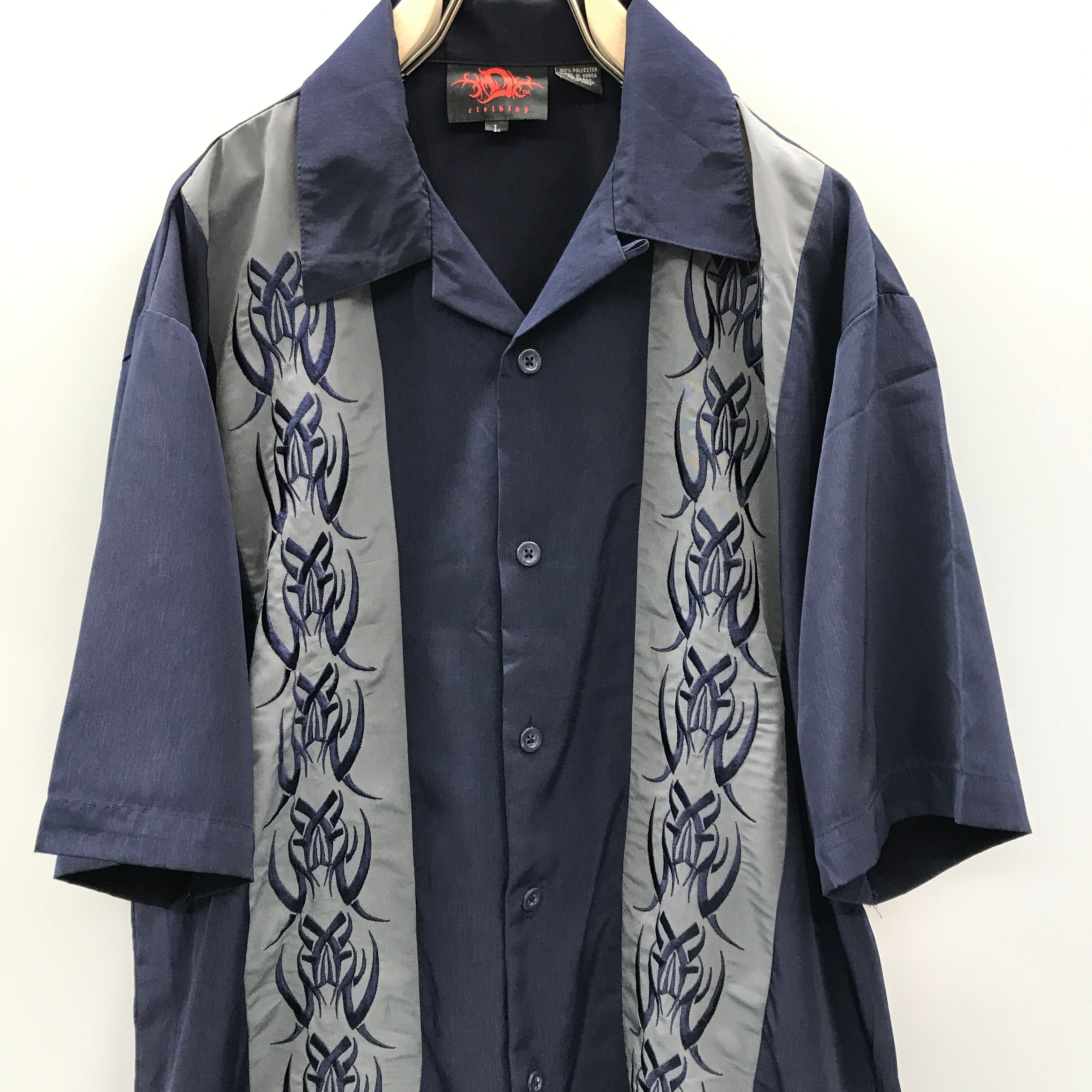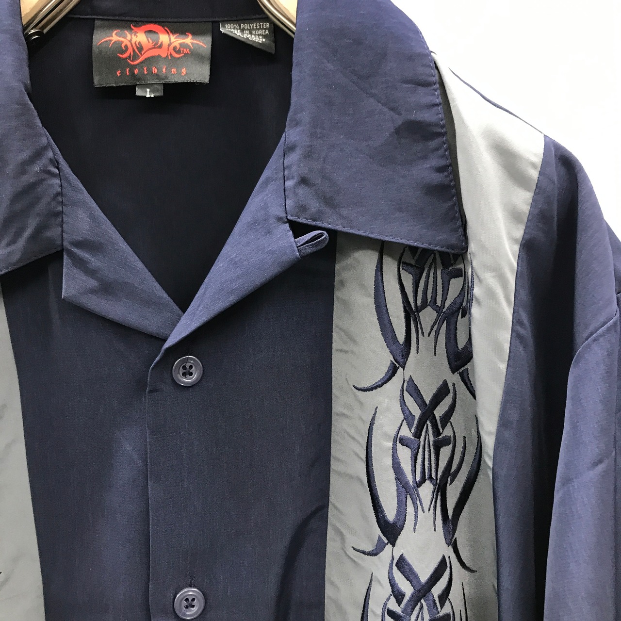 L 80〜90年代 D CLOTHING オープンシャツ ポリシャツ 紺グレー切り替え ピンストライプ風刺繍入り ロウブロウ ホットロッド ビンテージ