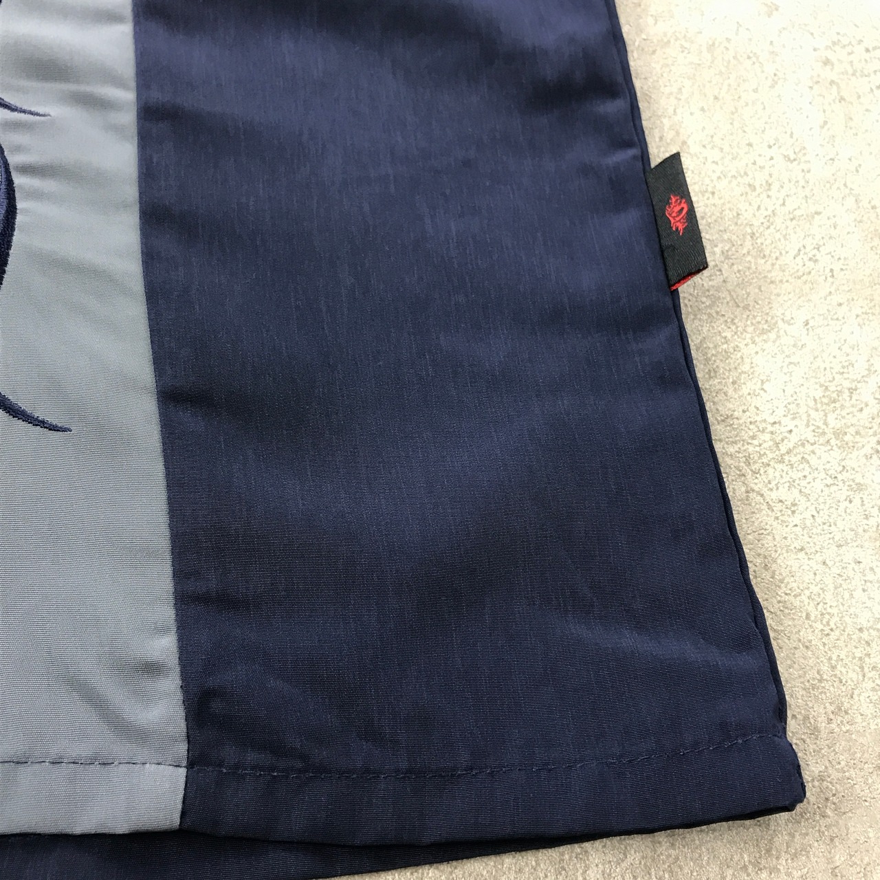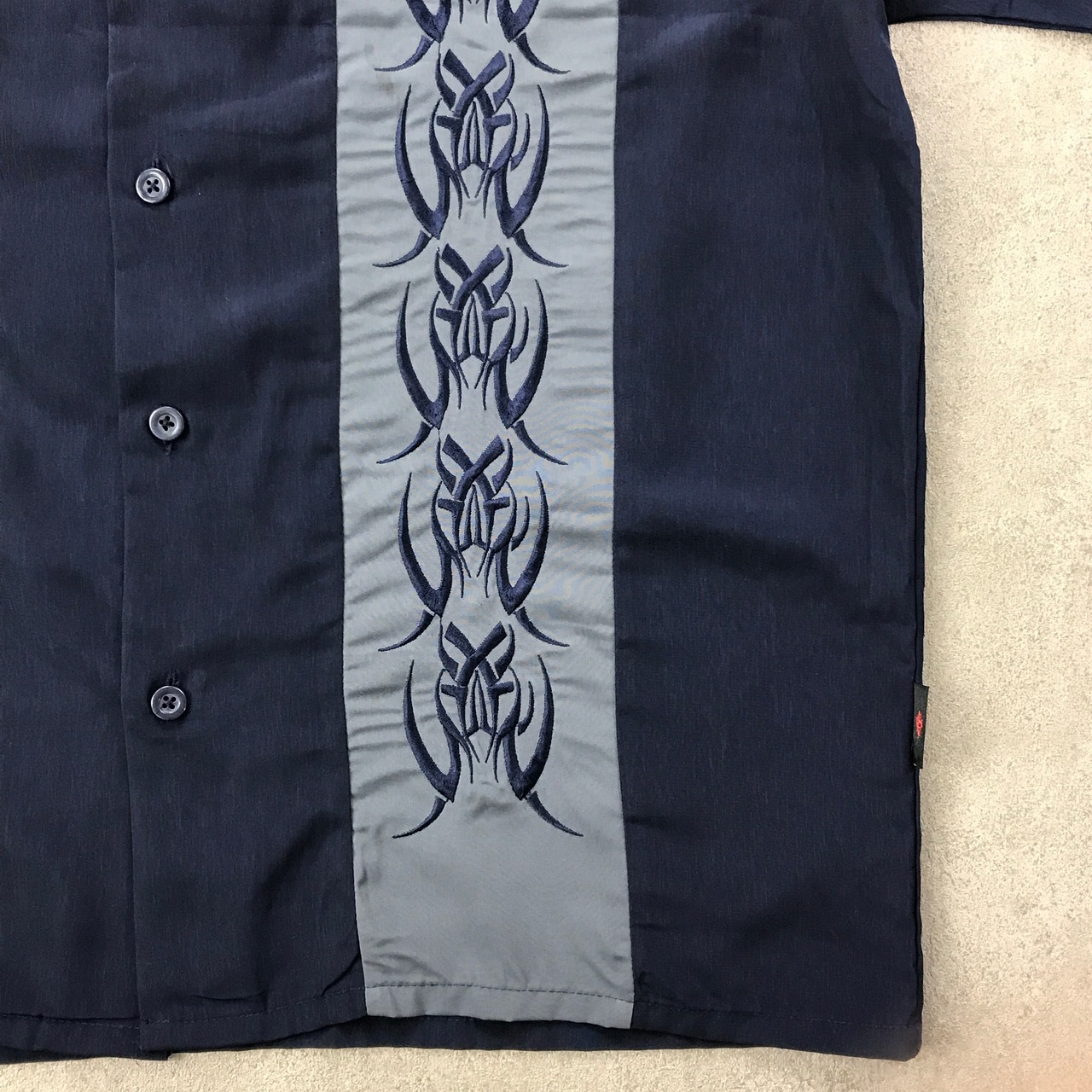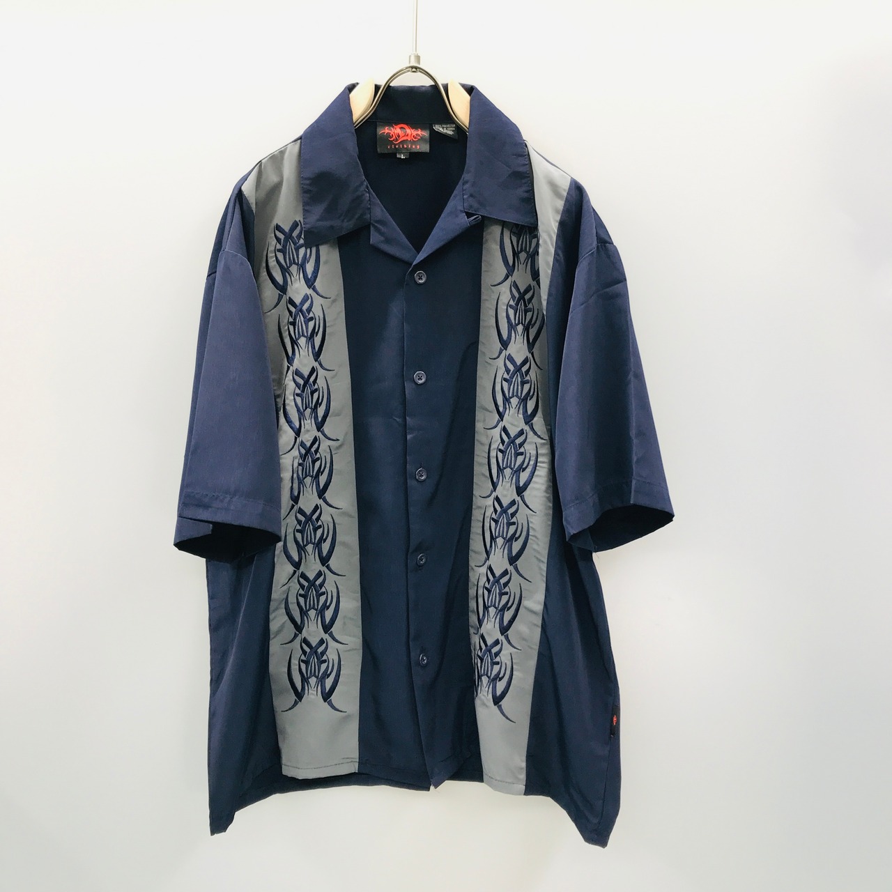 L 80〜90年代 D CLOTHING オープンシャツ ポリシャツ 紺グレー切り替え ピンストライプ風刺繍入り ロウブロウ ホットロッド ビンテージ