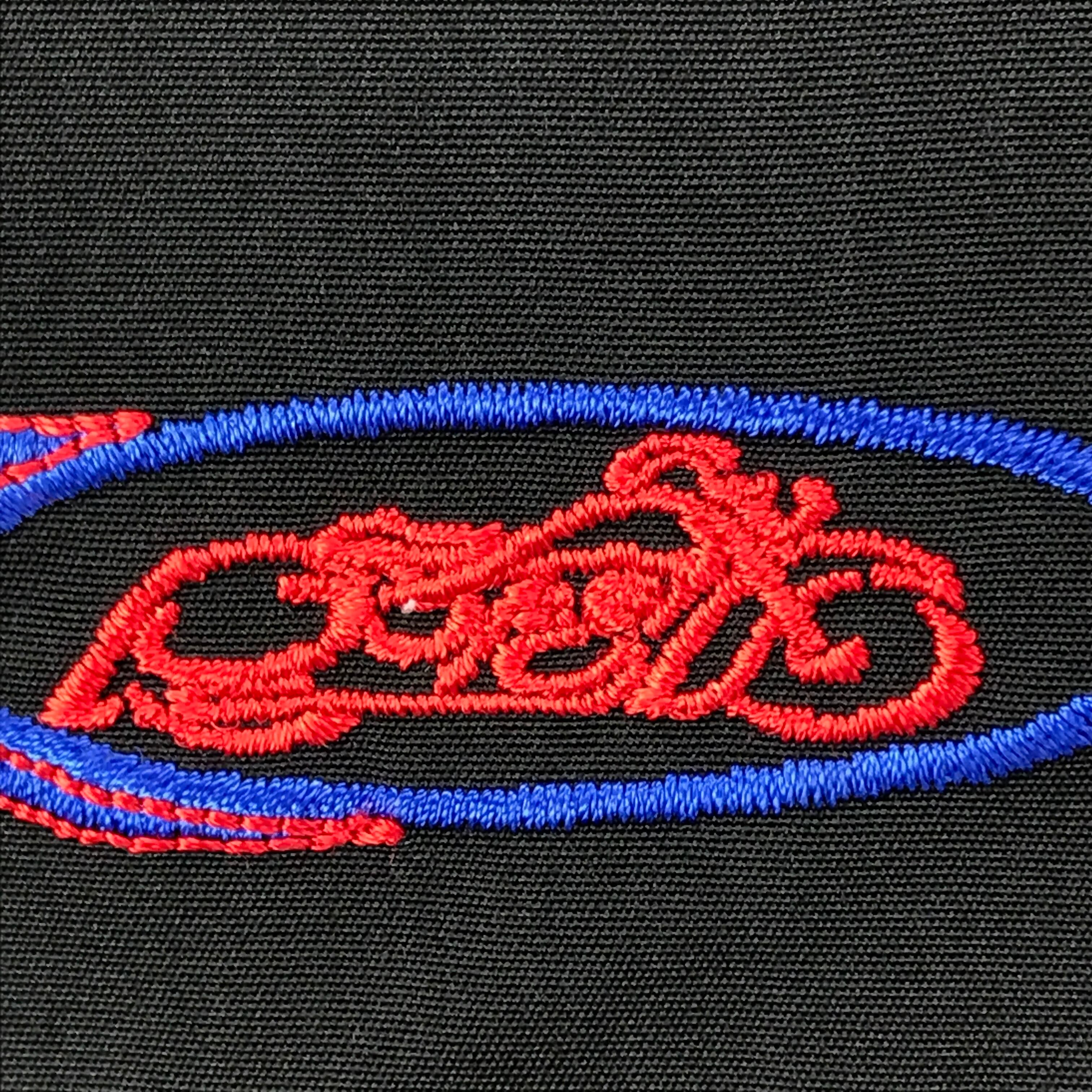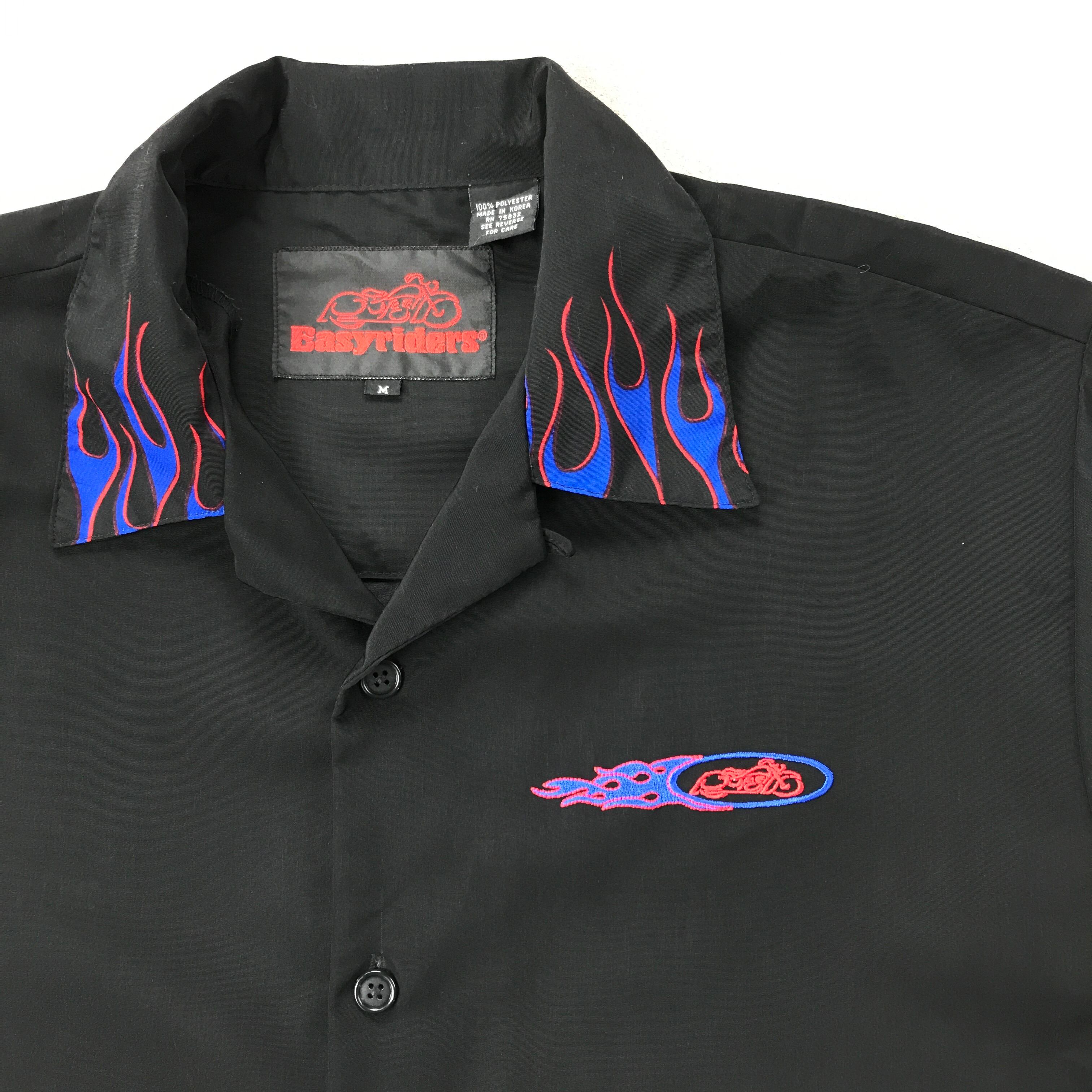 M 90年代 Easy riders ポリオープンシャツ ポリシャツ半袖 柄シャツ ブラック ファイヤーパターン フレーム柄 CHOPPER 刺繍入り ビンテージ アメリカンバイカー ライダース ハーレー MOTORCYCLE HOTROD HARLEY