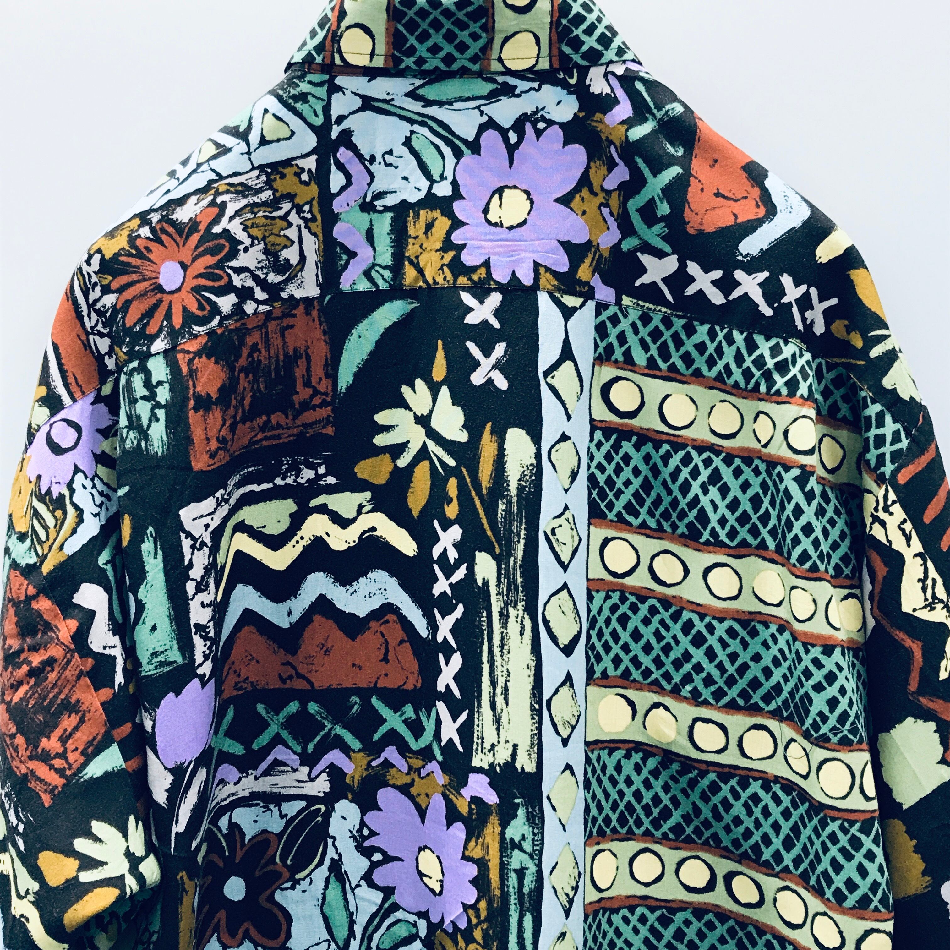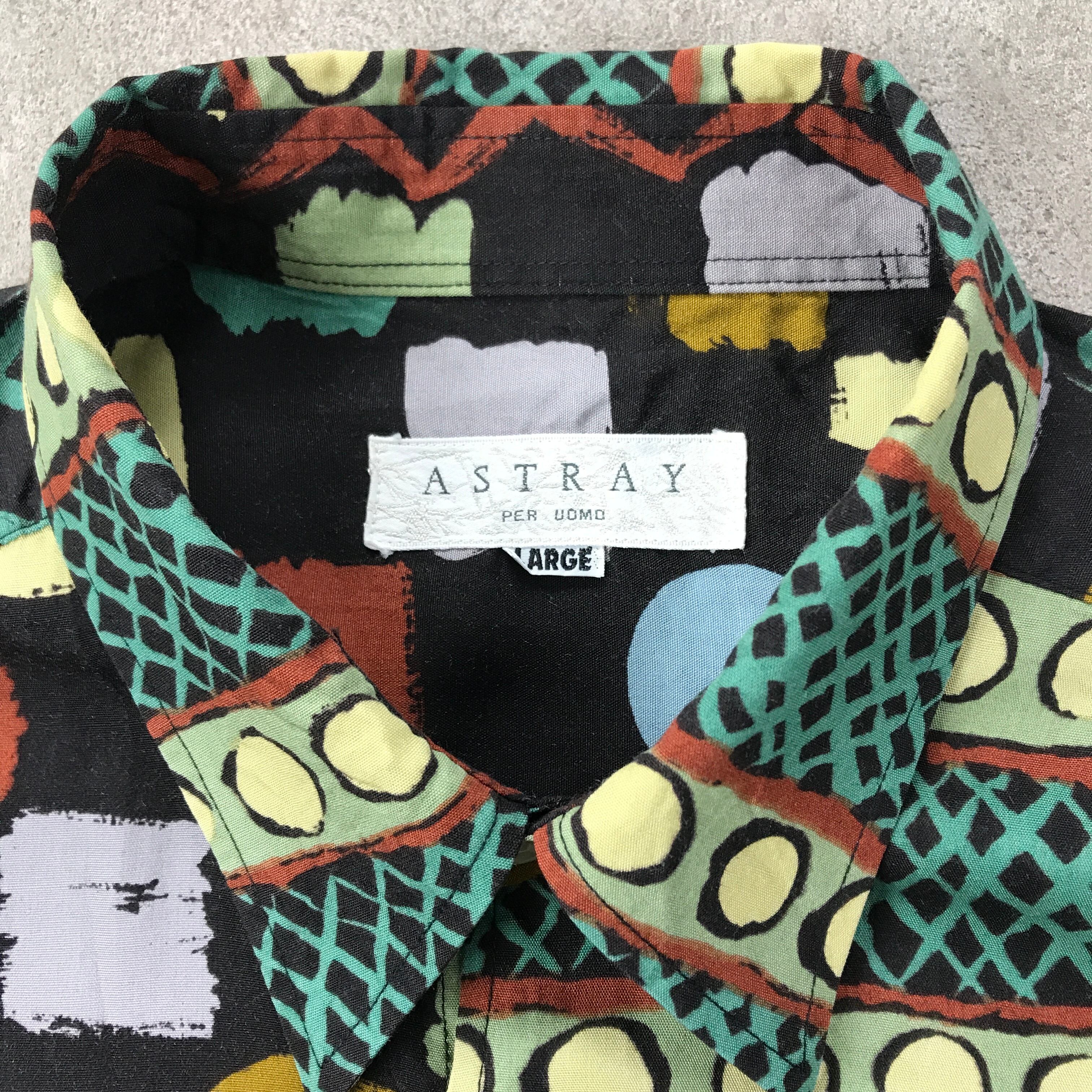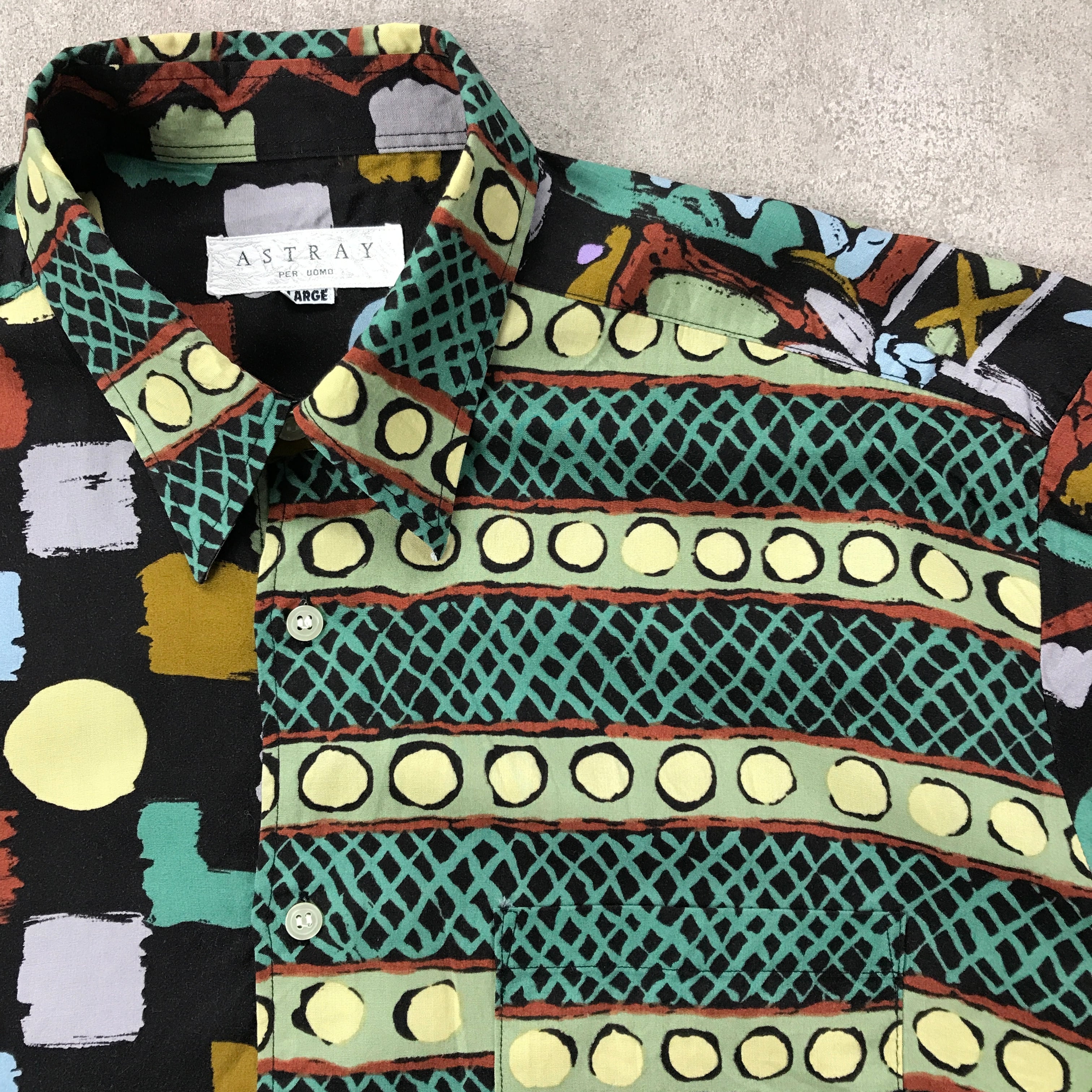 L 90年代JPN ASTRAY 総柄 レーヨンシャツ半袖 柄シャツ 黒地アート柄 FACTORY風