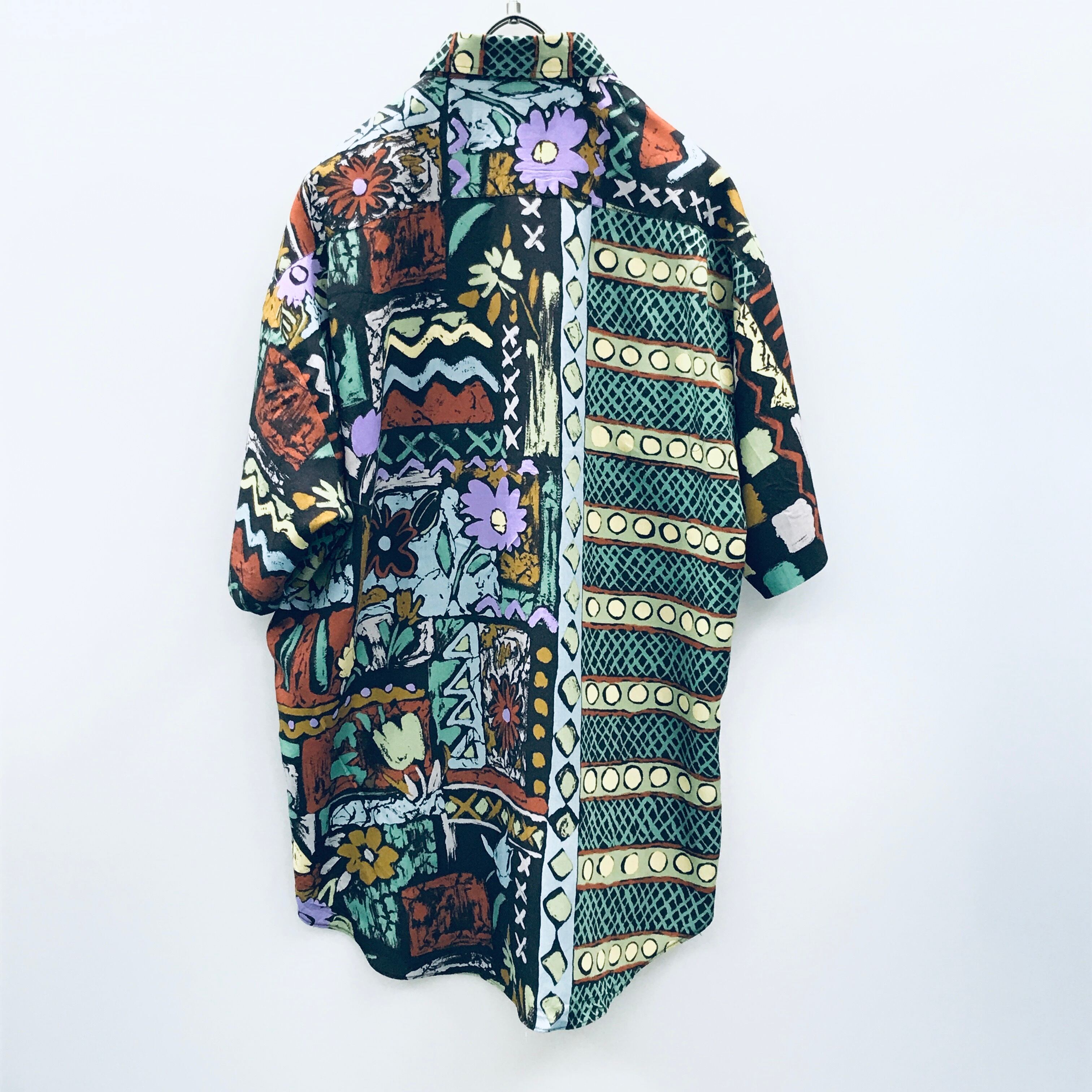 L 90年代JPN ASTRAY 総柄 レーヨンシャツ半袖 柄シャツ 黒地アート柄 FACTORY風 前後粋な切り替え ビンテージ