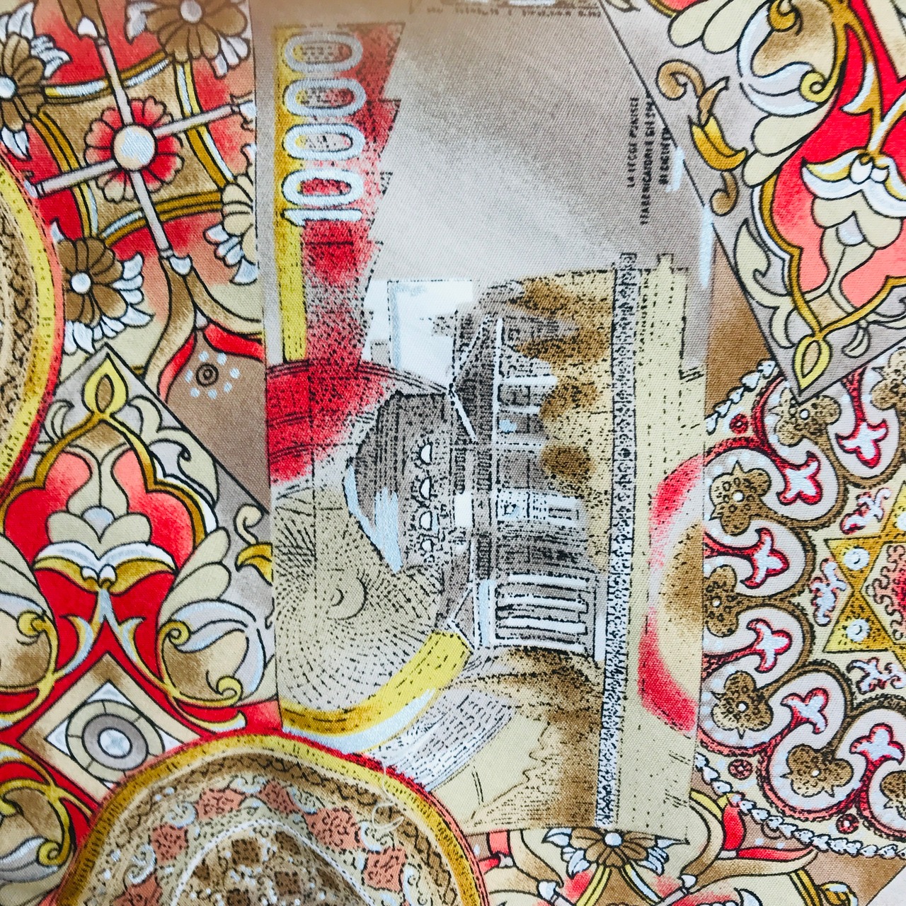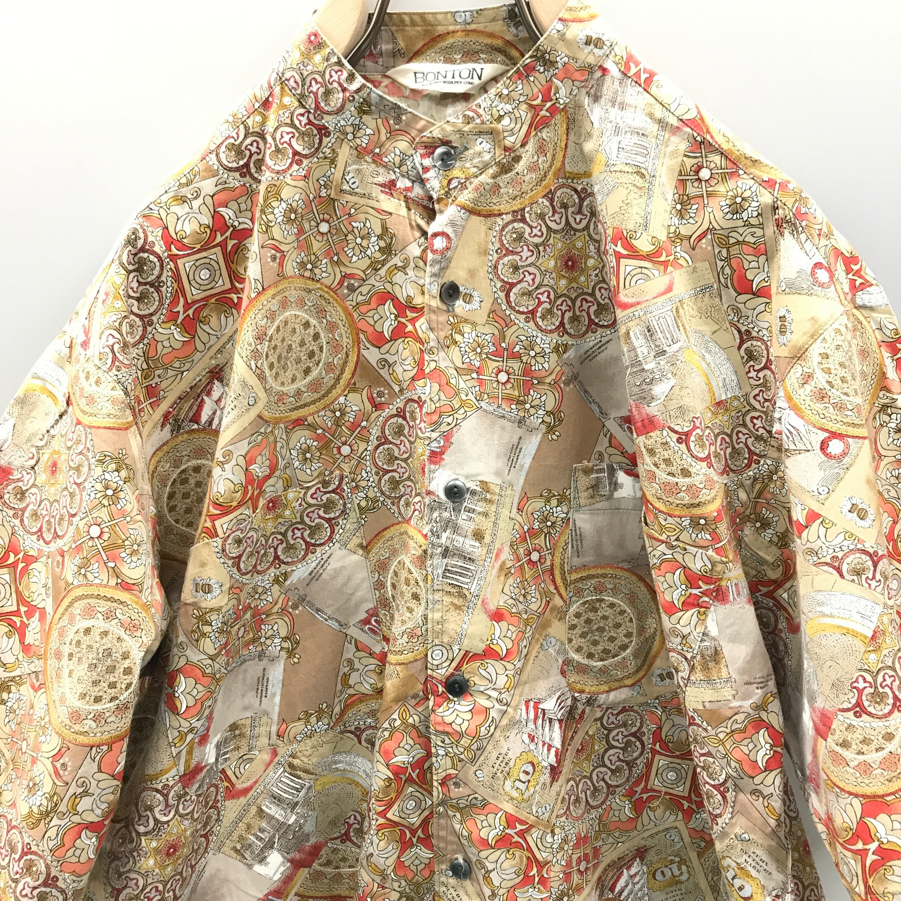 L 80年代 BONTON 総柄 ノーカラーシャツ 半袖 コットン柄シャツ ベージュとオレンジコラボ お金 お札入り ビンテージ スタンドカラー マオカラー MONEY