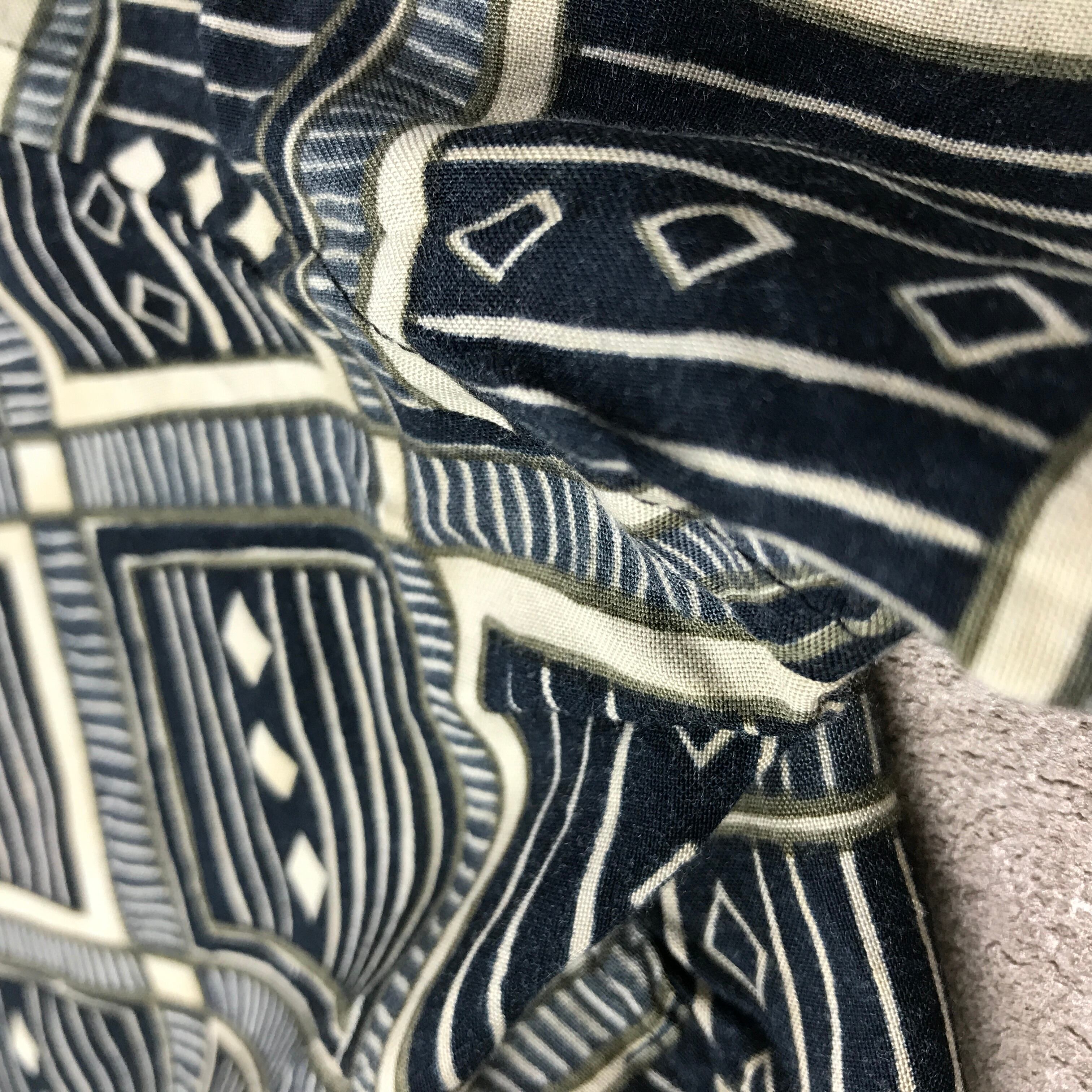 オーソドックスな着やすいレーヨンの生地です四角の淵のカーキ色が金属?銅?を表現していているようで上品な雰囲気を作っています