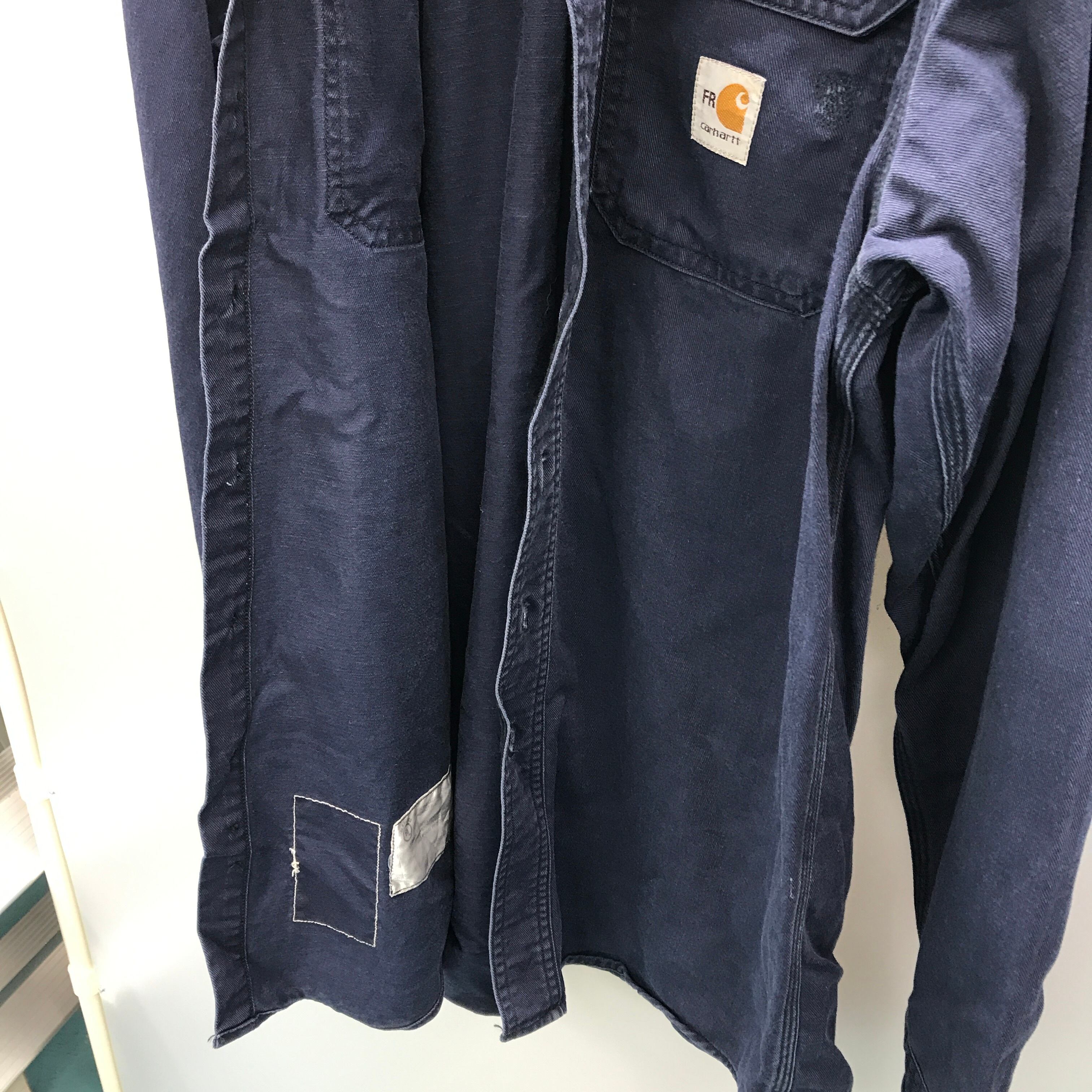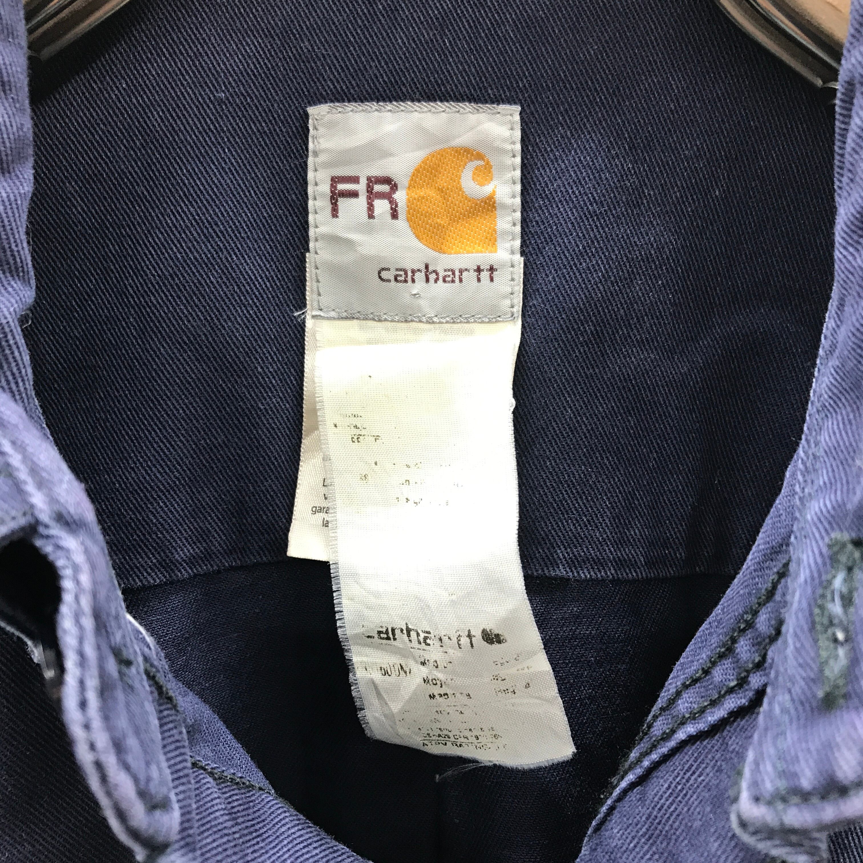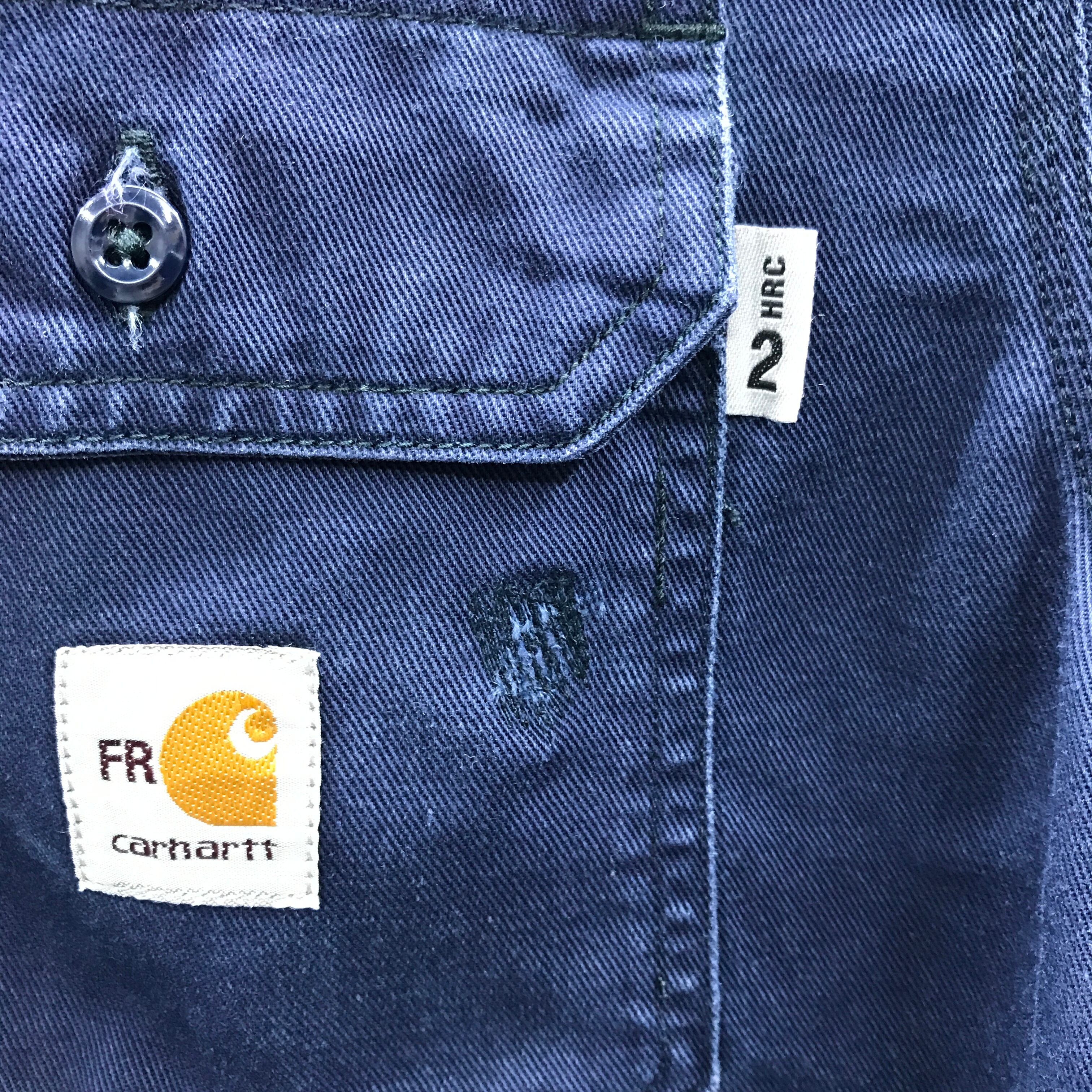 カーハートFR(Flame Resistant・難燃性素材)シリーズの厚手の長袖ワークシャツです。全体的に色あせ、左胸ポケット補修してます。両胸刺繍、左肩ワッペン付き。