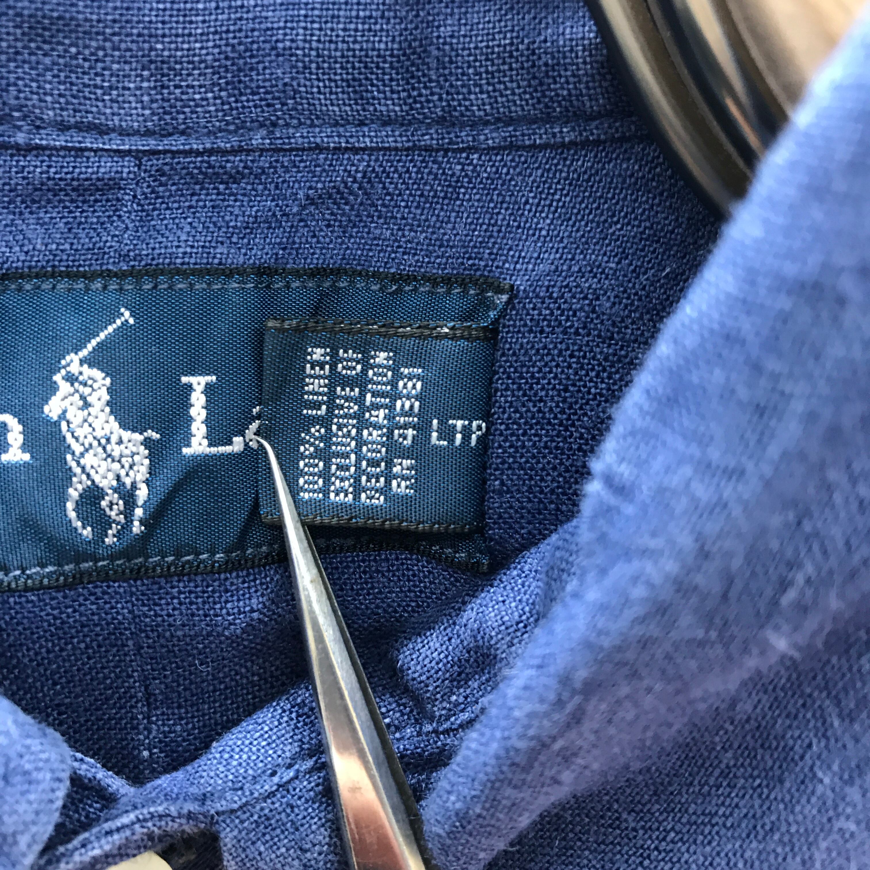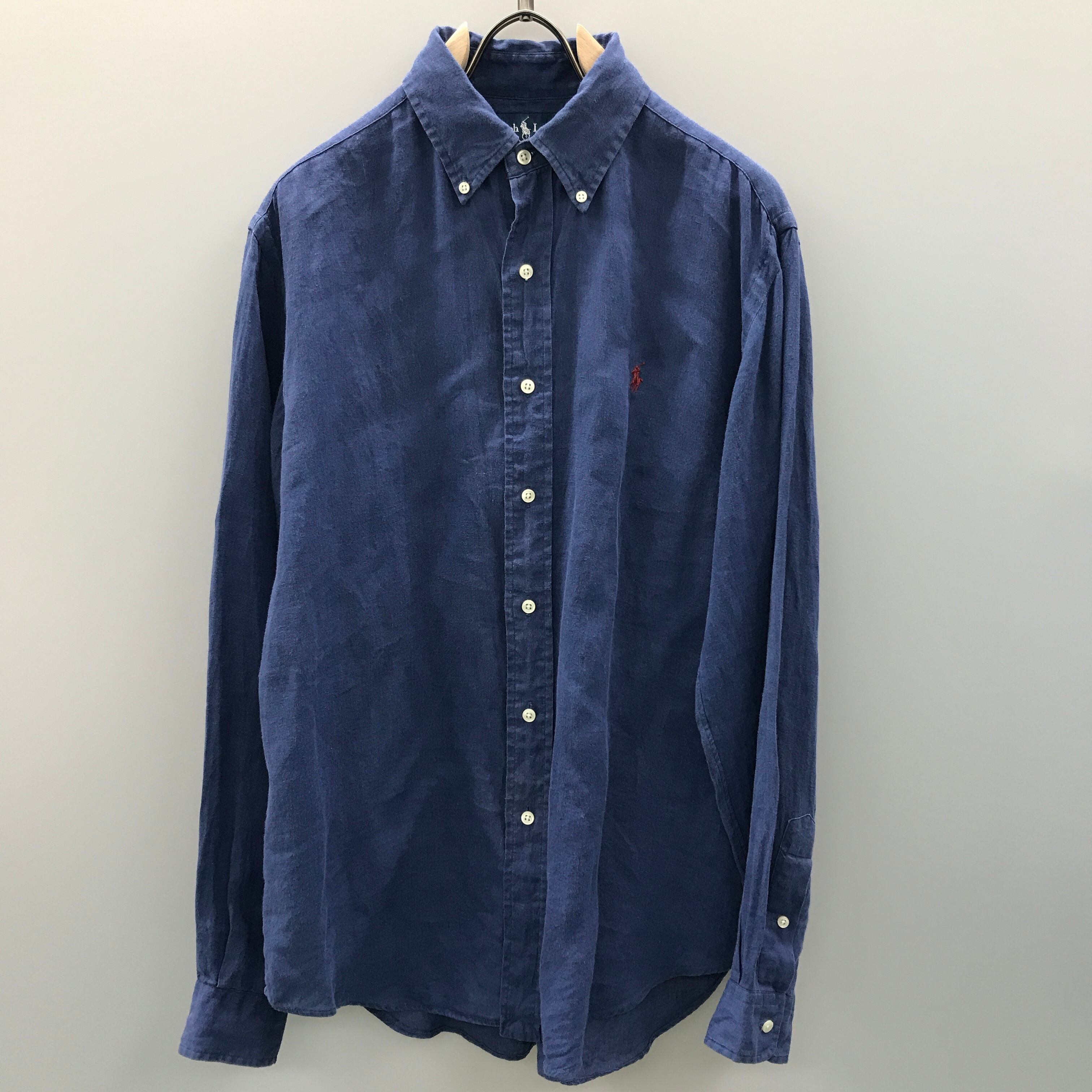 ラルフローレンリネン100長袖シャツ。なかなかお目にかからないワンランク上のアイテム。全体的に白っぽく洗い晒しのネイビーです。
