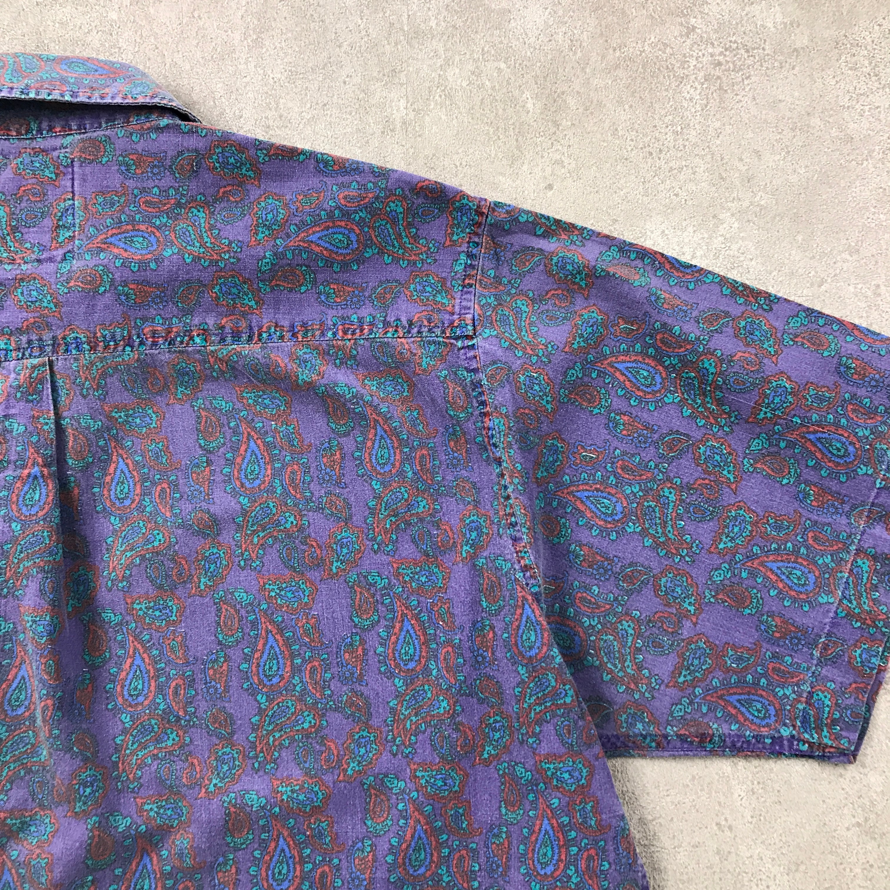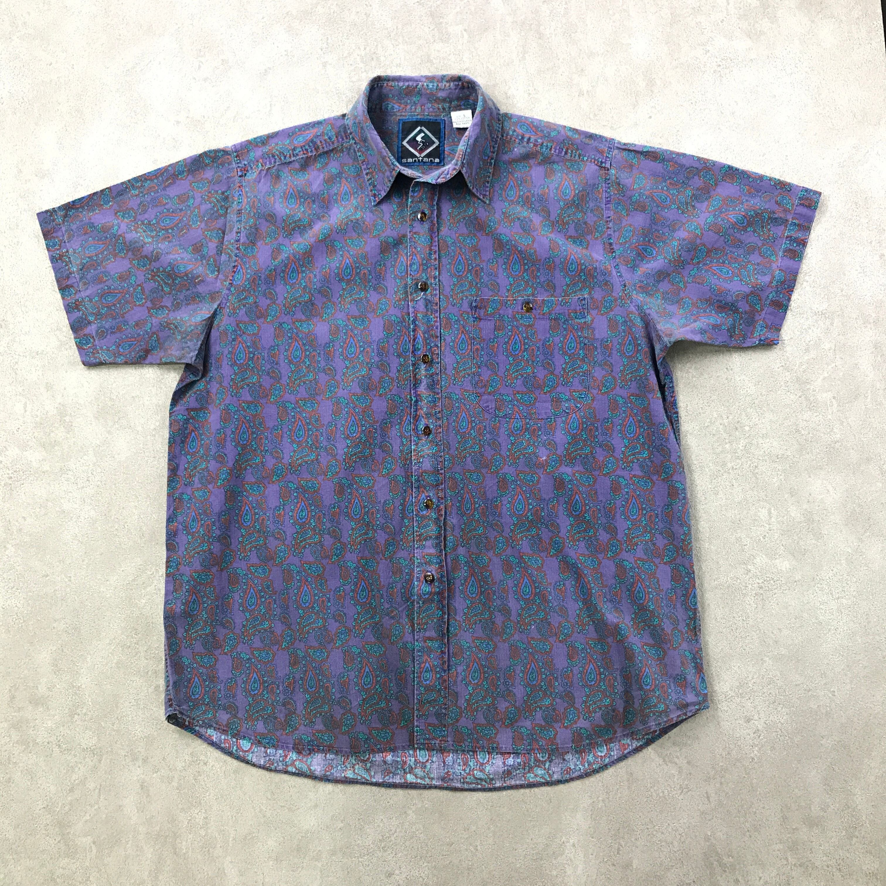 L 80年代 santana 総柄 コットンシャツ 半袖 柄シャツ ウォッシュアウトパープル地 ペイズリー柄シャツ ビンテージ