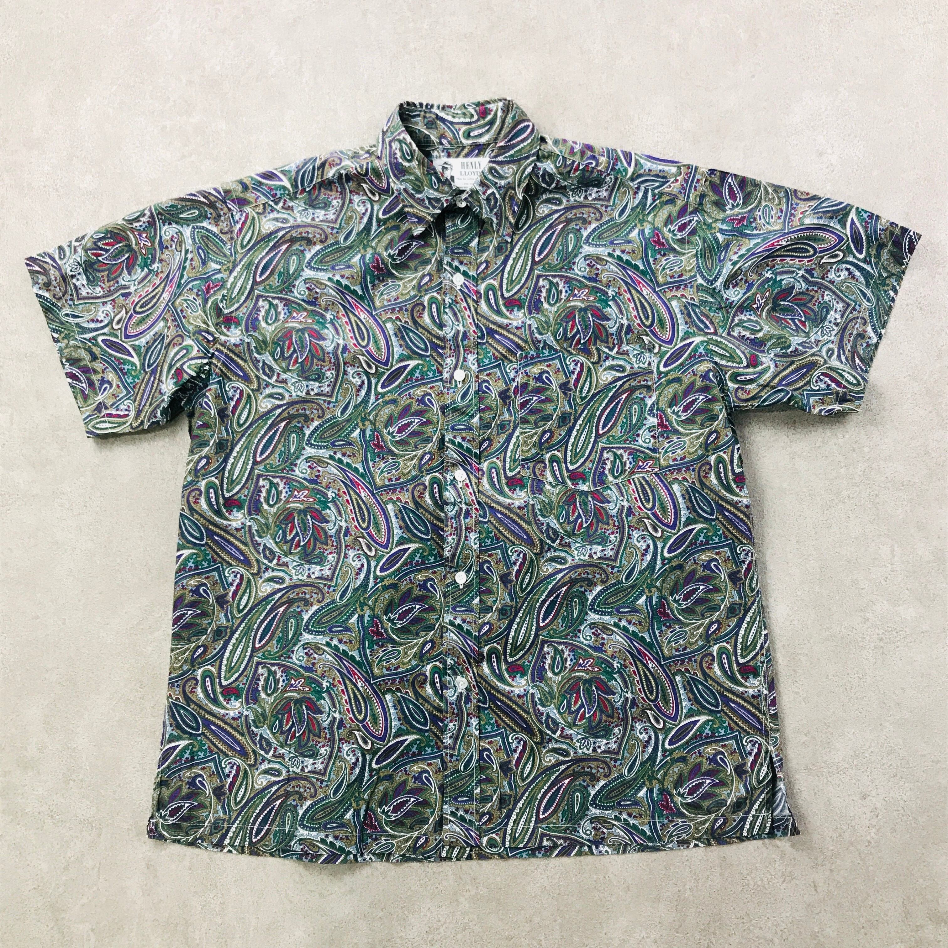90年代 HENLY LLOYDS 総柄 コットンシャツ 半袖 柄シャツ パープル・カーキ地 ペイズリー柄シャツ サイケ モッズ