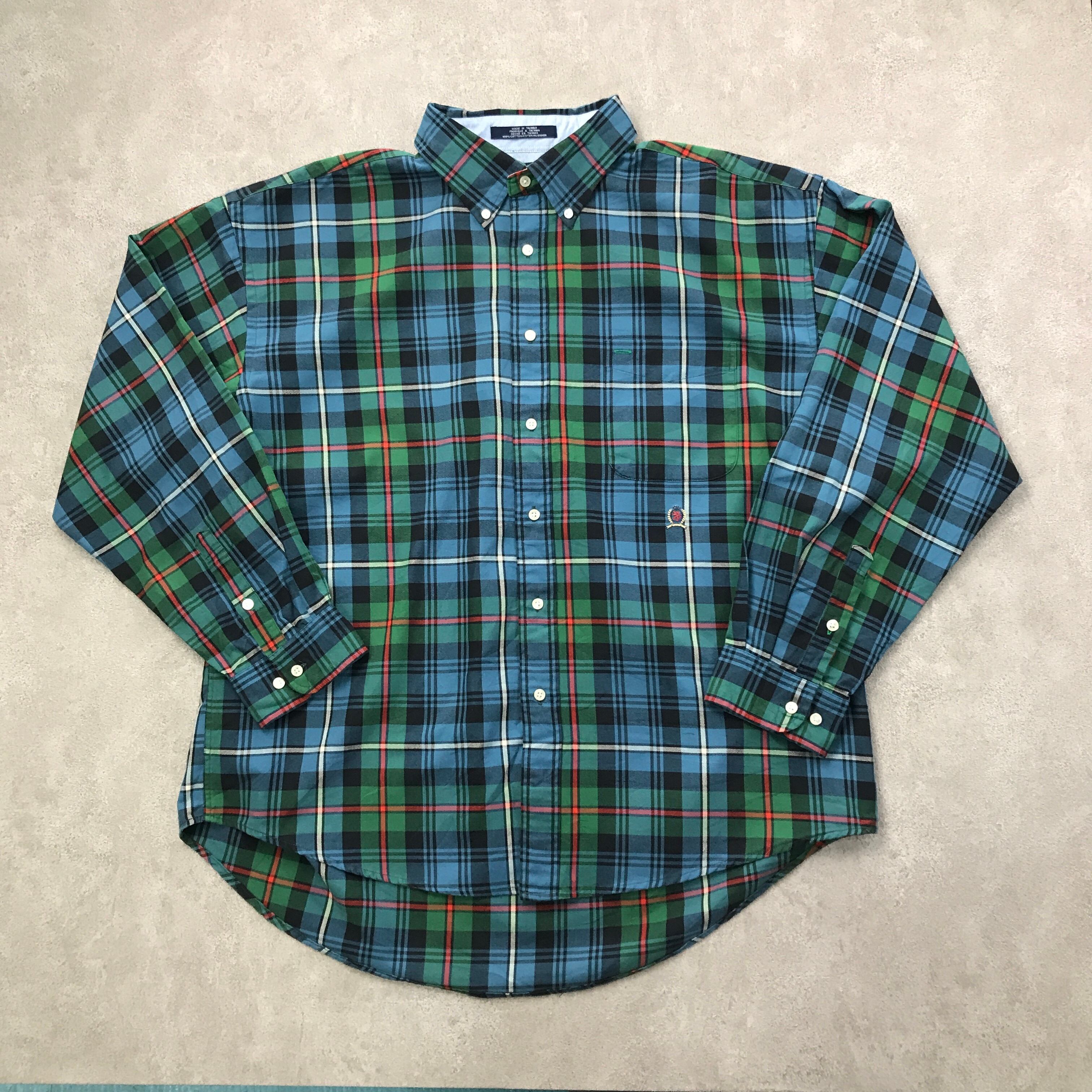 XXL 90年代 TOMMY HILFIGER トミーヒルフィガー コットン タータンチェックシャツ ボタンダウンシャツ 長袖 グリーンとブルー