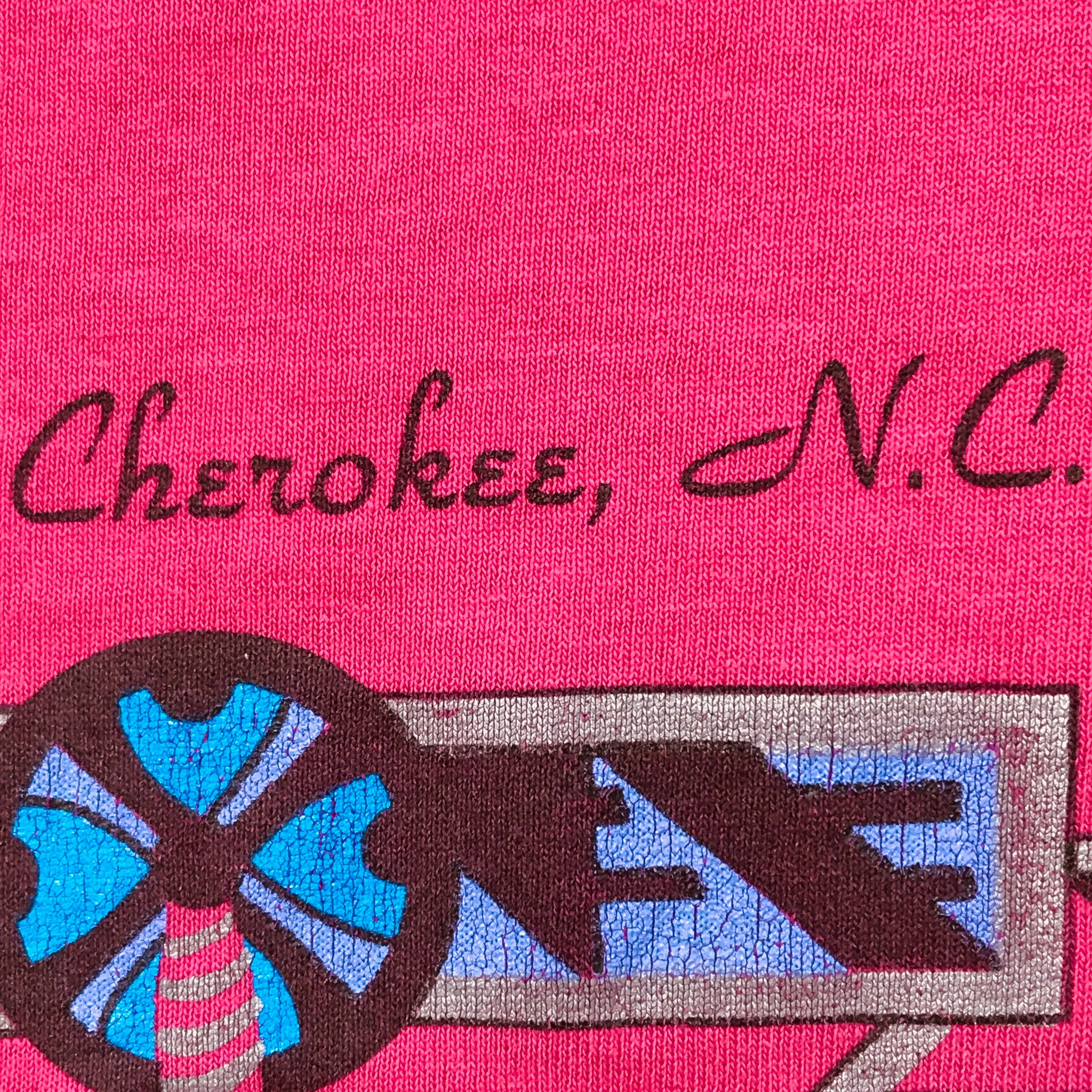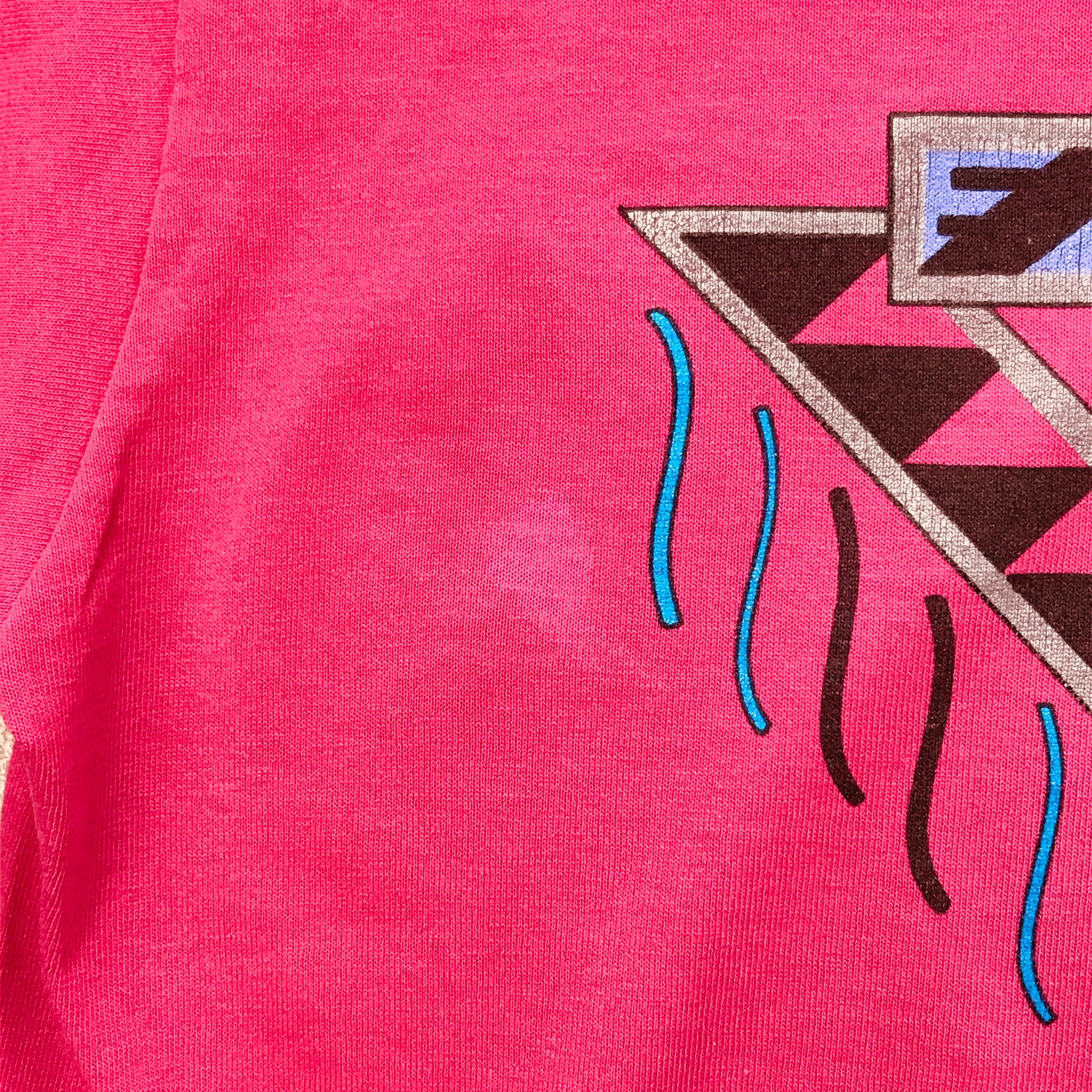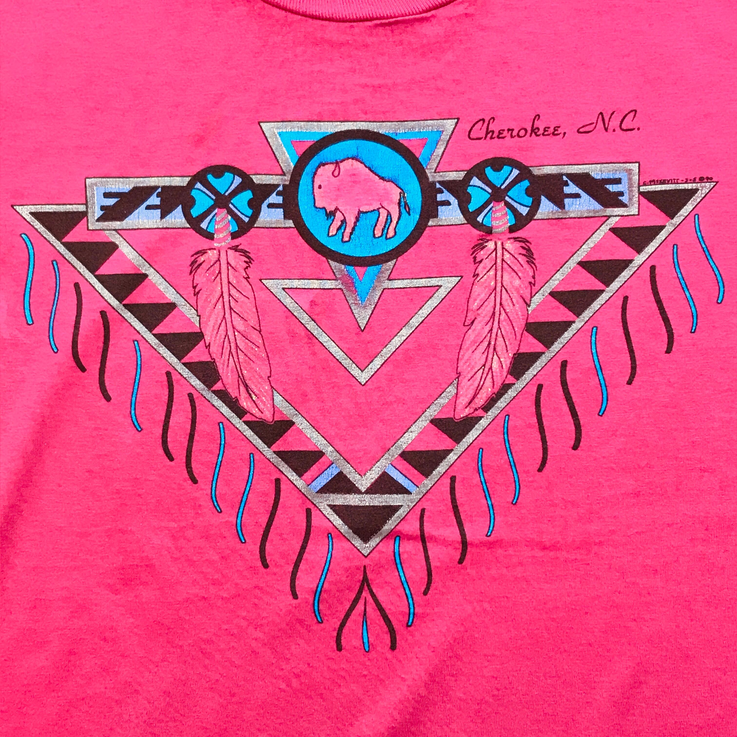 90年代 ホットピンク色! CHEROKEE N.C ラメ入り バッファロー・ネイティブ柄プリントTシャツ USA製 ヴィンテージ MADE IN USA