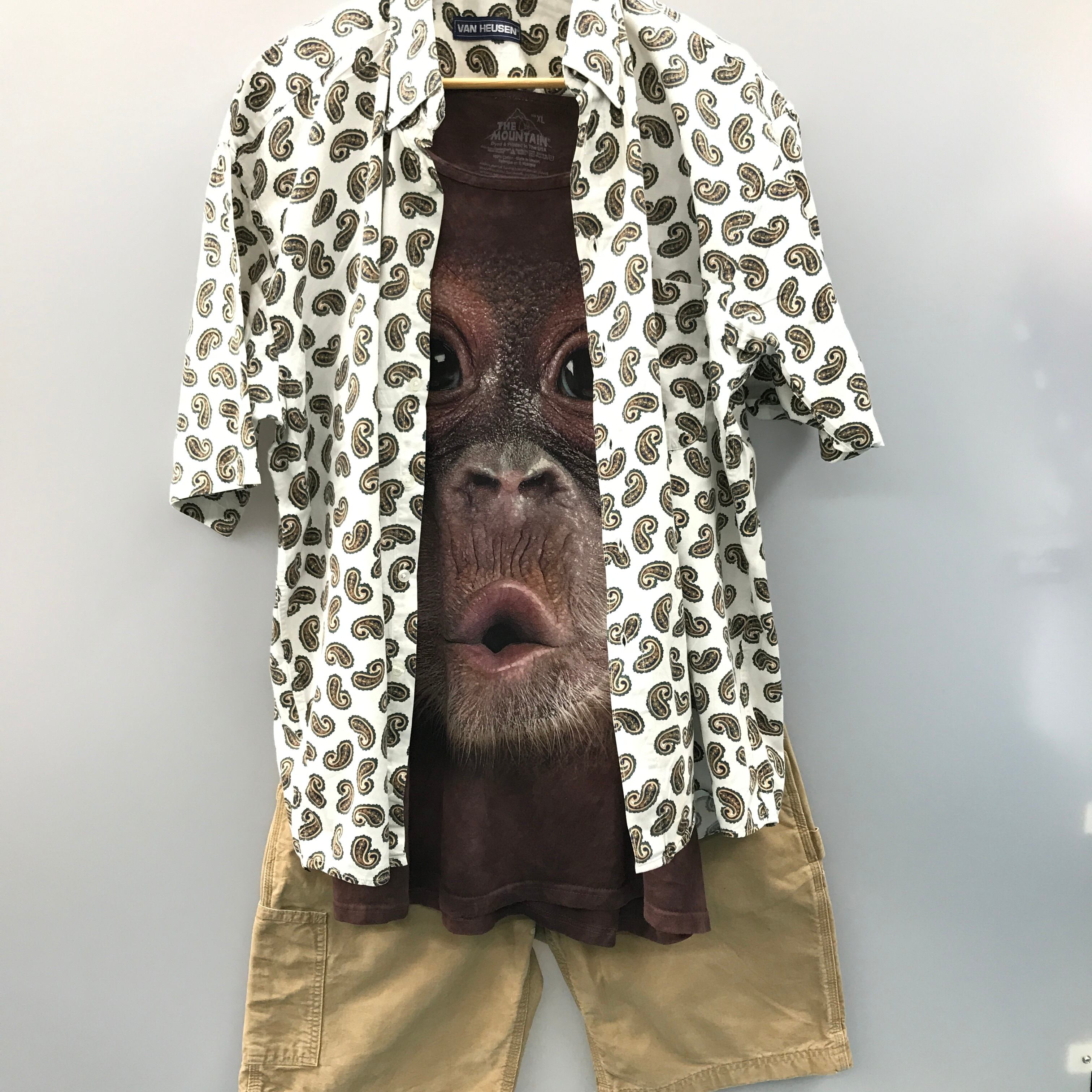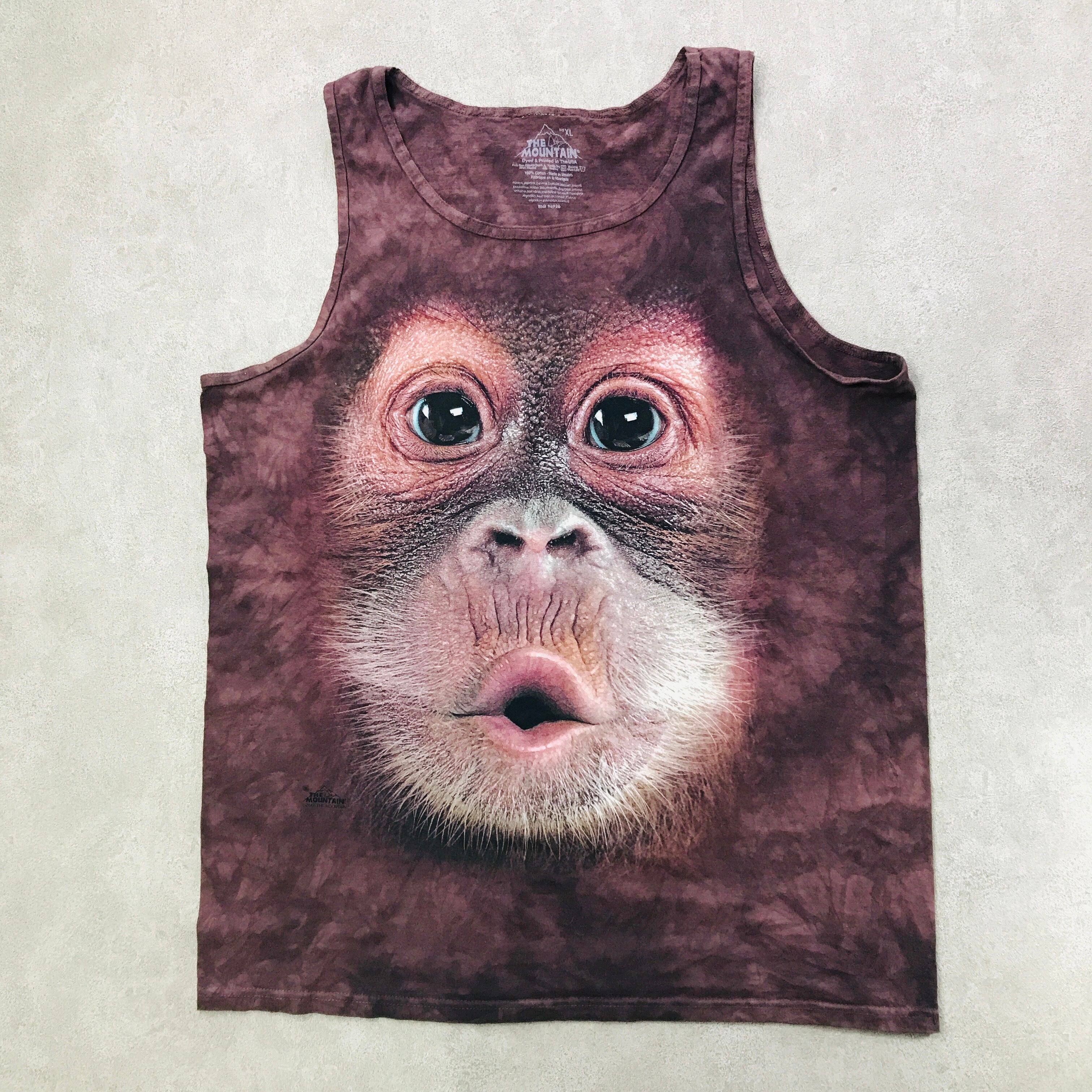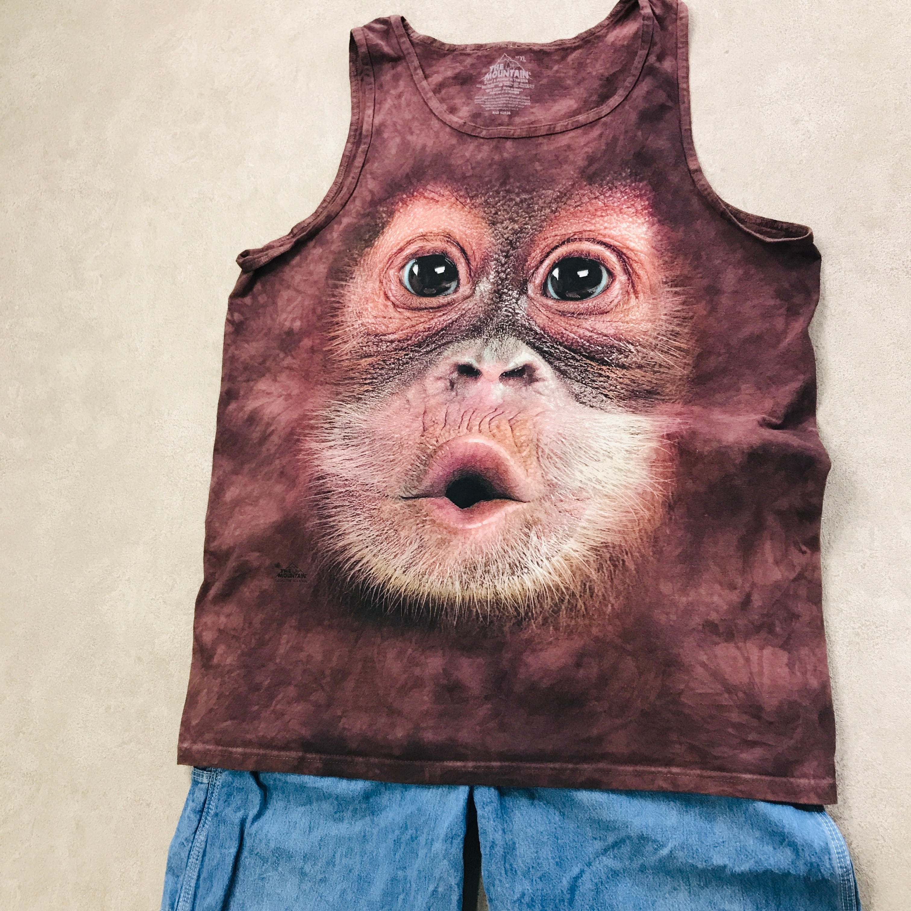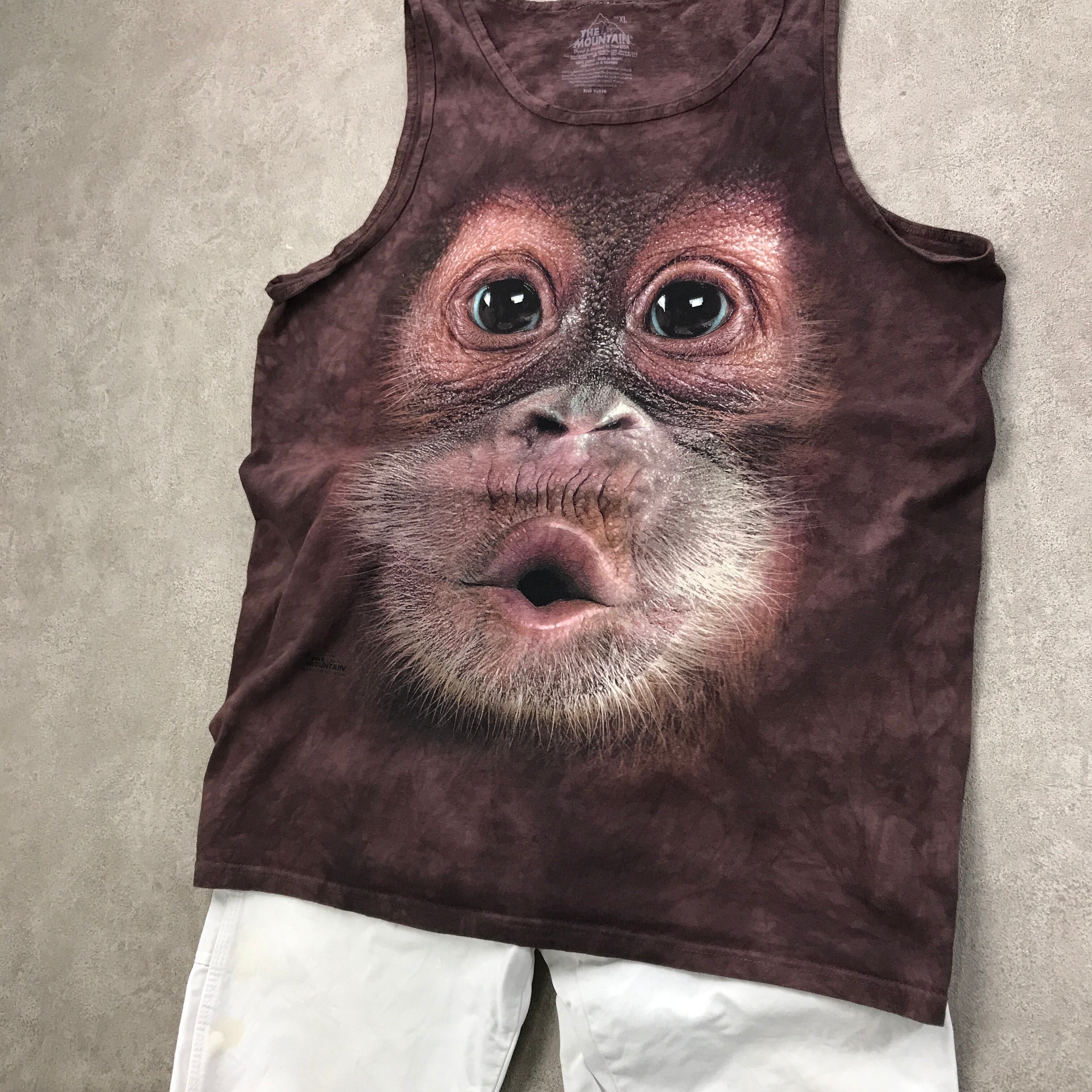 XL THE MOUNTAIN オラウータン baby Orangutan 赤ちゃんアニマルビッグフェイスプリントタンクトップ タイダイ ザ マウンテン ブラウン