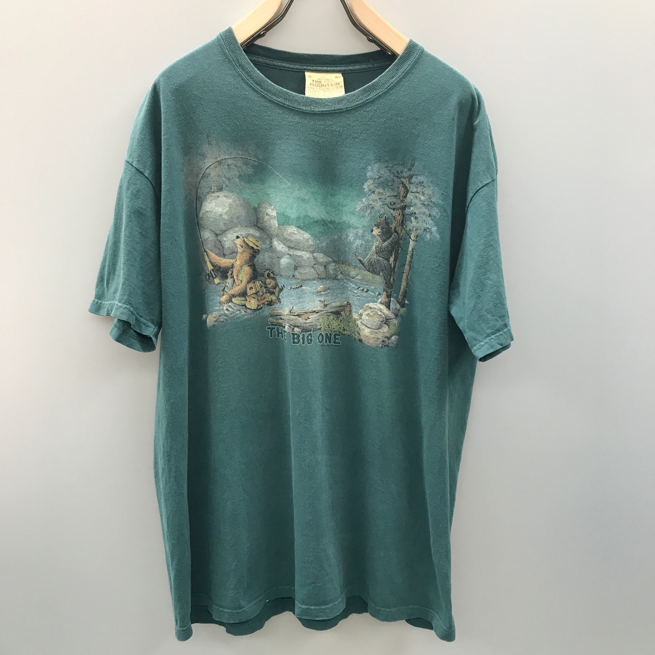 マウンテンらしくないかわいいクマが大物を釣っているプリントです。全体的に白っぽく色あせて、腹部に汚れ、前面スソにペンキ汚れがあります。かわいいので是非!