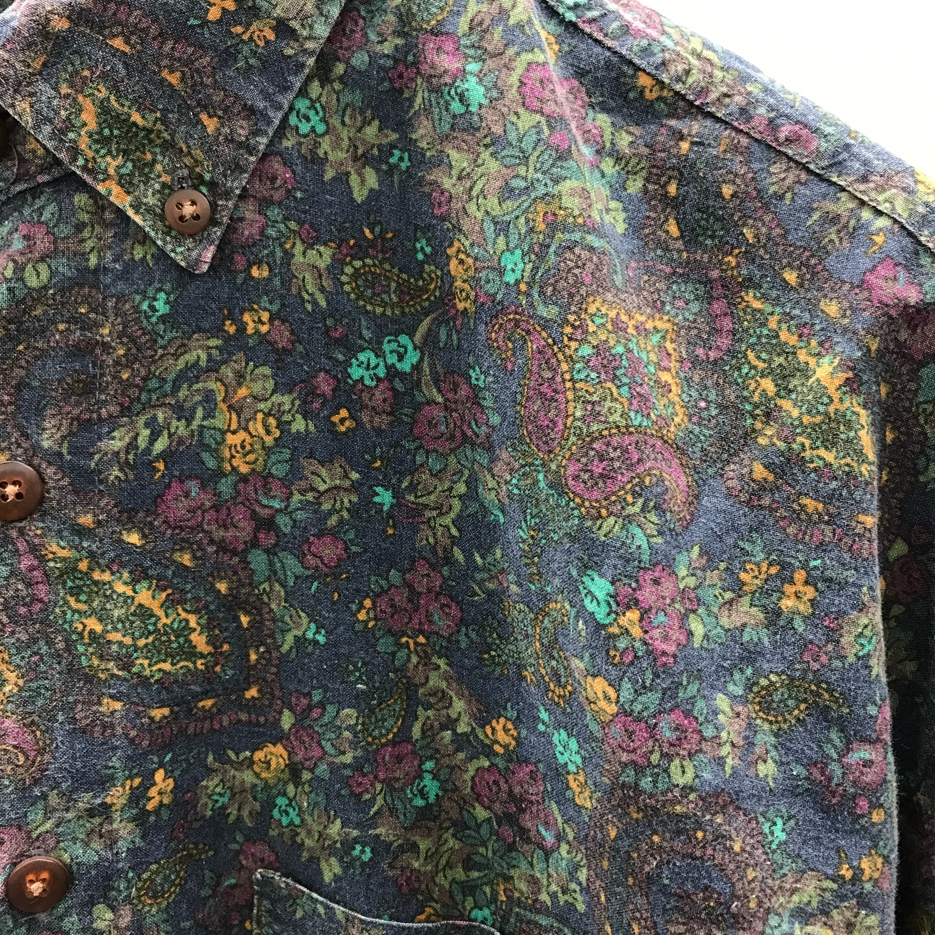 USA製のペイズリー柄シャツです。落ち着いた雰囲気がある配色です。全体的に洗い晒した色あせが有ります。裏地みたいでかっこいいですよ。