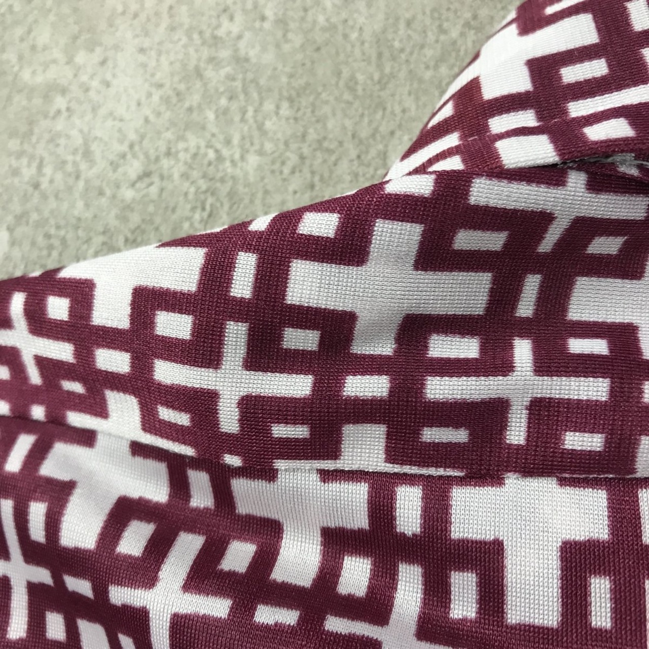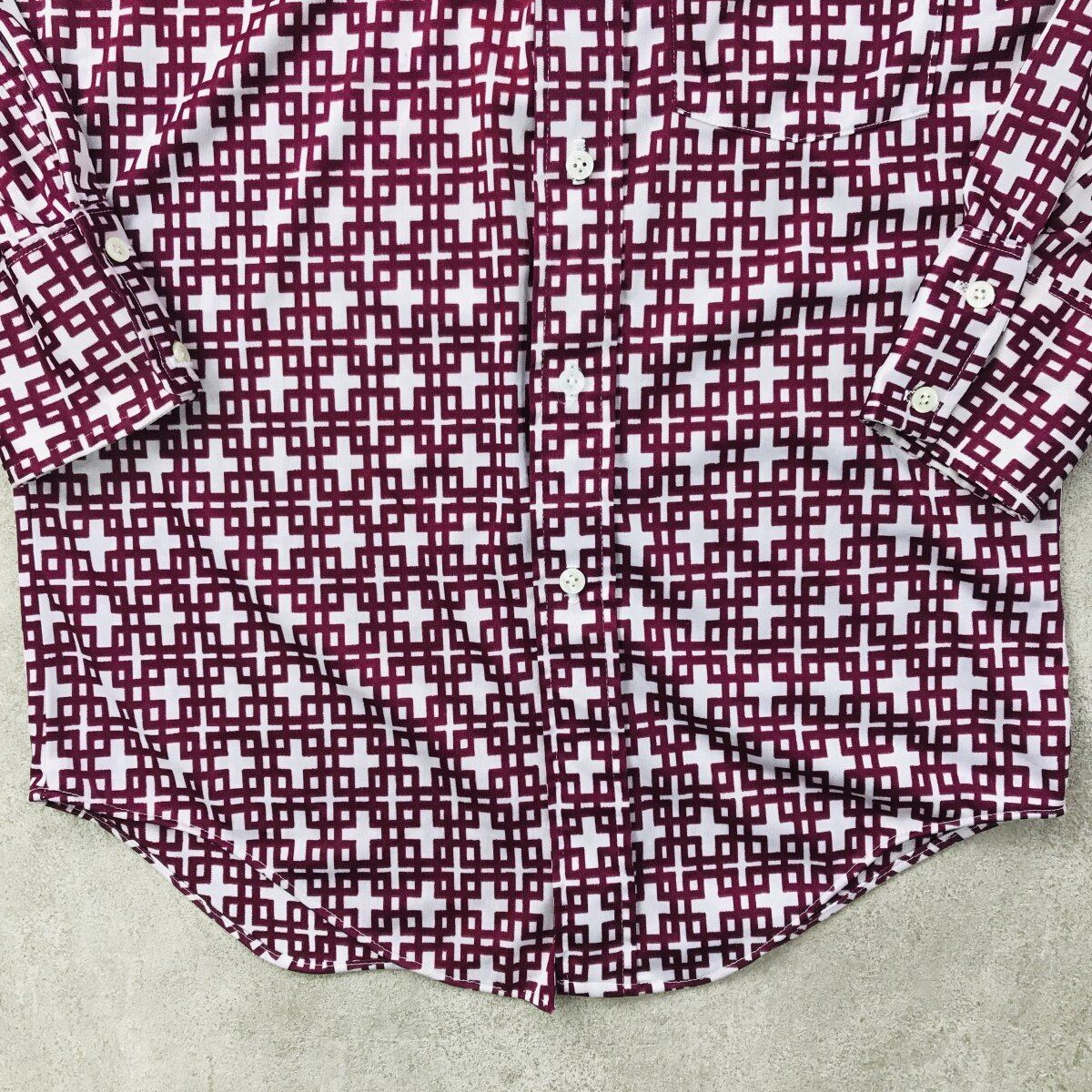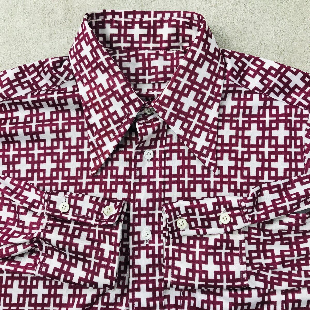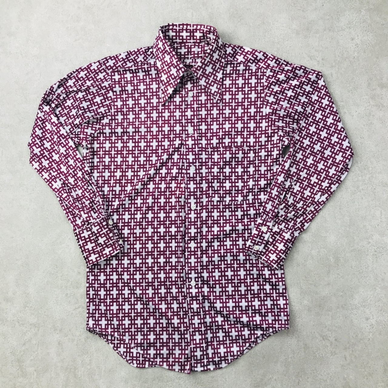 70年代 十字クロス 連続 柄シャツ えんじ ポリエステルシャツ