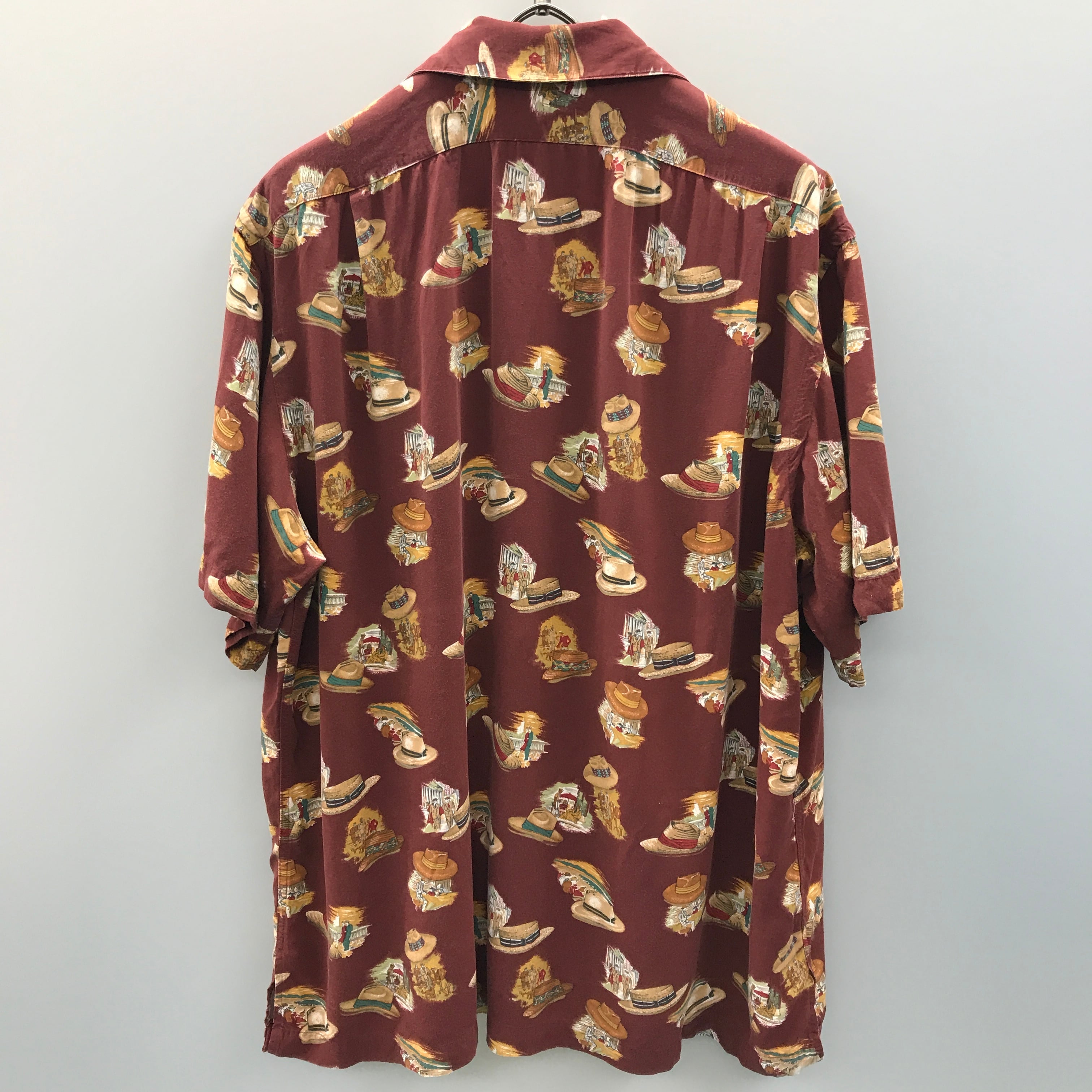 珍しい made in USA オープンカラーのアロハシャツです。カンカン帽やハットの柄がクラシカルでいい感じです。右腹部に小さいキズ、左袖に小さな穴があります。洗い晒した生地がヴィンテージっぽい雰囲気です。