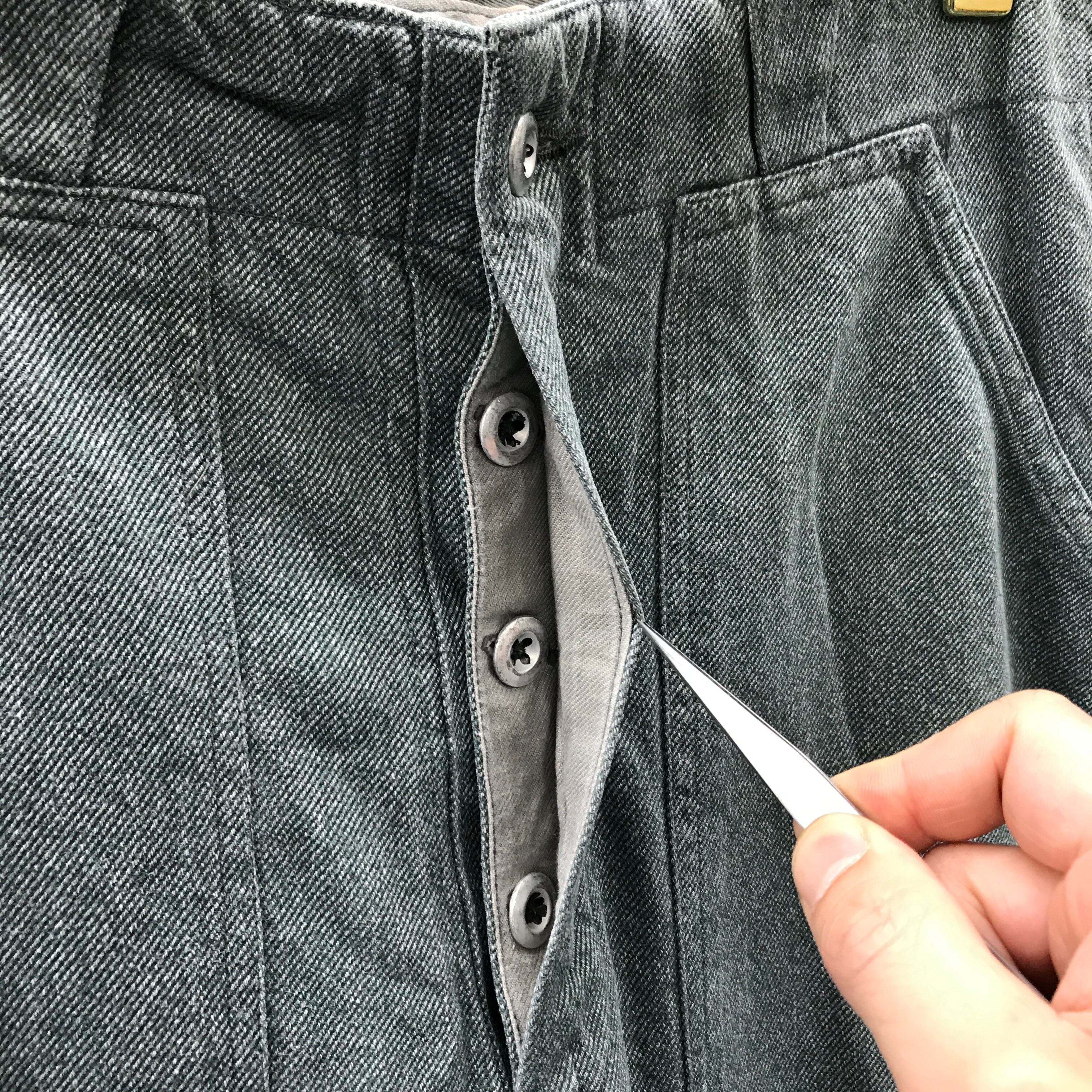 ボタンフライ仕様で、サスペンダーボタンも付いていて、ボタンはメタルボタンになります。オンスが高めでがっしりとした厚手のデニム生地。