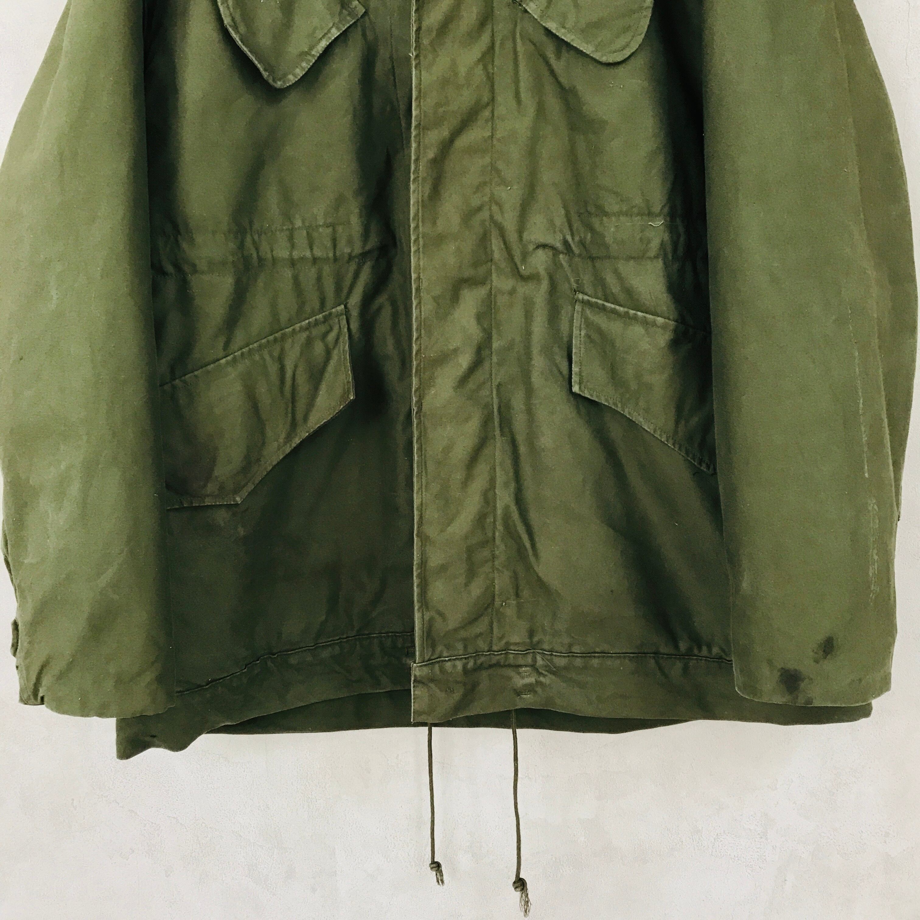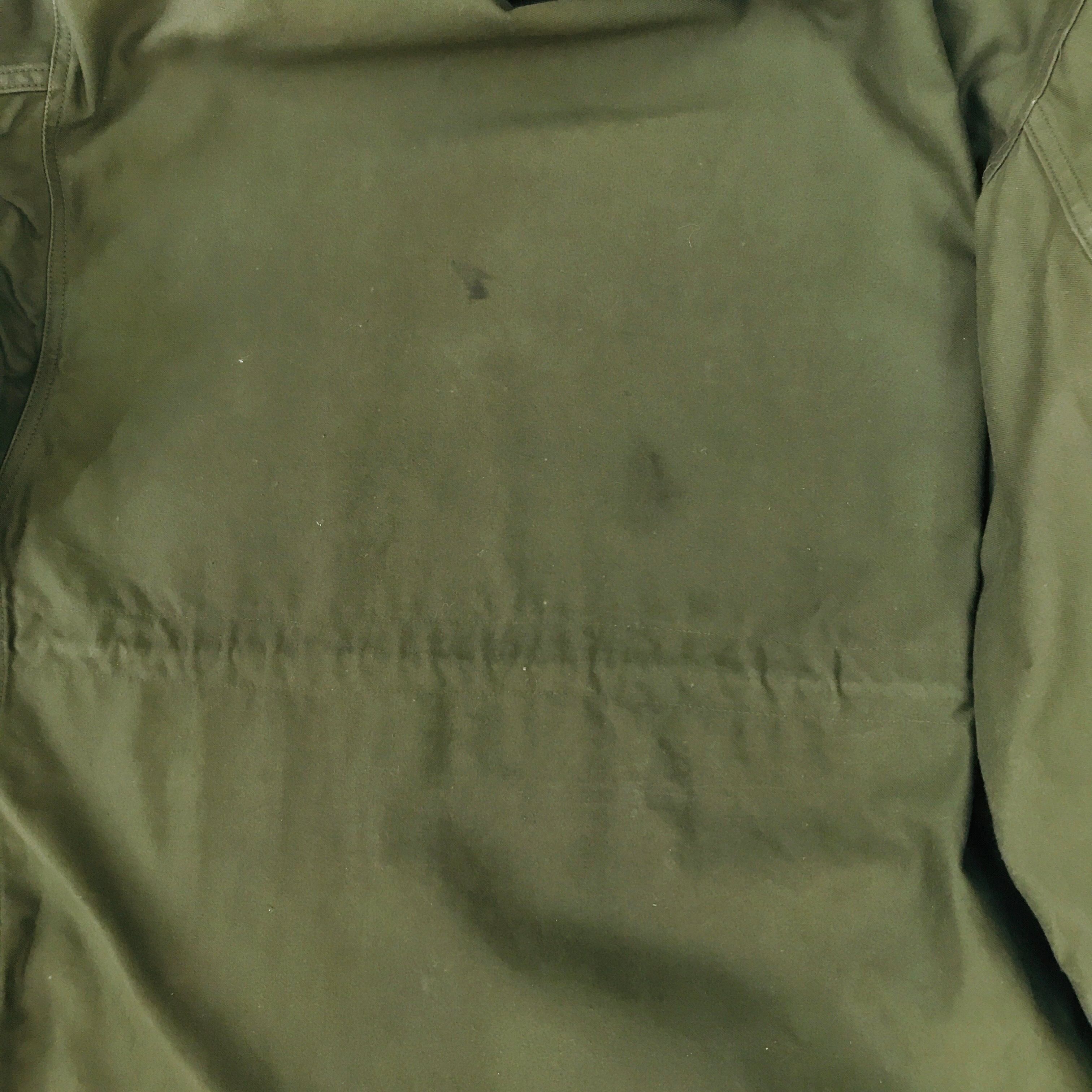 前下あたりと肘に擦れ、うすい汚れ、右裾にオイル系の汚れあります