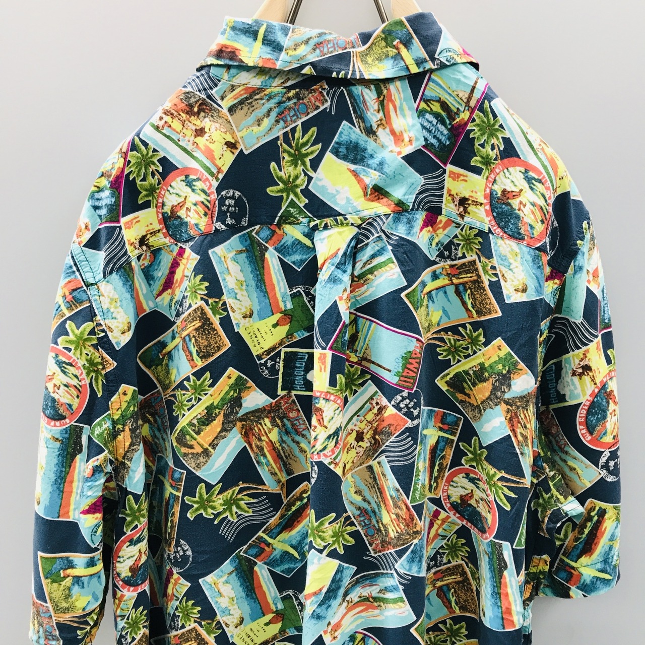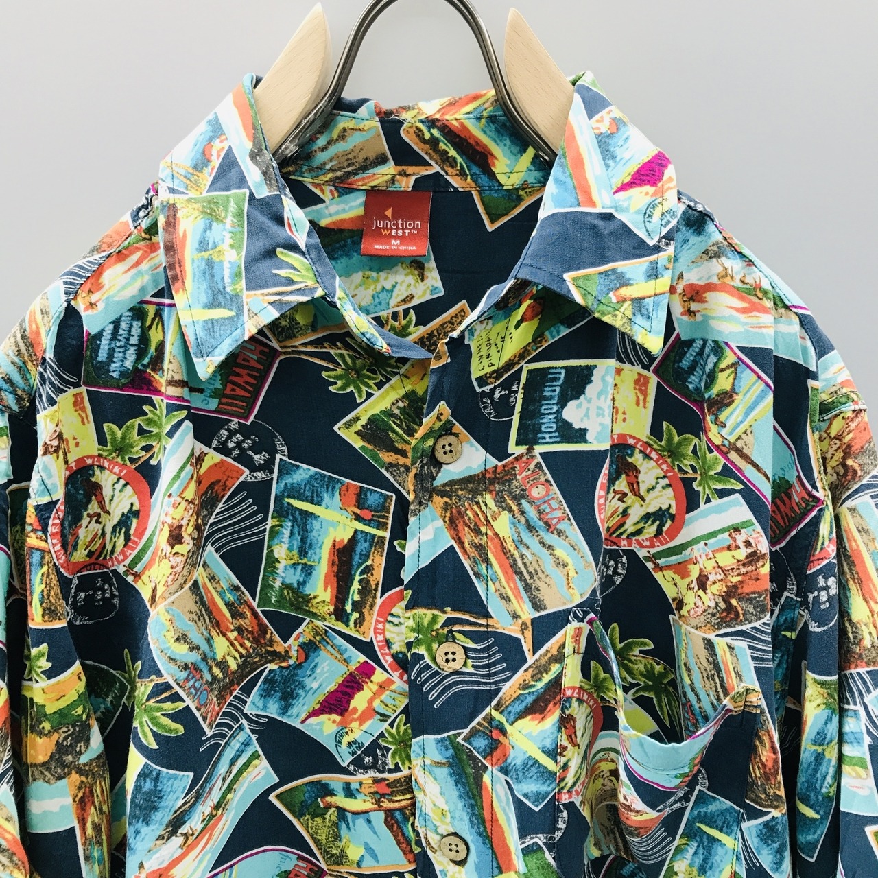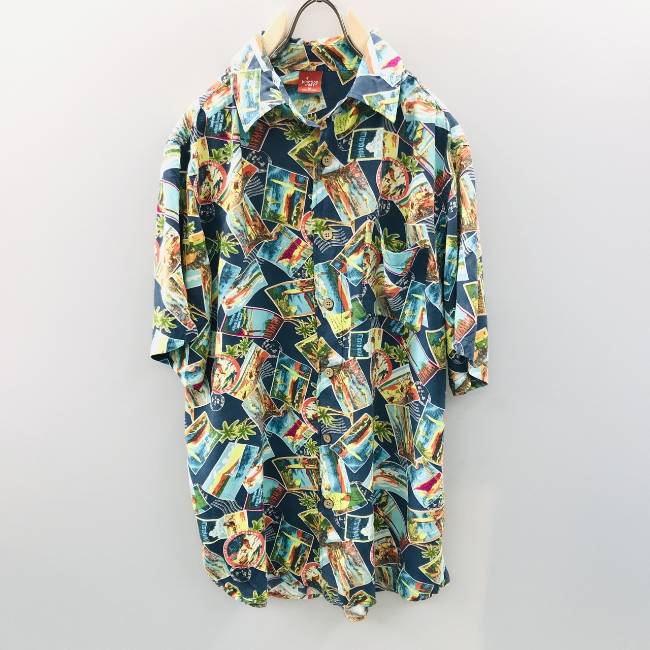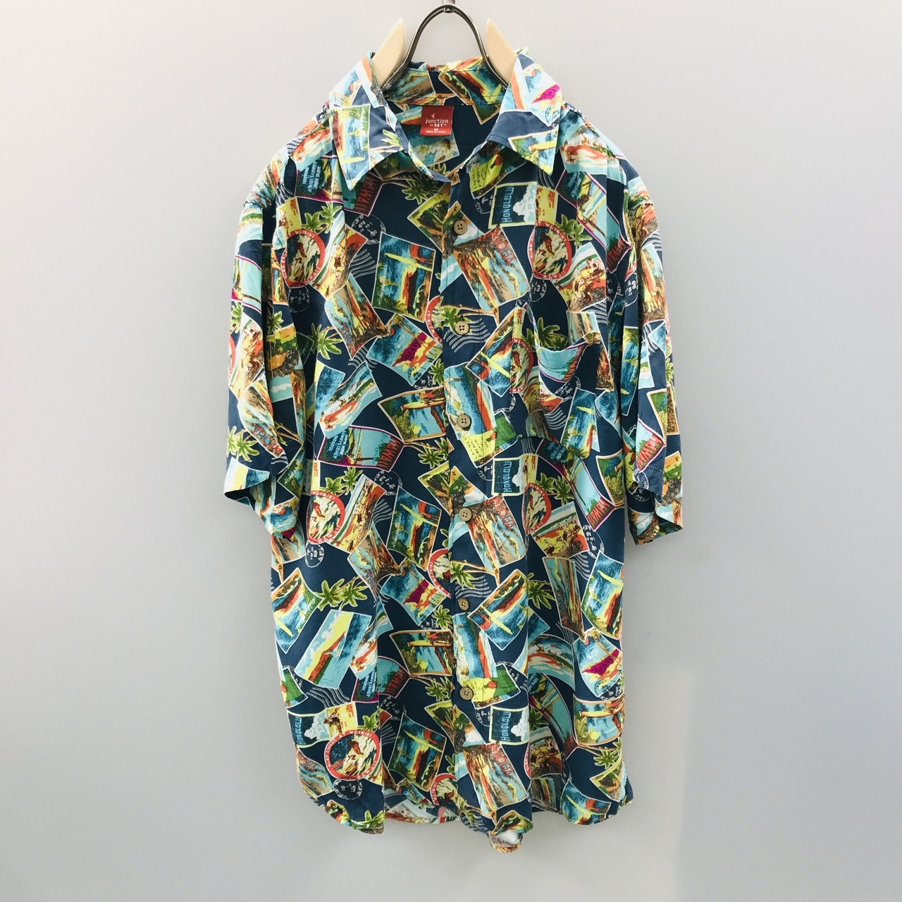 M 90〜00年代 junction west レーヨンハワイアンシャツ アロハシャツ フォトカード、スタンプ柄 アメリカ USA 総柄 半袖