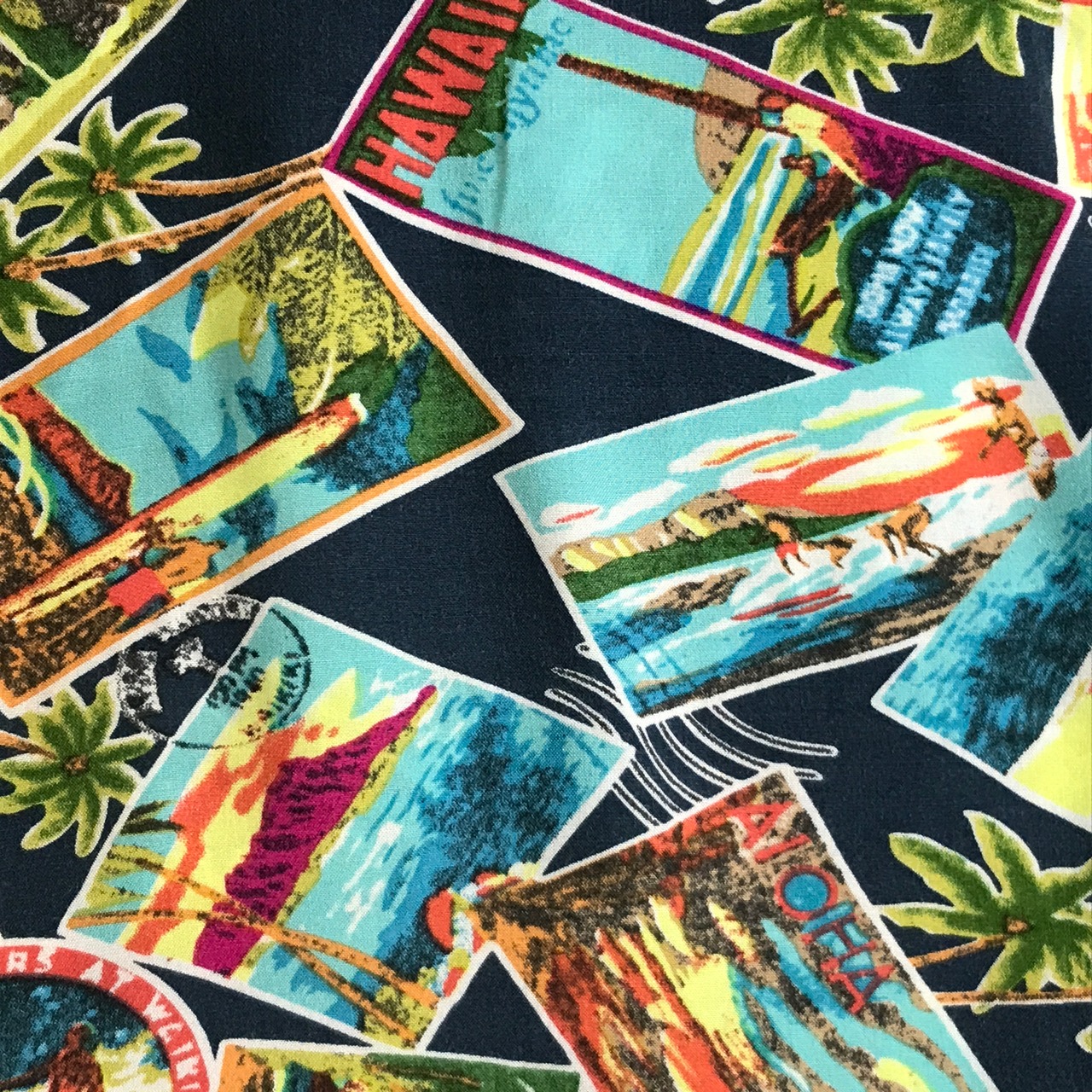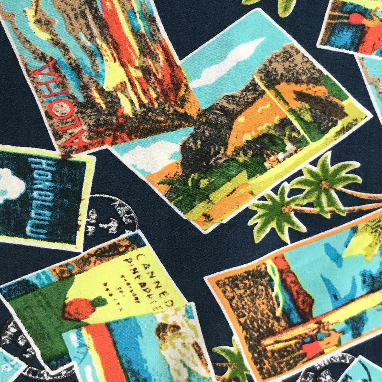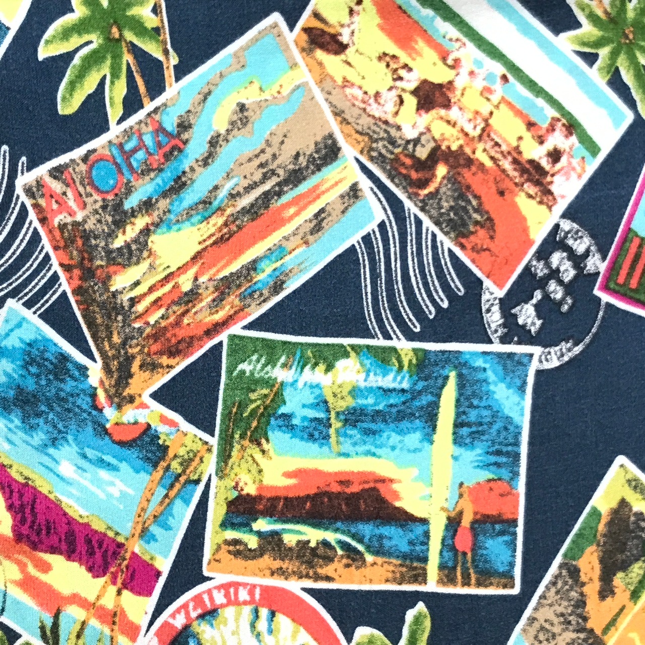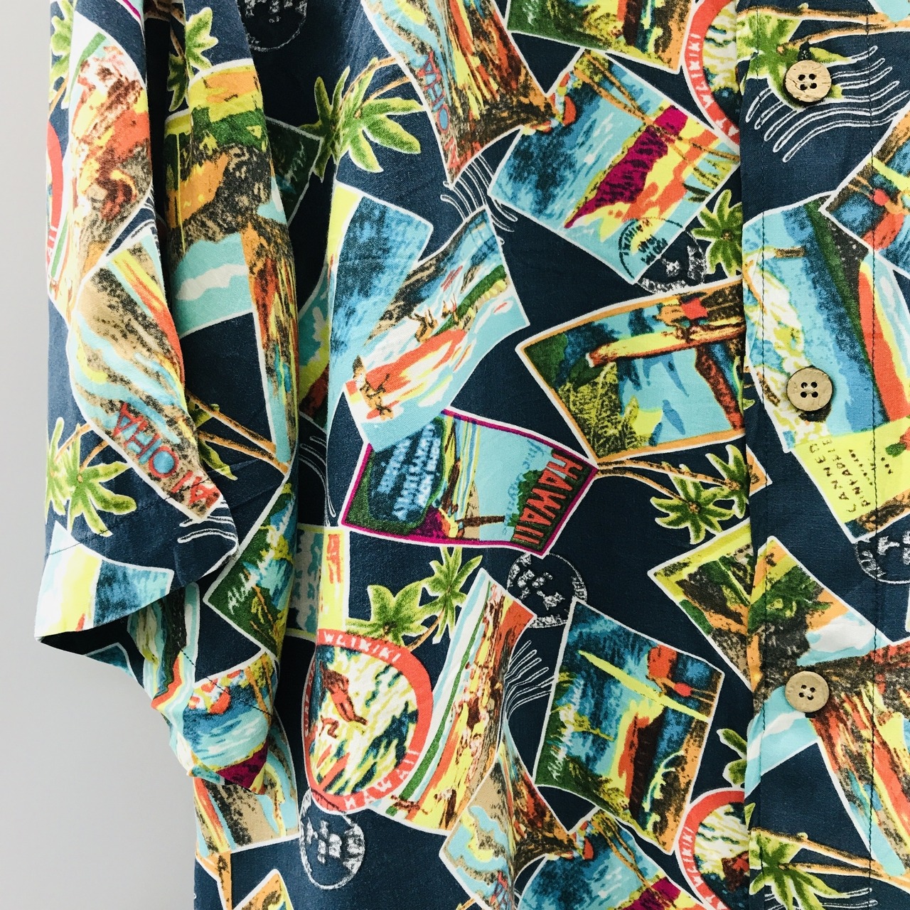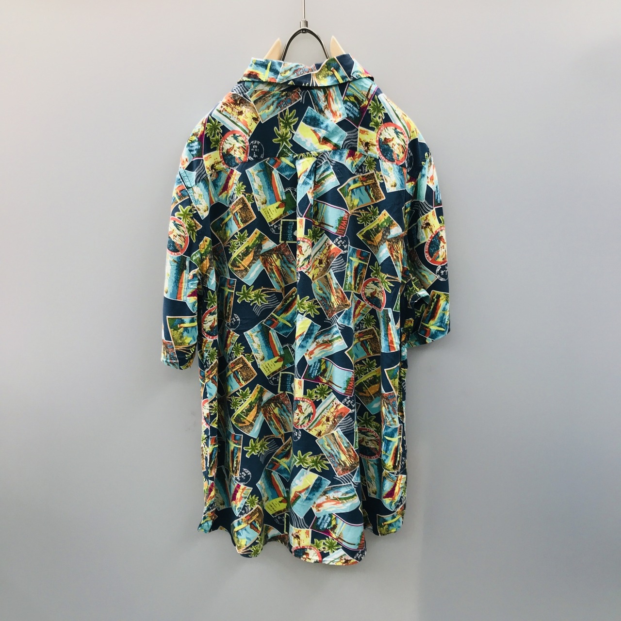 M 90〜00年代 junction west レーヨンハワイアンシャツ アロハシャツ フォトカード、スタンプ柄 アメリカ USA 総柄 半袖