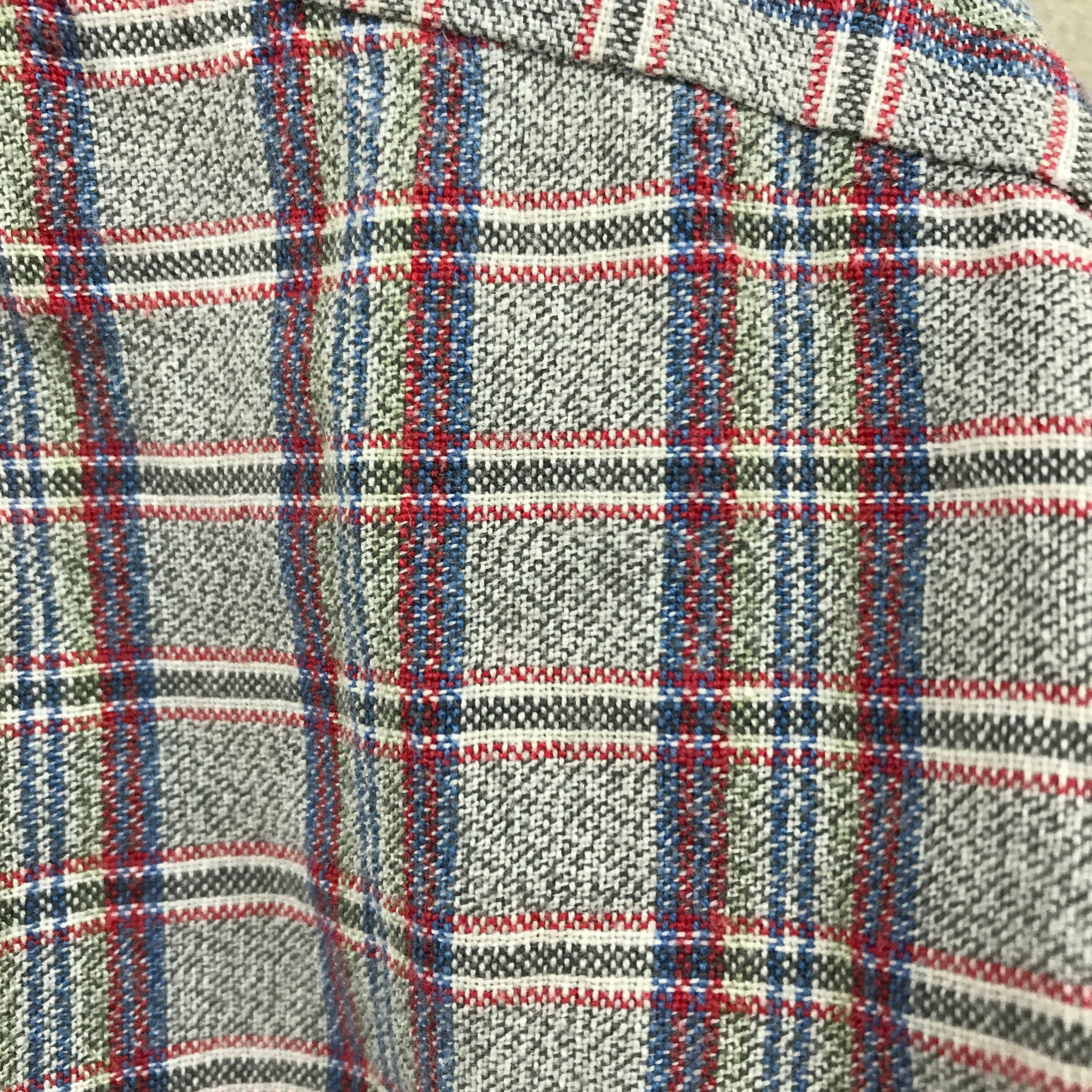 白とカーキの杢生地がグレーに見えてそこにブルー、レッド、ホワイト、グリーンが細かい線となって不思議なチェックが完成されています!