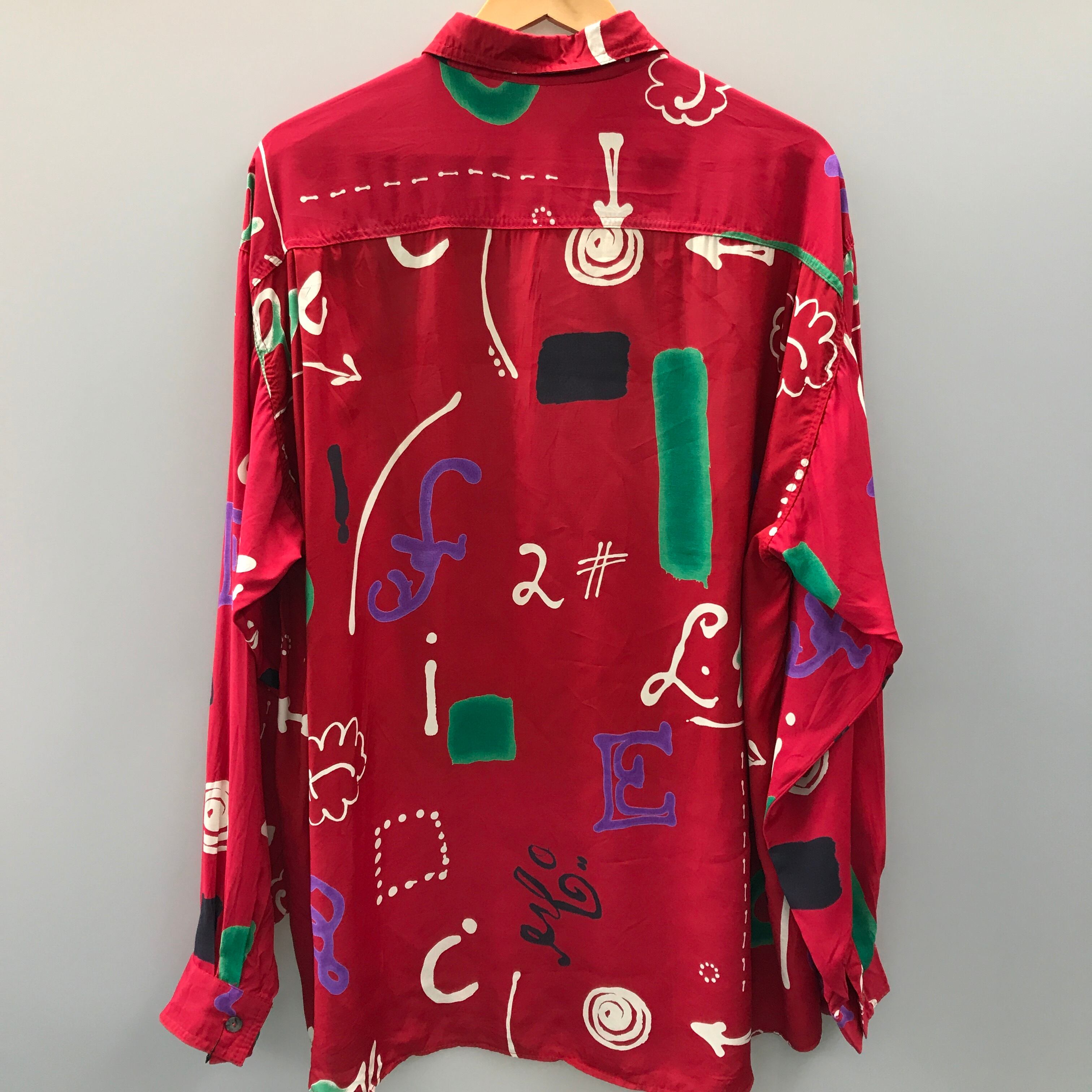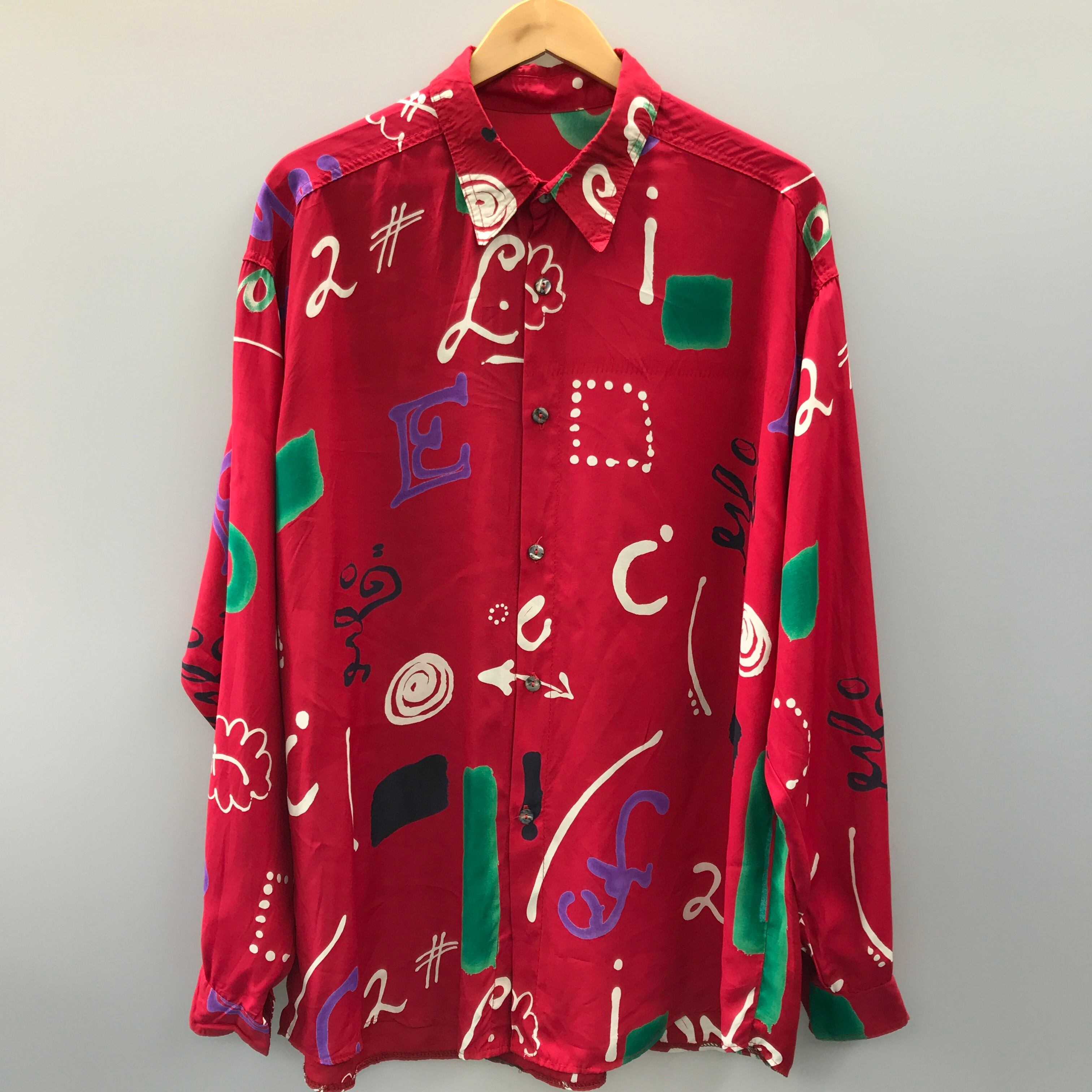 ポップなアルファベット柄のシャツです。ビスコースはレーヨン素材の一種で、最も古い自然素材の合成繊維で、シルクの代わりとしてドレスによく使用されていたほど、光沢や質感に優れている生地です。