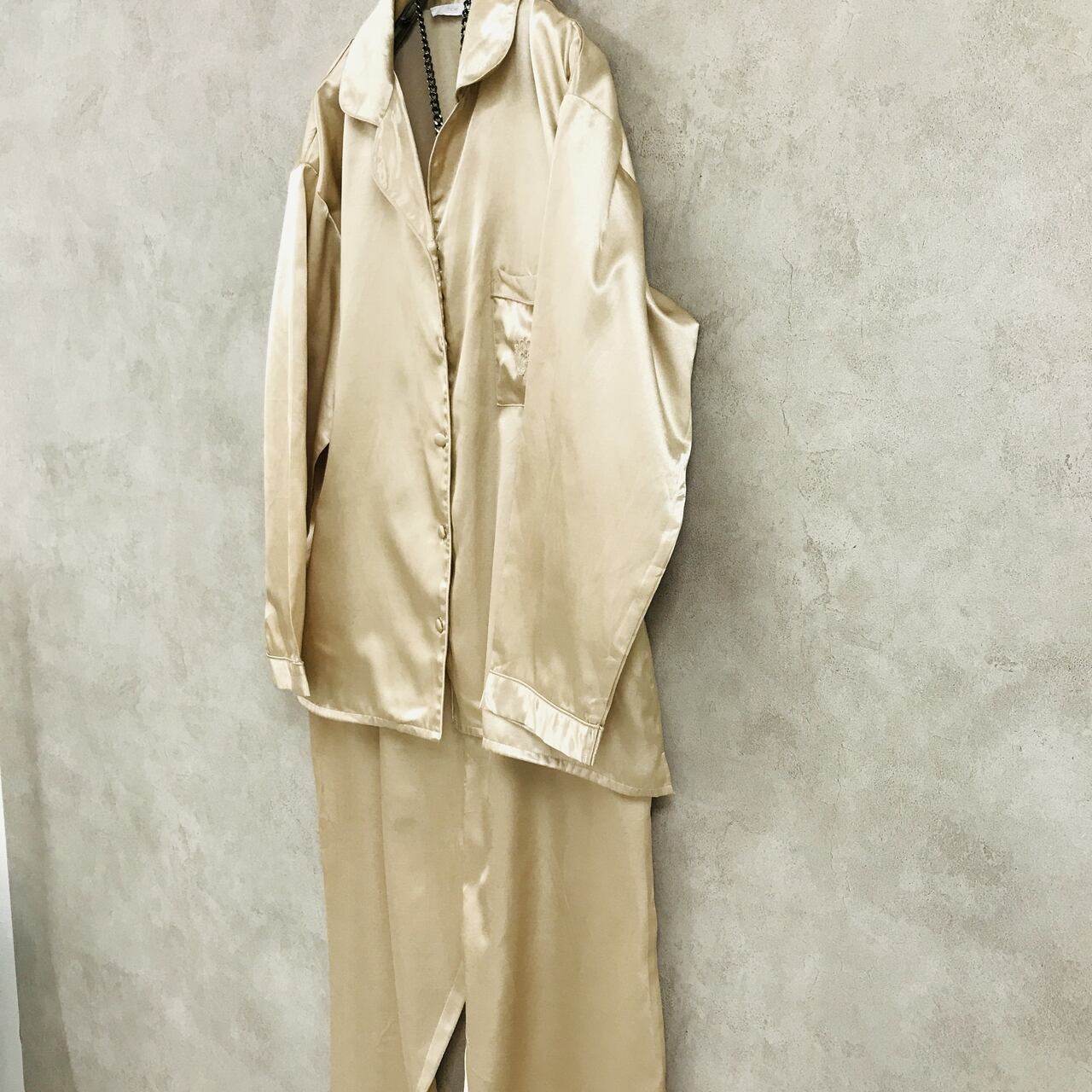 90年代 TCM ユーロヴィンテージ イージーパジャマスーツ パジャマ セットアップ ルームウェア 無地 ベージュ プチ・ゴージャス、ゴールド 42 / 44