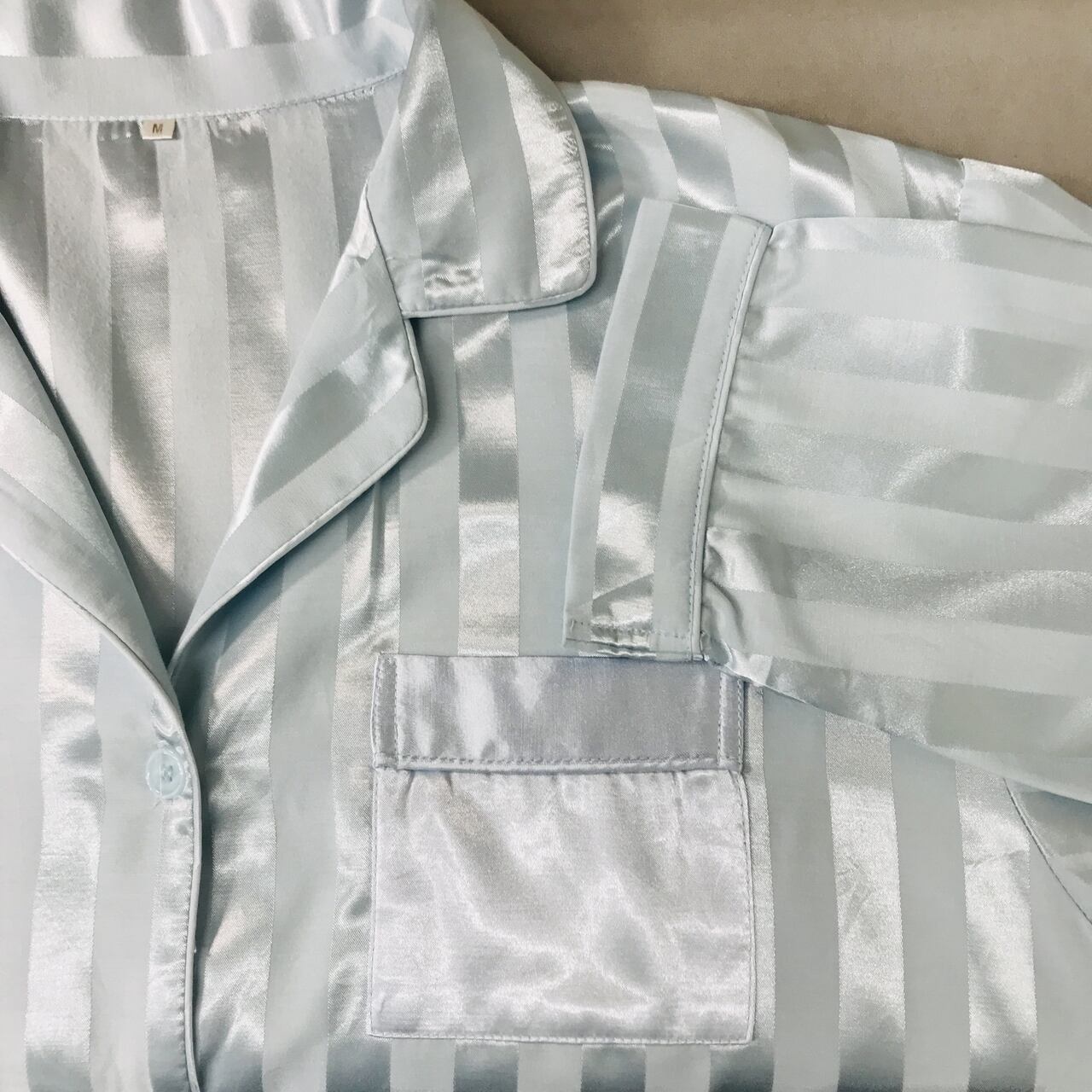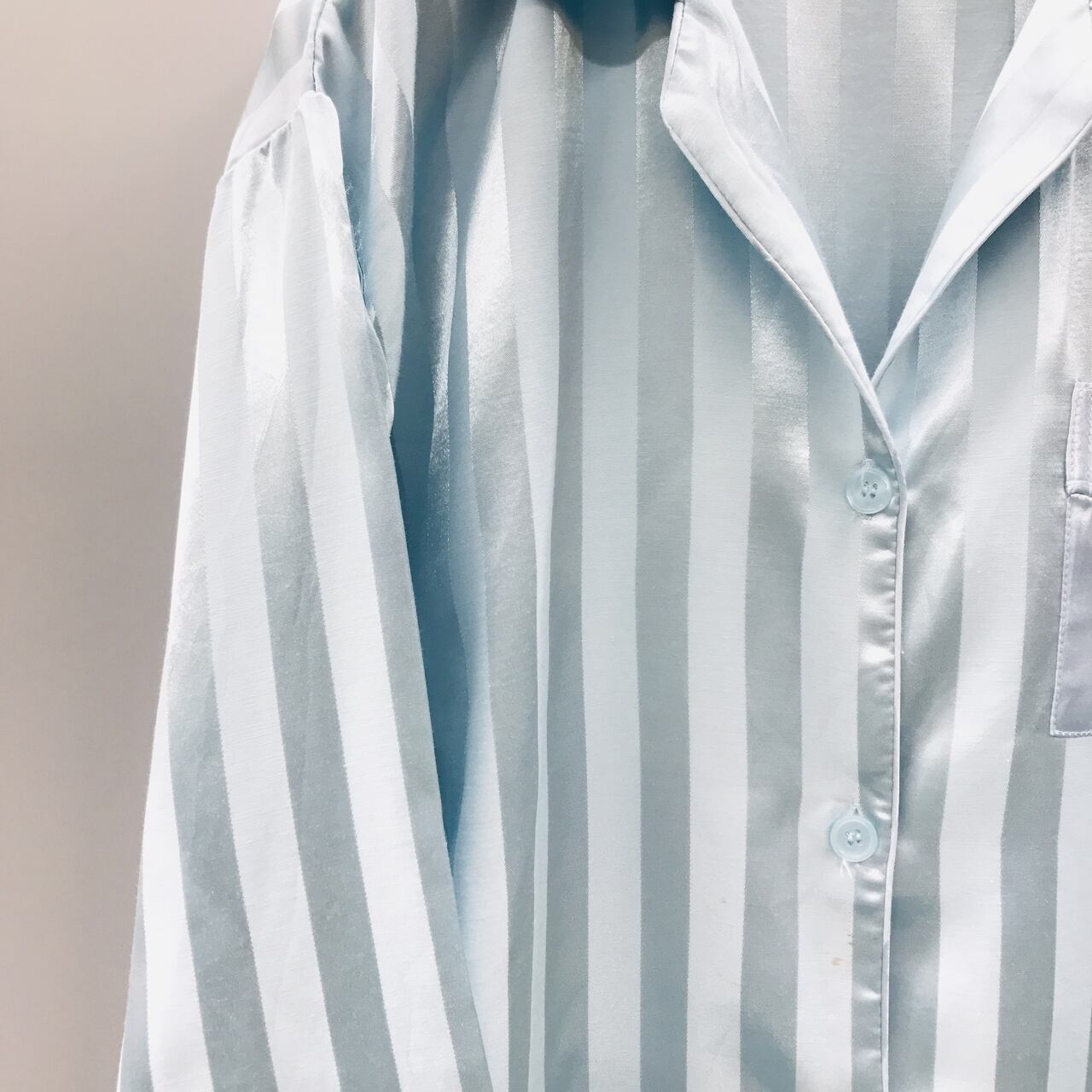 90年代 肌ざわり手触りが良い・ユーロ高級 サテンタイプ リラックス パジャマ ナイトウェア 水色 光沢ストライプ