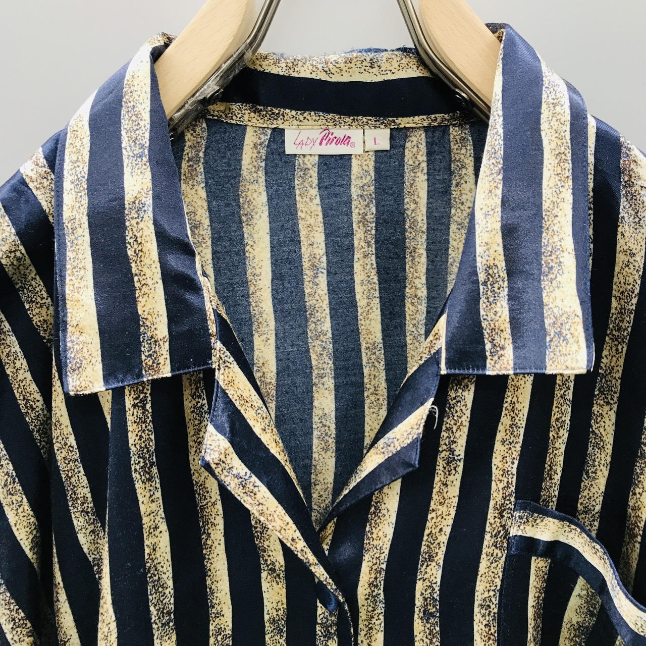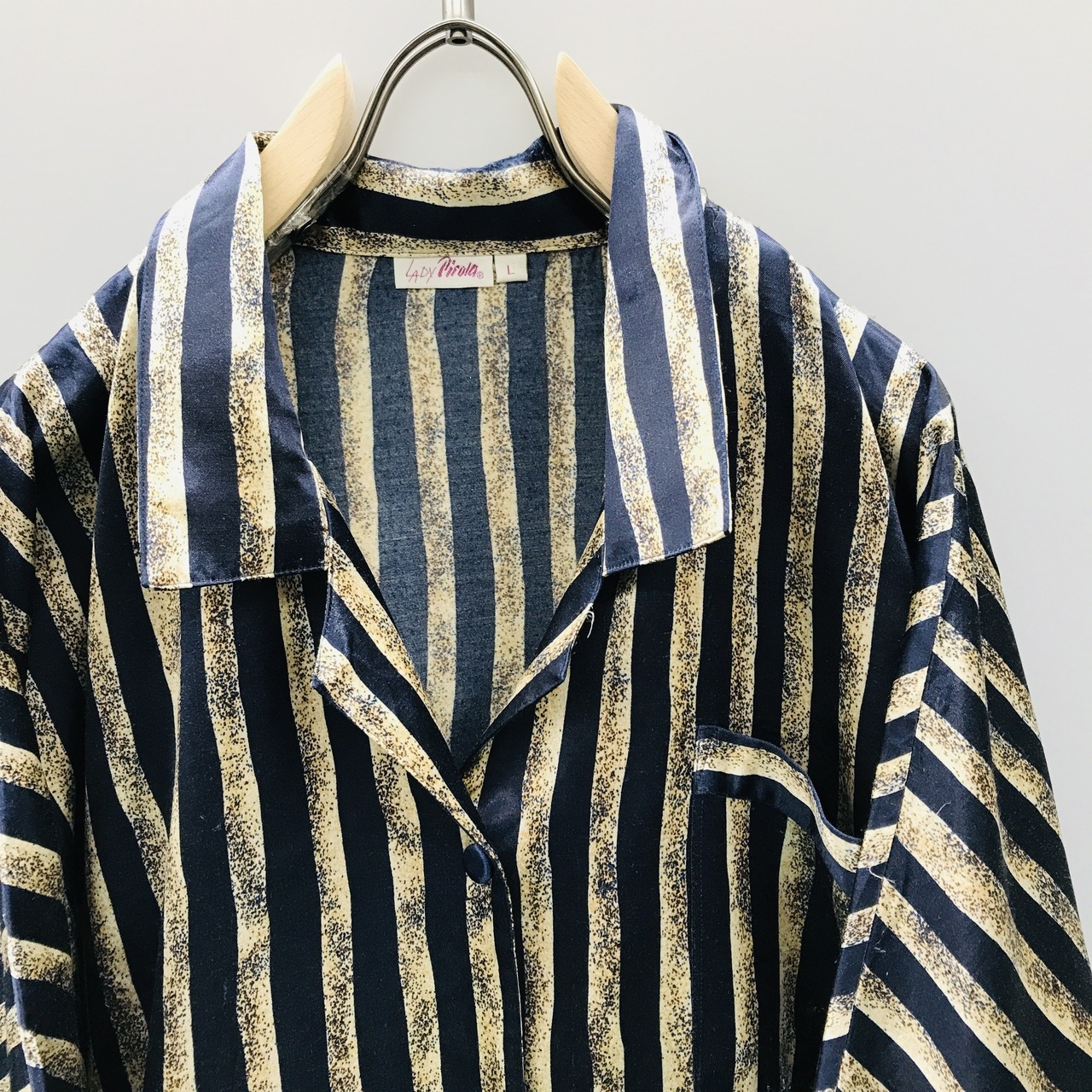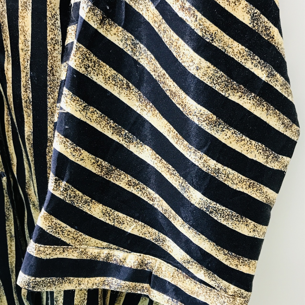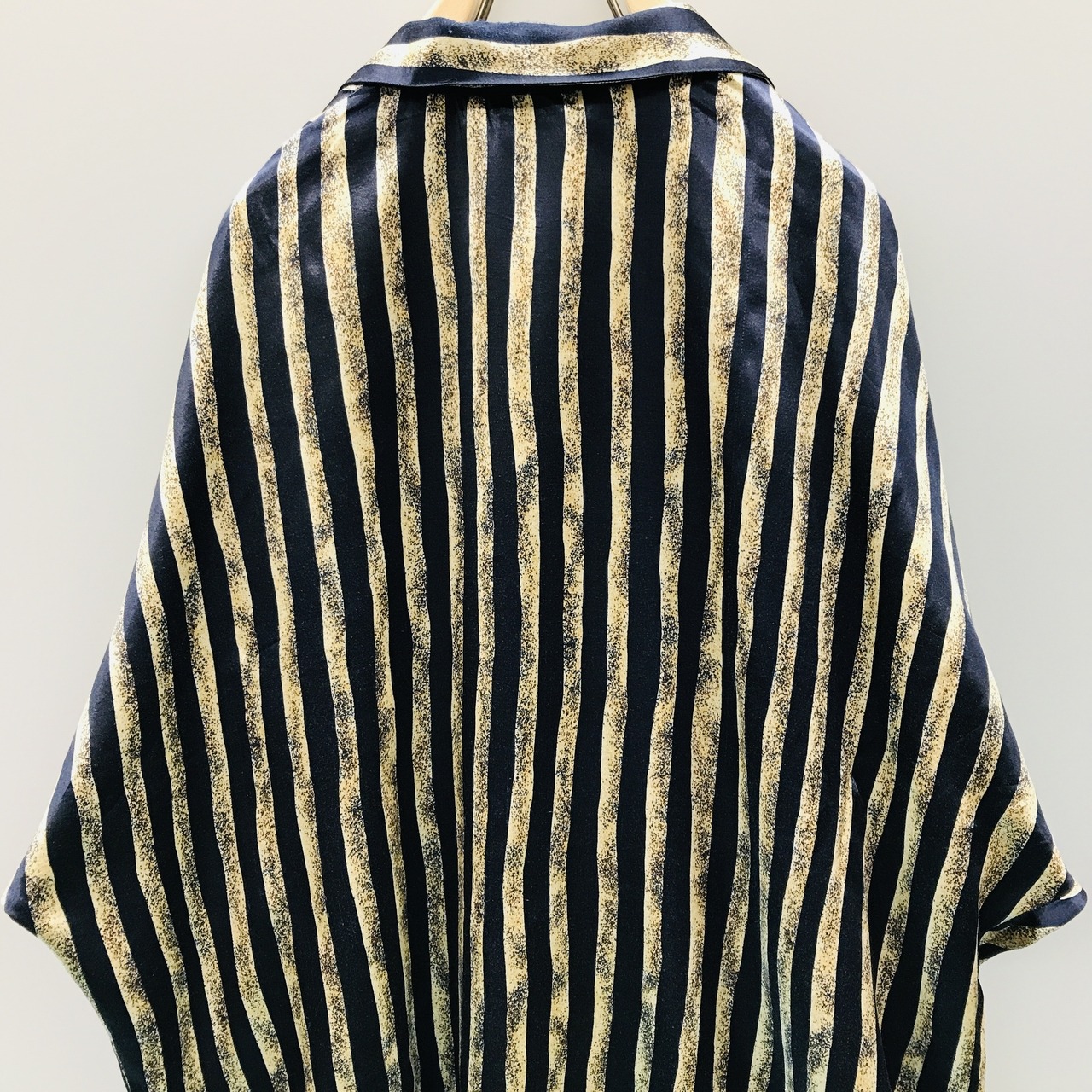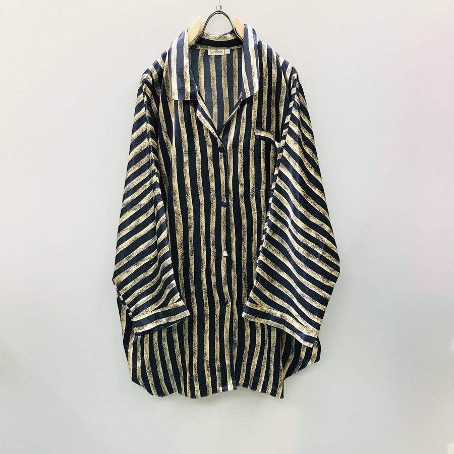 90年代 ユーロ ドイツ高級 サテンタイプシャツ ネイビーにベージュとサンドストーン 光沢ストライプ