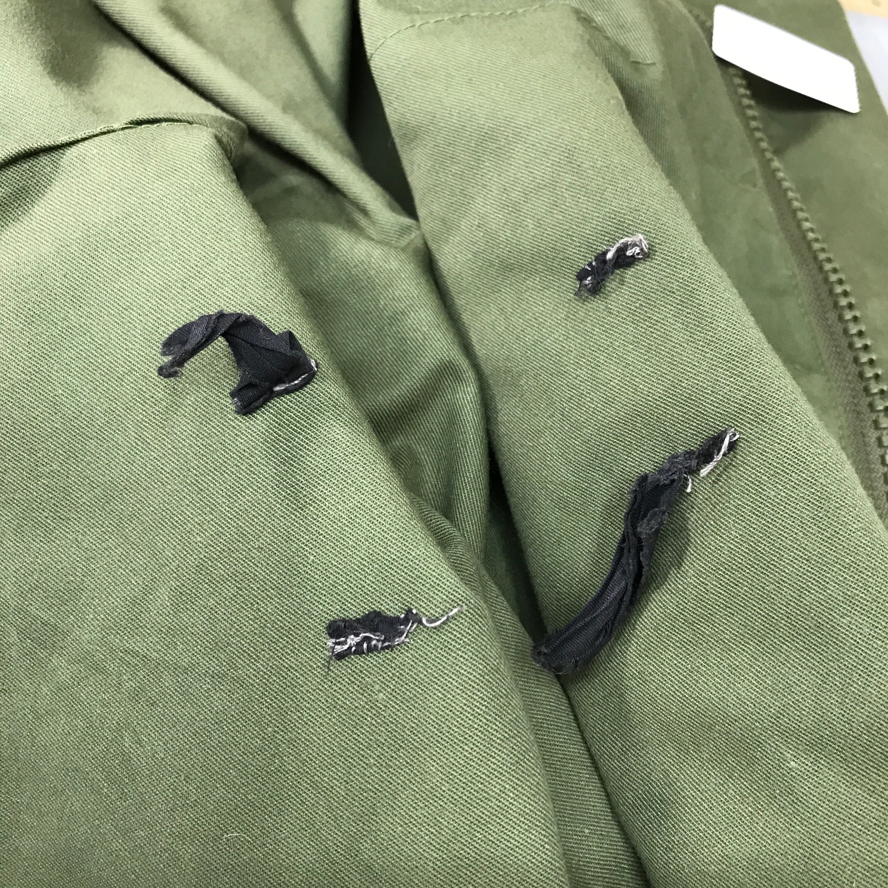 裾ほつれ4か所、サイドと裏地にリペア、ダメージ、ステッチの飛び、